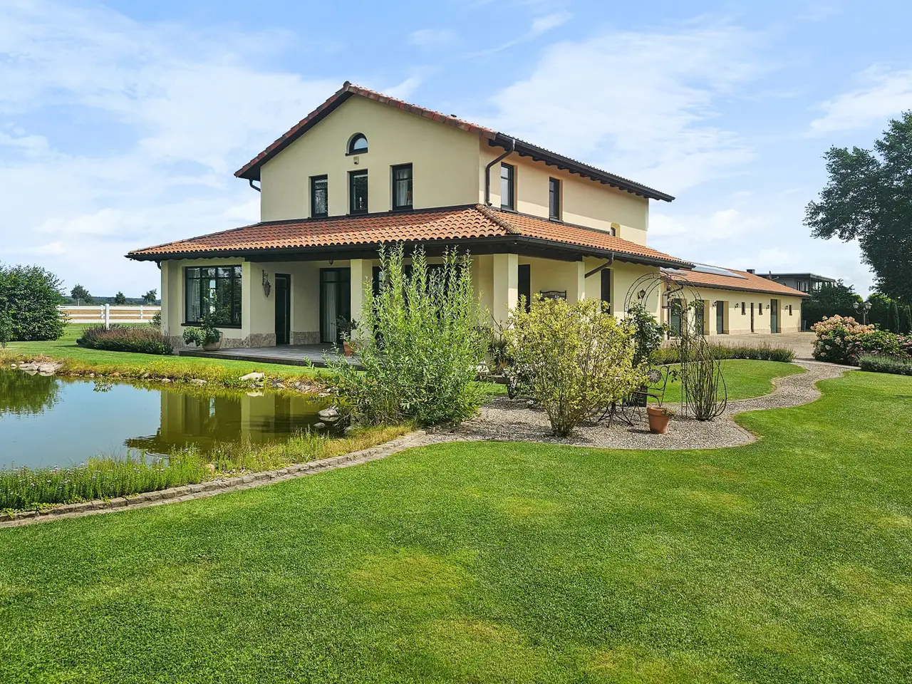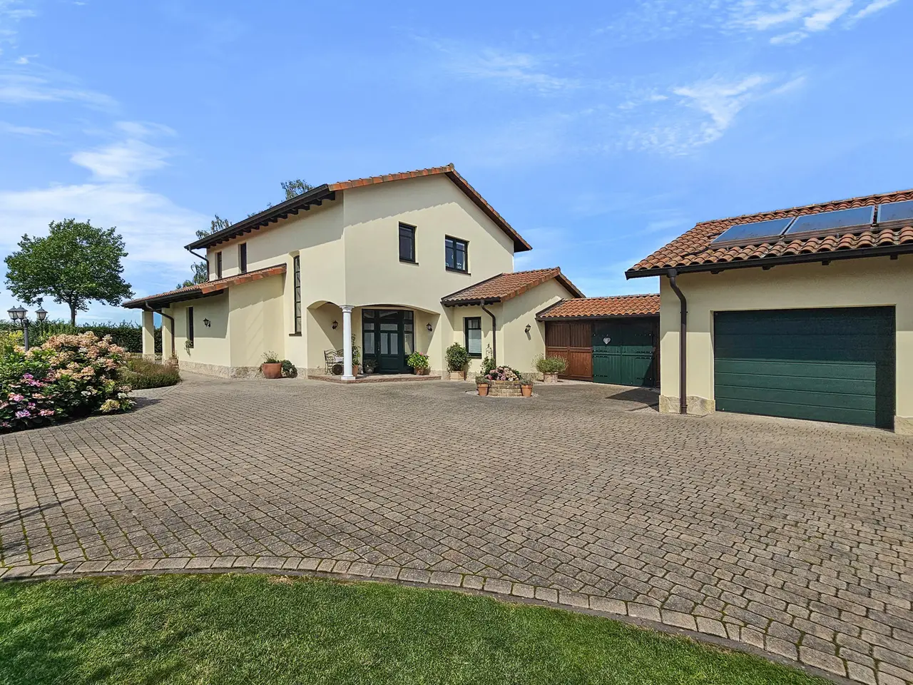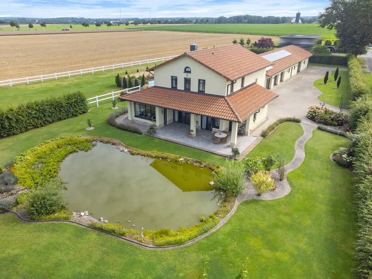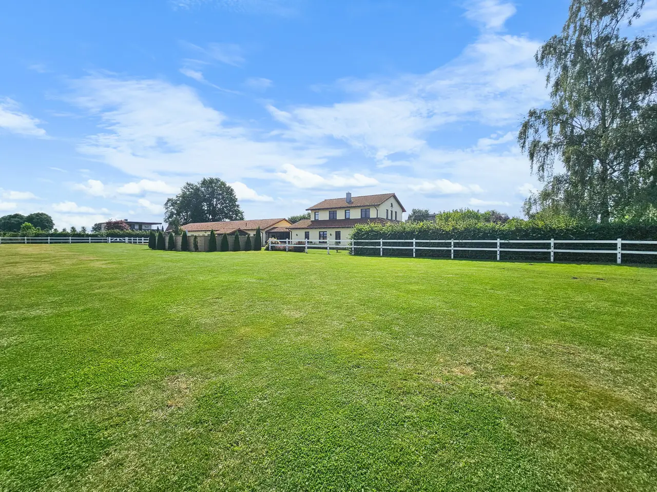 Horse lovers in particular will find their dream home on the approximately 4,711 m² property. In addition to the house newly built in 2015 (approx. 222 m² living space), the completely restored outbuilding (approx. 272 ​​m² usable space) offers plenty of space for hobbies and leisure. A beautiful intermediate building connects the two buildings and elegantly separates the courtyard area from the garden area and the paddock. In addition to three garages and a horse stable, there is also a workshop and a shed. Plans are already in place to convert the outbuilding into residential or commercial space, so that several generations could also live together. The entire property is stylish and built with great attention to detail and blends wonderfully into the surroundings. High hedges and two forged electric gates ensure pleasant privacy. High-quality furnishings, modern bathrooms, high ceilings and a bright, friendly living atmosphere ensure comprehensive living comfort in your own four walls. While the open-plan living and dining area invites you to spend cozy hours by the luxurious fireplace, especially in the winter months, the outdoor area, lovingly designed by the landscape architect, invites friends and family to spend magical evenings outdoors. The southwest-facing covered terrace, the secluded pool deck (consisting of a heated pool and whirlpool), the pond and the grill house are worth highlighting. The latter, with its integrated kitchenette and clay wood oven, will make the hearts of cooking enthusiasts beat faster. The approximately 1,750 m² paddock is enclosed with a weatherproof plastic fence and has access from the street and the yard. In combination with the stable and a separate sand paddock, horse lovers will get their money's worth here. Car lovers will not be left out either. The 3-car garage is high-quality tiled and heated. In addition, a screen and a projector are installed here, so that this room can also be used easily and conveniently for an evening with friends. The last room of the high-quality outbuilding is equipped with a large sectional door and is currently used as a workshop. Alternatively, a boat or a carriage can be stored here in a dry and safe place. The roof of the outbuilding is equipped with a 7.6 kWp PV system, so that a later conversion of the heating technology to a heat pump or hybrid heating is easily feasible and prepared. The house itself has five rooms, three bathrooms and a high-quality country kitchen with a cooking island. The current layout is ideal for a family of three to four. In addition to the living and dining area and the two bedrooms in the attic, there is another room on each living level. These two rooms can be used as children's rooms, work rooms, guest rooms or dressing rooms, depending on your needs and living situation. As mentioned at the beginning, parts of the outbuilding could be extended in coordination with the authorities and converted into another residential unit. Detailed features and technical data can be found in the separate equipment description. The property is located in the Lower Saxony town of Bassum (Hollwedel district) in the Diepholz district. Doctors, educational institutions and shops are easily accessible by car. The private school "LUKAS School" is less than 10 minutes away by car. The seminar and conference center "Die Freudenburg" is well-known and popular throughout the region. Located a little off the beaten track, it allows for relaxed working in a special atmosphere. Bassum offers a wide range of sports and leisure activities for young and old. In addition to a wide range of sports at TSV Bassum, depending on the season, you can visit the indoor or outdoor swimming pool, the "Petermoor" zoo, the Utkiek or the local go-kart track. There is also a tennis and riding club, a shooting range and several fitness studios. The town of Bassum (approx. 16,000 inhabitants) is part of the "Wildeshauser Geest" nature park and is located about 25 km south of Bremen. Due to its good infrastructure, Bassum is an ideal place to live for commuters. From the local train station, Bremen city center can be reached in less than 30 minutes. Located at the junction of federal highways 51 and 61 as well as various country roads (with a connection to the A1), there are also very good transport connections by car towards Bremen, Osnabrück and Hanover.