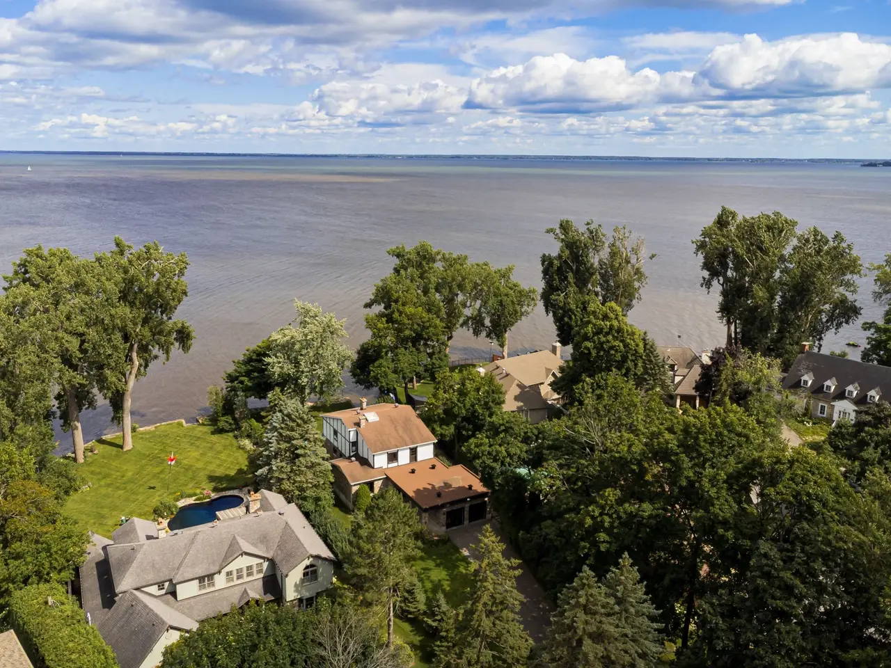 Design your dream home on this prestigious waterfront property on the iconic Thompson Point. Situated in the highly sought-after Thompson Point, this elegant executive cottage boasts over 6,500 square feet of living space on an impressive 24,670 square foot waterfront lot, offering 95 feet of frontage along the picturesque shores of Lake Saint-Louis.