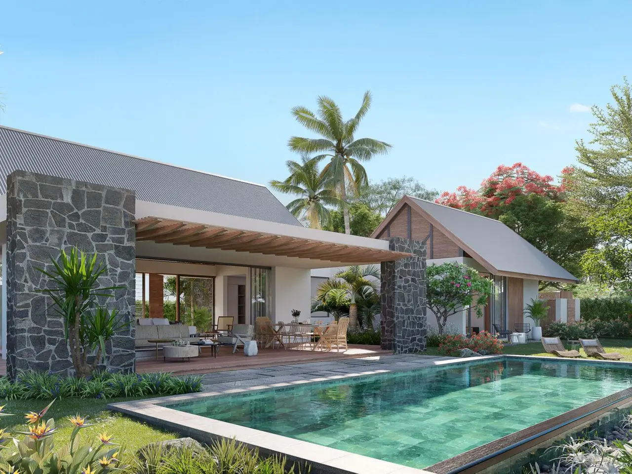 Located in the residential neighborhood of L’Écho des Champs in Anahita Beau Champ, Villa Demera 4 embodies the essence of modern Mauritian living—comfortable, sustainable, and thoughtfully designed. With seamless transitions between indoor and outdoor spaces, this villa invites you to embrace an open, harmonious tropical lifestyle, immersed in nature. A Design Inspired by Climate and Landscape Designed with a bioclimatic approach, Villa Demera 4 prioritizes: An open architecture with expansive glass doors and covered outdoor spaces Natural materials such as volcanic stone, wood, and thatch, blending effortlessly into the surroundings Optimal positioning on the plot to maximize natural ventilation and sunlight throughout the day The villa opens onto a private garden and pool, creating an intimate green oasis perfect for relaxation and shared moments with family and friends. Spacious, Functional Living Areas Villa Demera 4 features: A bright living room extending to a covered terrace with a dining area and lounge space An open, practical, and convivial kitchen 3 to 4 spacious bedrooms with en-suite bathrooms, ensuring comfort and privacy A landscaped garden with a pool and relaxation area The layout is designed for effortless flow and a living experience deeply connected to nature, all in a simple yet refined manner. Part of a Sustainable, Vibrant Community Villa Demera 4 is an integral part of the Anahita Beau Champ development—a domain that blends innovation, agriculture, wellness, and authenticity: Zeste Café & Deli, coworking spaces, a fitness room, walking and cycling trails Upcoming amenities: schools, a health center, a local market, and an Innovation Park Exclusive access to the Beach & Boat Club Amarela, with shuttle service to Île aux Cerfs Investing in Anahita Beau Champ: A Meaningful Choice Freehold ownership with residency permits for foreign buyers Resale possible on the international market Access to a community committed to sustainable, inclusive, and eco-conscious development A rare opportunity to live in harmony with nature while enjoying modern comforts Villa Demera 4 is the perfect expression of contemporary tropical living—connected, refined, and at the heart of one of Mauritius’ most innovative projects.