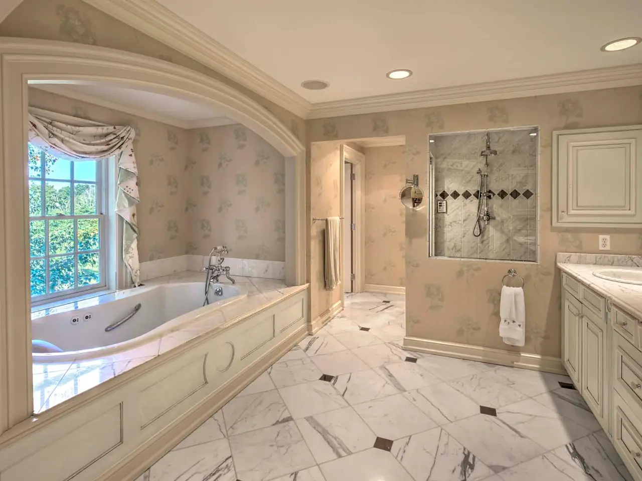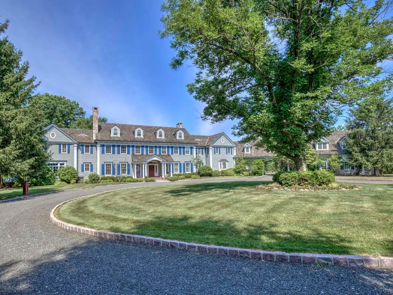 Exquisitely-Detailed Colonial Revival Estate on 43± Acres in Bedminster Set on 43± open, rolling acres in Bedminster Hunt Country, an exceptional gated Colonial Revival estate with equestrian facilities is set along one of the township's most desirable lanes. Featured in NJ Design magazine, the sophisticated interiors create a relaxed ambiance characterized by rich colors and remarkable millwork. The expansive seven-bedroom, eight full bath and two half-bath main residence is enriched by a three-stall horse barn featuring an attached three-car garage with a two-bedroom apartment above and an adjacent bonus room with kitchenette and full bath. Outside the main house, a generous patio and dual-covered side porches overlook sublime views of the acreage, while a pool tucked beyond a charming arbor and white picket fencing is lushly landscaped. Set far back from the road at the end of the long drive, this gracious property provides absolute privacy. Classic design elements within the layout include seven intricately mantled fireplaces, oak wood floors, arched doorways, traditional moldings and woodwork, stunning architectural details, unique built-ins, custom-painted rooms, exposed ceiling beams, two wet bars, a rear staircase and covered porte-cochère access to the home's three-car garage. Hiland Hall Turner Architects oriented the residence on the acreage to take advantage of morning sunlight in the front rooms and colorful sunsets in rear-facing spaces. A grandly styled layout invites epic entertaining as well as quiet times inspired by natural beauty viewed from numerous glass doors and oversized windows. A vestibule entry leads to the front-to-back foyer fitted with painted oak floors, a curving staircase and sightlines into some of the principal rooms. These include a formal living room anchored by an ornately mantled fireplace, a wood-paneled library featuring a fireplace and a connecting mahogany wet bar, and a dining room designed with built-in china cabinets, a fireplace, windowed seating niche and hand-painted wallpaper. An expansive fireside game room is finished in artful trim throughout. Nearby is a home office and formal powder room. The epicurean kitchen presents a center island with a prep sink, Franke farmhouse sink, custom cabinetry and a sun-splashed dining area with a domed ceiling featuring a hand-painted cloud mural. A collection of high-end appliances includes a Viking range, Sub-Zero refrigerator, Bosch dishwasher and wine refrigerator. Adjacent to the kitchen is a secondary office space and a butler?s pantry. The floor plan continues into a great room set under towering vaulted ceilings accented by reclaimed wood beams. Natural light spills into this space from fixed upper windows and French doors to the porch, while a floor-to-ceiling stone fireplace is a handsome focal point. This part of the home is completed by a mud room with storage options, informal powder room, staircase to the finished lower level, secondary stairs to the bedroom level, and access to the porte-cochère and garage. Upstairs, a captivating window seat in the landing overlooks tranquil grounds. A primary suite begins in the vaulted ceiling bedroom featuring a fireplace, sitting area, built-ins and access to the extra-large primary balcony. An oversized dressing room with wardrobe organizers and two walk-in closets provide ample storage. The spa-like primary bath has a heated floor and includes a jetted soaking tub, separate water closet with a toilet and bidet, an oversized shower and double vanity. Four additional en suite bedrooms each connect to a full, private bath, and a laundry room is a smart addition. Over the garage, a finished guest area contains a kitchenette, large bedroom, full bath and amazing countryside views. The third level was renovated in 2020 and offers a bedroom, full bath, sitting area and roomy cedar closet. The walkout lower level is accessible by stairs in both the entrance foyer and mud room area. Of special note is the Tuscany-inspired wine cellar which is temperature-controlled and provides storage for over 1,500 bottles. The beamed-ceiling tasting room has a gas fireplace, terra cotta floors and a wrought iron chandelier. This level also has a home theater/media room with a wet bar, refrigerator and popcorn machine; a huge playroom; a home gym with glass doors to the yard; a full bath; infrared sauna and mechanical systems including a whole-house generator. A detached three-car garage is designed with an adjacent horse barn offering three beautifully finished stalls, a kitchen, bath, storage room and access to a turn-out field. The barn's second level has a two-bedroom apartment and a separate bonus room, ideal for guests or staff. Originally built in 2000 and thoughtfully updated through the years, this architecturally-nuanced residence is finished in whitewashed brick, gray clapboard and a cedar shake roof. Its Bedminster location in Somerset County is celebrated for open green spaces, winding country roads and legendary estates, yet is only about an hour from Manhattan and approximately 45 minutes from Newark Liberty International Airport.