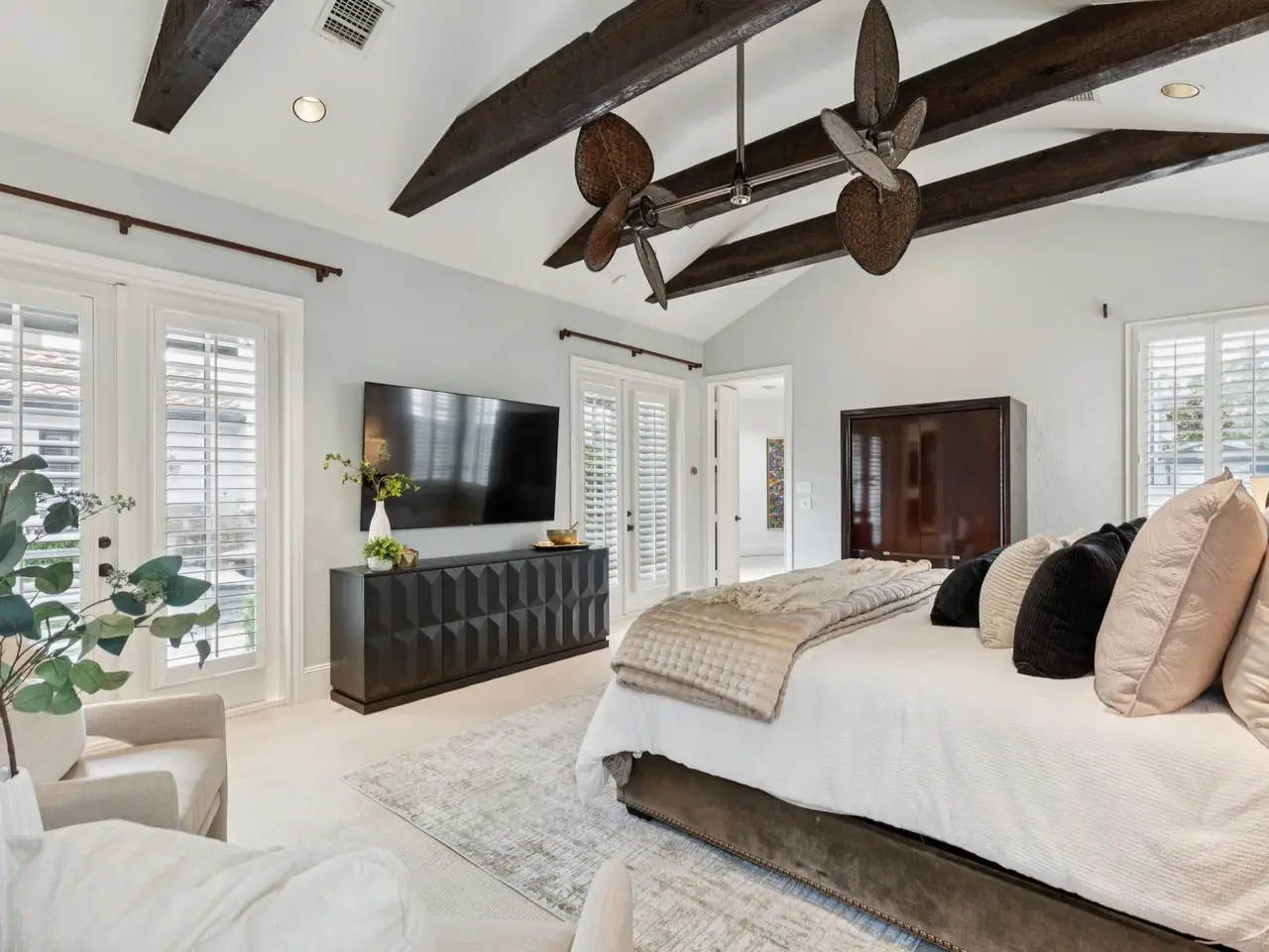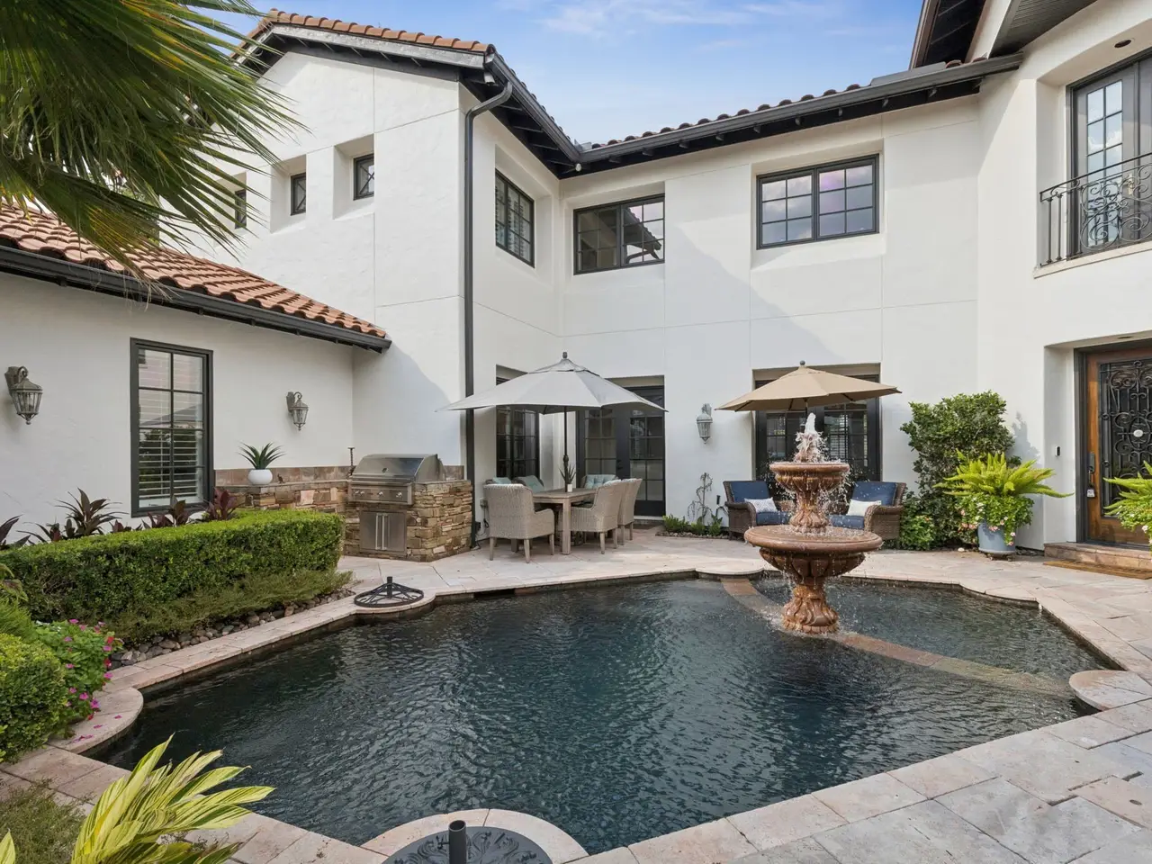 Designed and built in 2001 by acclaimed Richard Price, this home won GHBA 2003 award for design. Front, private courtyard with pool, fountain and spa wraps around the home and features a new outdoor kitchen. Stylish double height foyer welcomes you w/ designer lighting. Country style kitchen with Thermador appliances with seamless flow into family room. Water osmosis system. Private Primary Bedroom with spa style bathroom and generous closets. Sumptuous dining room with attached wine room and butler's pantry and further formal living room. 3 bedrooms up, all with ensuite - and large games room. Outside roomy back yard with new Astro Turf & Tuff Shed (both 2024). Shutters throughout the home, exposed beams, double garage and driveway parking. Outside fully painted (2025). This home is unique and has been beautifully maintained by current owners.