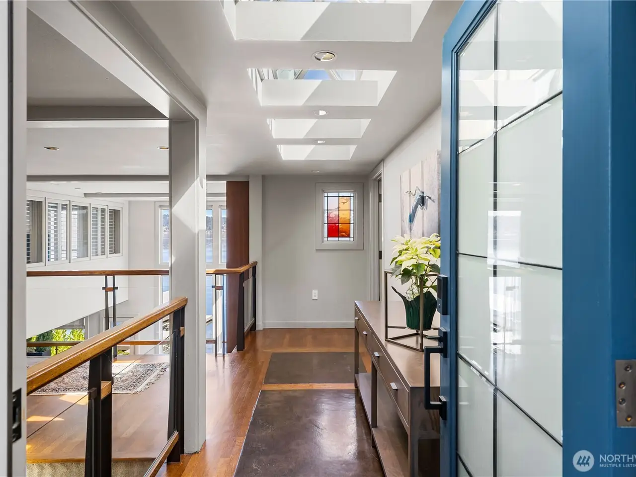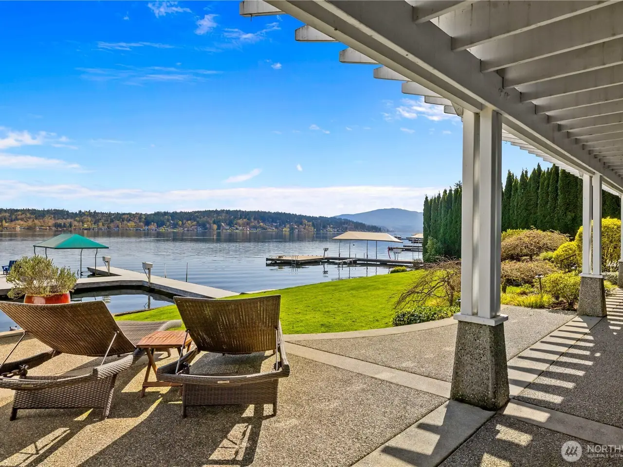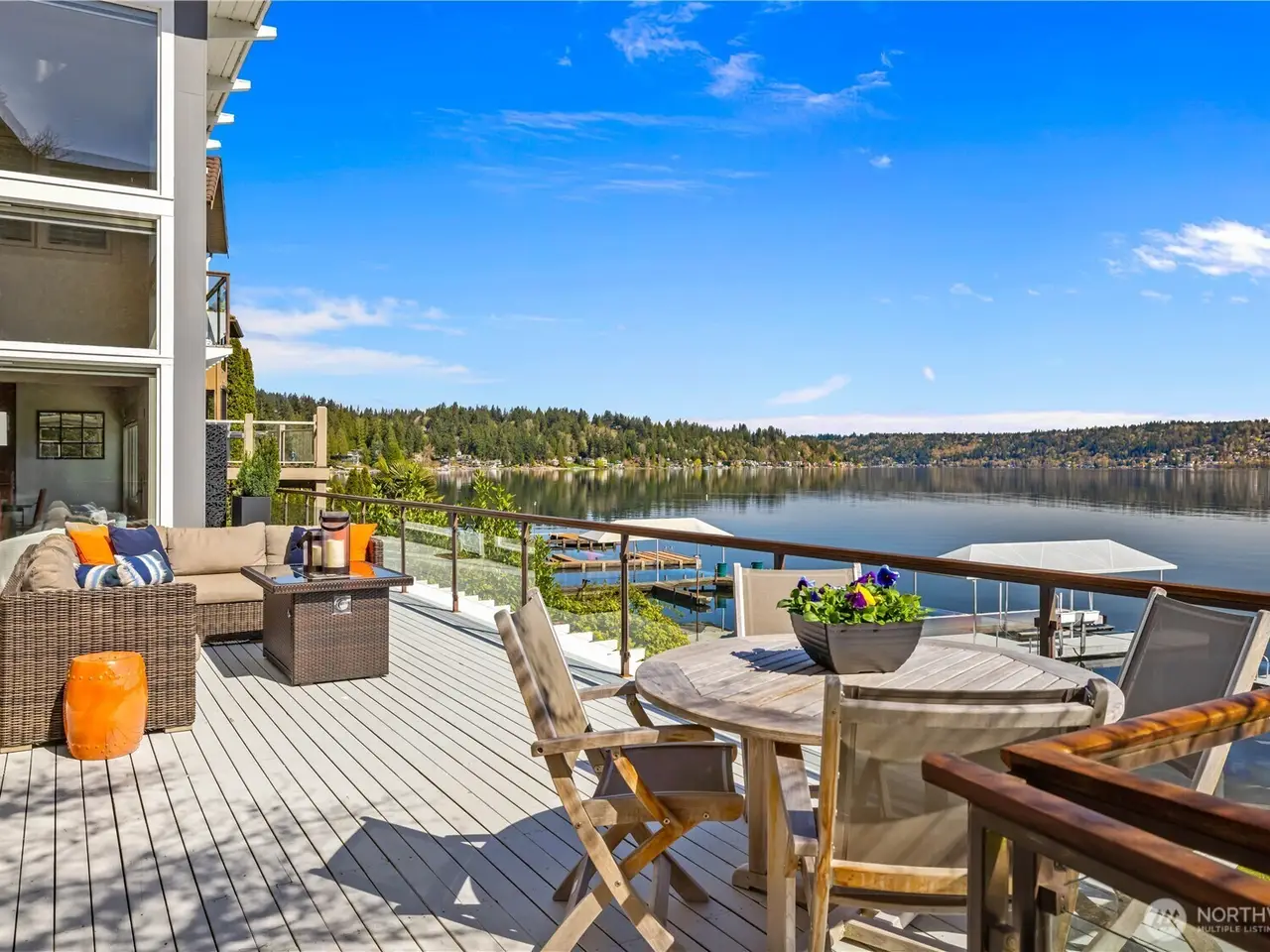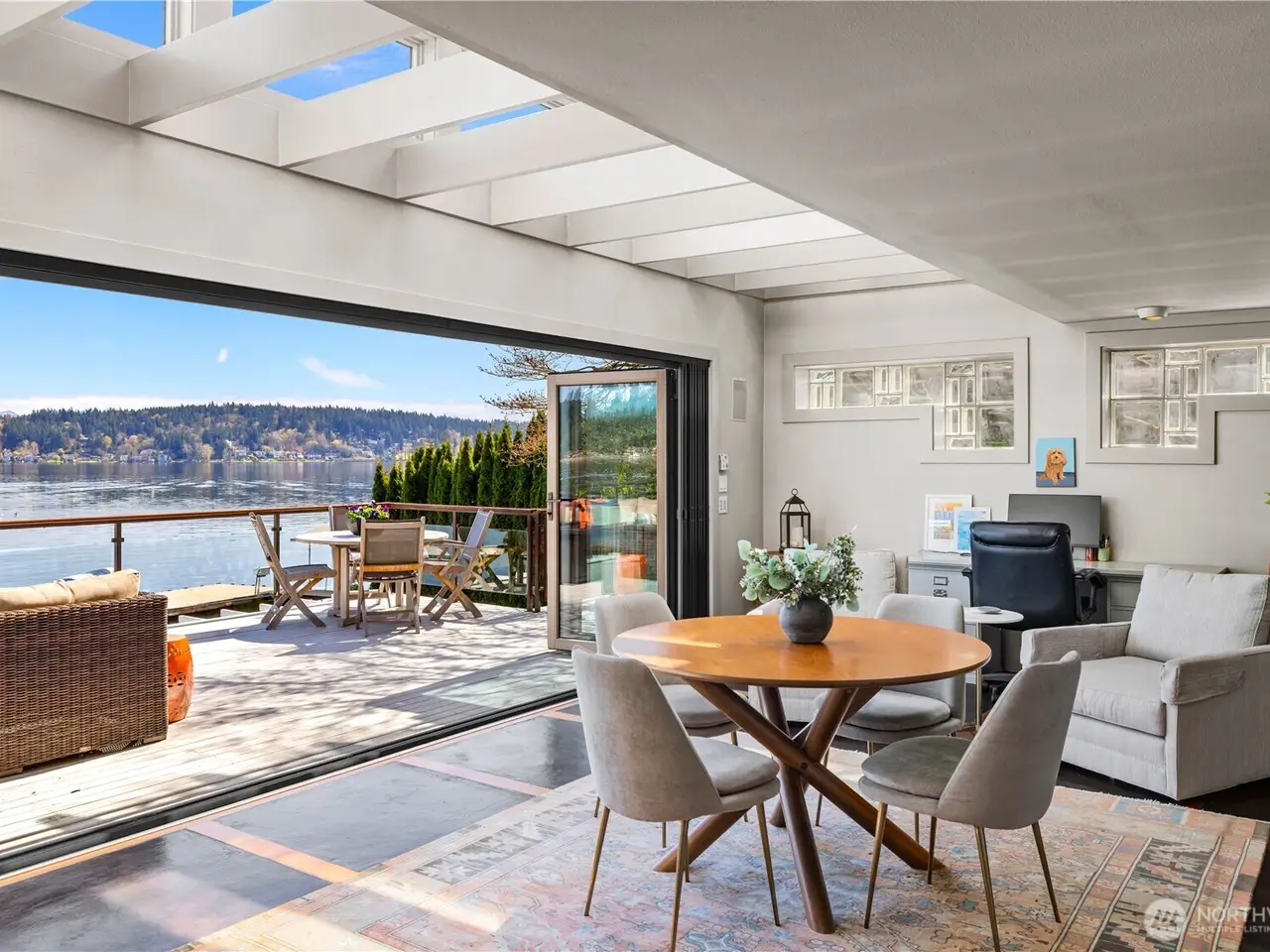 Tucked on a quiet lakeside lane with 90 feet of private Lake Sammamish shoreline, this NW contemporary retreat is a study in light, style, and serenity. Two-story windows and skylights fill the home with natural light, from the great room to the airy sunroom where lake breezes drift through the open NanaWall. Swim off the expansive dock, cast a line in the cove, or retreat to the cozy theater with wet bar. Evenings invite sunset dinners on the full-width deck, followed by a soak in the secluded hot tub tucked amidst lush landscaping. Upstairs, the serene primary suite offers storm-watching solitude and sweeping views. Extensively updated and thoughtfully designed - with rare 8-car parking - this is active waterfront living, beautifully refined.
