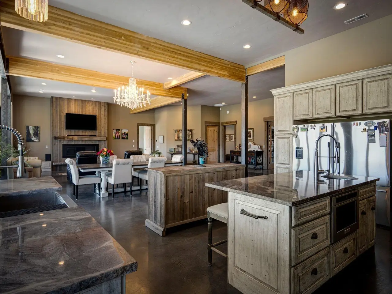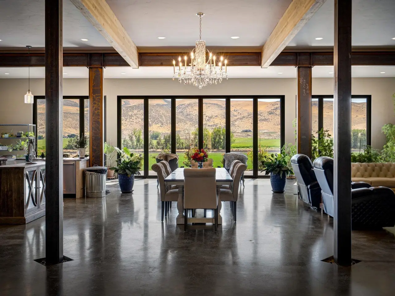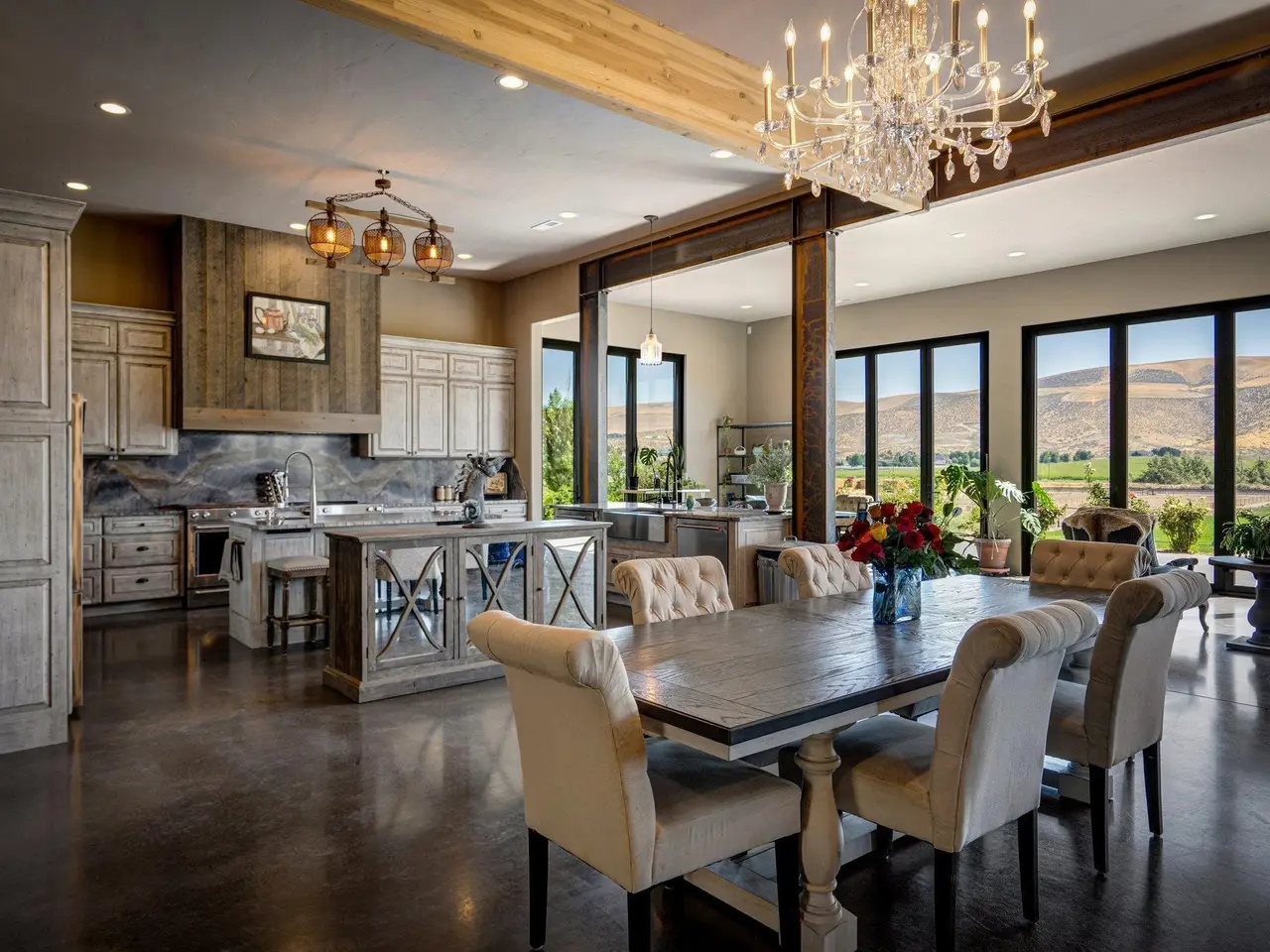 Embrace the rustic charm of country living on this expansive view property that encapsulates the heart and soul of farm life. A span of approximately 46 acres offers both a haven for a myriad of farming and equestrian pursuits, and luxurious countryside dwelling. Surrounded by unparalleled 360-degree views of Badger Canyon is the 7,500 square foot estate home, exuding rustic elegance and offering a seamless blend of character and comfort. The main level spans 5,000 square feet, with an unfinished upper level adding another 2,500 square feet. Two separate two-car garages provide 1,250 square feet of automotive heaven. Unlock a world of indoor-outdoor living with over sixty linear feet of floor-to-ceiling glass panoramic doors and an expansive wrap-around concrete patio. Crafted from Montana Timber Products Ranchwood circle sawn cedar siding, the home effortlessly blends into the surrounding landscape. Step inside and discover the blend of natural elements and modern amenities that make this home so extraordinary. A custom Schonbek crystal chandelier suspended from the twelve-foot ceilings adds elegance and serenity, while the exposed timber and iron beams and hand-stained finished concrete flooring evoke a sense of timelessness and strength to the expansive open-concept design. The kitchen is a chef's dream, with custom soft-closed cabinetry and book-matched backsplash all topped with Brazilian Zumaia quartzite. A commanding seven-foot dual exhaust hood takes center stage, harmonizing with stonework and cabinetry. Designed for culinary enthusiasts and entertaining, the kitchen offers two of everything with dual islands, gas and electric ranges, dishwashers, and refrigerators, and can easily accommodate an entire family of chefs. Explore the 36'x72' workshop, featuring five bays including one pull-through, offering abundant space for diverse uses. Fully insulated and heated, with a RV water and electric hookup on site, and supported by two 200-amp service boxes. The land itself features 24 acres under a pivot, with ten acres in wheel lines, and an additional five acres in solid sets, all in alfalfa. At the heart of the farm, approximately three acres are a dedicated equine facility, featuring five-foot pressure treat and no-climb fencing, a 220'x210' watered riding arena, and a feed and tack shed. For the horses, there are two large turnout areas and four 50'x50' paddocks, each with water, electricity, and matted shelters. Make an appointment today to see the endless possibilities firsthand.
