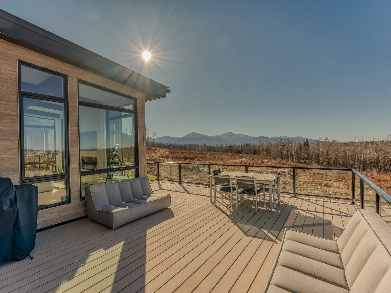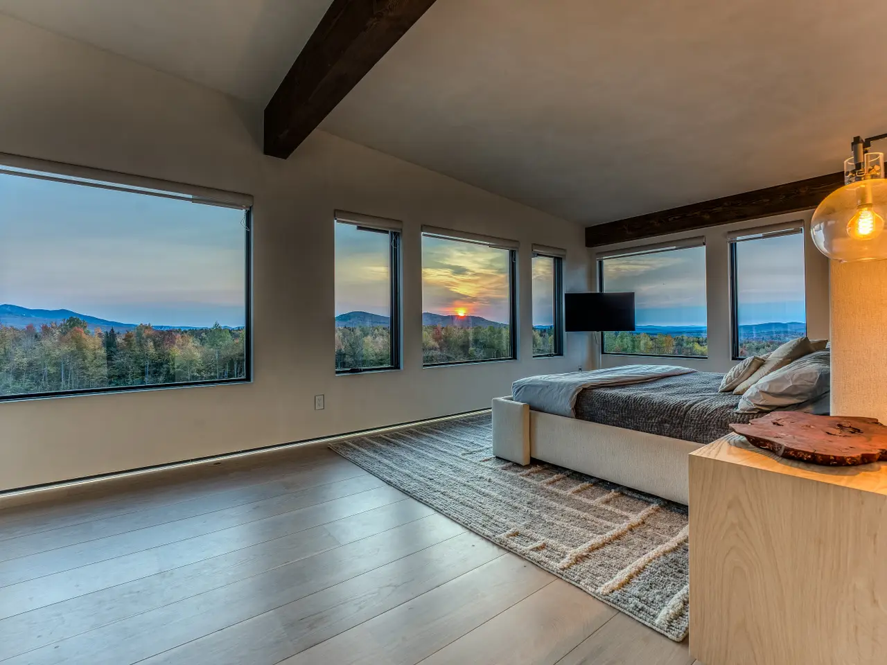 Located in the famed Ledgewood Subdivision, this modern Yankee Barn Home is both architecturally inspired and technologically innovative. Experience some of the finest sunsets in the north country, painted amongst a backdrop of Cannon and Lafayette Mountains into the rolling hills of Vermont. Every detail has been thoughtfully considered, from the finest materials to cutting-edge smart home technology. The use of materials such as tadelakt, lime plasters, clay, wood, quartz, and ceramic seamlessly blends the indoors with the outdoors, while being illuminated by in-wall linear LED lighting. Custom cabinetry from Germany and a Thermador appliance suite form the foundation of the open-concept, luxurious chef's kitchen. The primary bedroom and bath were expertly designed to accommodate the southwesterly-facing view, with large picture windows that give the sense of being perched among nature. Two additional bedrooms and a full bath are featured on the second level, as well as a built-in walnut desk. All the closets in the home were designed by California Closets, showcasing efficiency and luxury. The lower level features an exercise area and living room, as well as a bedroom with a walk-in closet, a Balinese-inspired steam shower in the bathroom and built-in full over full bunk beds. The home has been given an EnergyStar certification, features geothermal heating/cooling and has two bioethanol fireplaces for ambiance and warmth. Broker-owned.