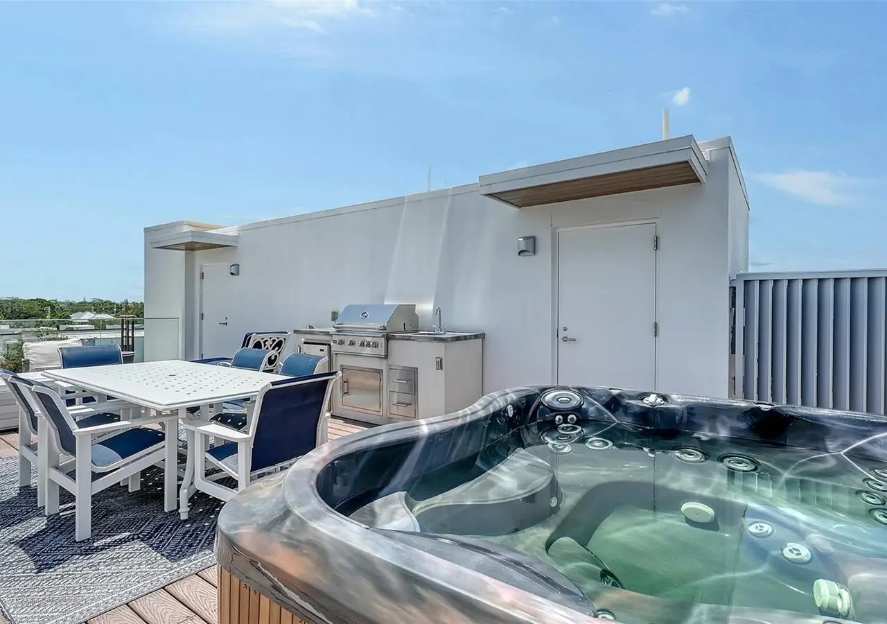 Sophisticated urban living awaits in this refined three-story townhouse with a PRIVATE ELEVATOR and expansive ROOFTOP DECK, located in the exclusive Townhomes of Orange Club in downtown Sarasota. Just steps from the historic Burns Court district and the city's vibrant Bayfront, this stylish residence offers 2,300 SF of thoughtfully designed living space, including 3 bedrooms each with their own ensuite bathroom. The private rooftop deck is a true sanctuary featuring a jacuzzi hot tub, outdoor kitchen, privacy wall, and 608 SF of additional outdoor living space - perfect for relaxing or entertaining under the stars, all with captivating city views. Designer finishes throughout, soaring 10-ft smooth-finish ceilings, Low-E impact windows and doors, contemporary baseboards and casings all enhance the home's clean aesthetic. A private two-car garage opens to a welcoming foyer and a guest bedroom with ensuite bath on the first level. The second floor is designed for effortless entertaining, with an open-concept great room, east- and west-facing balconies with frameless glass railings for unobstructed views, powder room, and a gourmet kitchen featuring imported Italian cabinetry, quartz countertops, and Jenn-Air stainless steel appliances, including a six-burner gas range. Upstairs, the third floor hosts a serene primary suite and a spacious second bedroom, both with ensuite baths and private balconies. A laundry closet with full-size washer and dryer adds convenience. Residents of Orange Club enjoy a secure, upscale community with surveillance cameras, a heated pool, and a sun lounge area. Located in the heart of Sarasota, you're just moments from the city's best, including a thriving arts and culture scene, award-winning dining, boutiques, nightlife, farmers market, and year-round festivals. This is downtown Sarasota living at its finest.