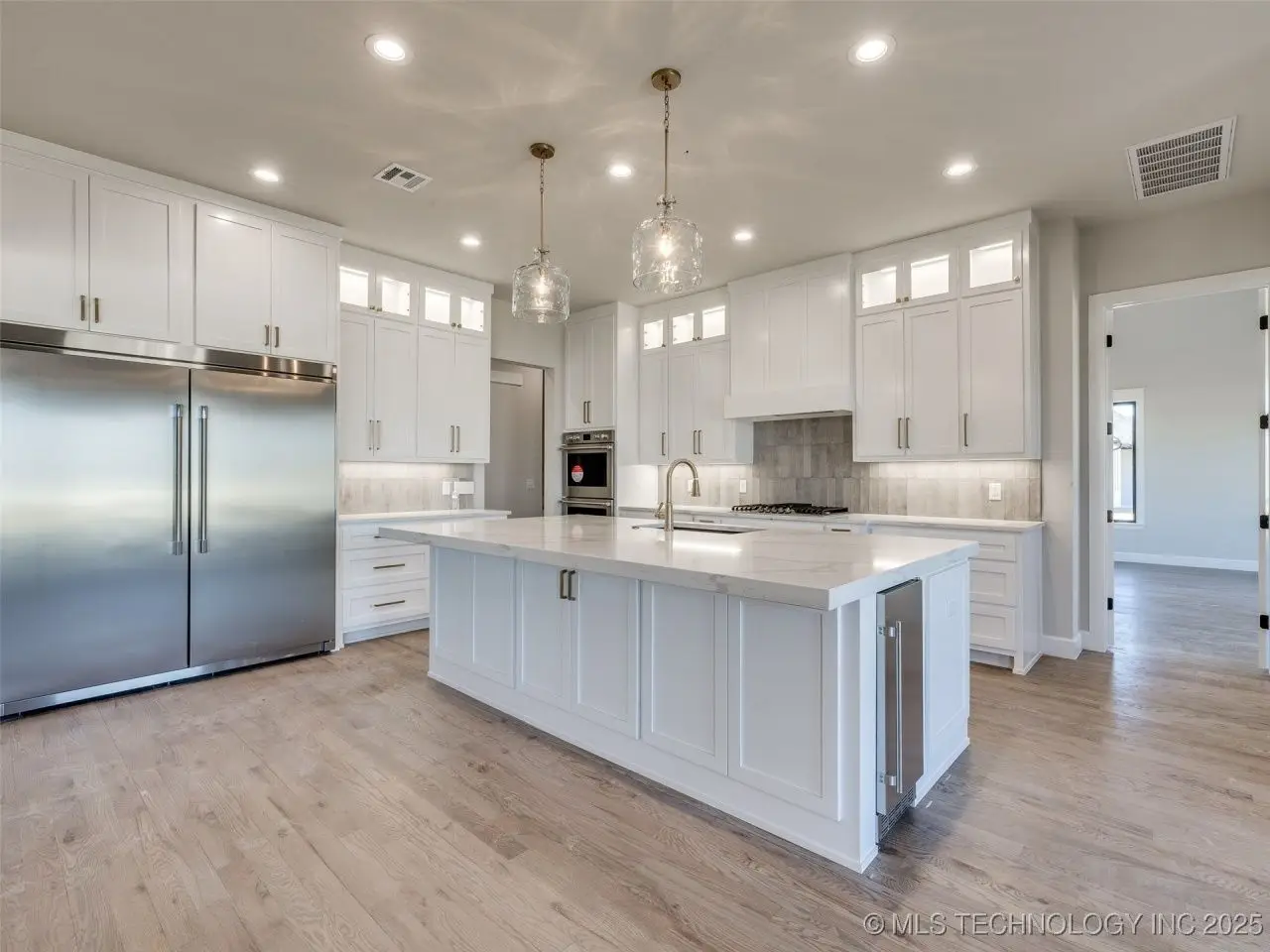 True one of a kind custom on large 1 + acre lot in South Bixby. This home has 5 bedrooms, (2 down, 3 up) 5 full & 1 half baths, home office and 3 car garage. No expenses were spared! Custom countertops & professional grade appliances in kitchen, extensive wood floors, spray foam insulation, LED lights, Low-E windows, & more. Additional features include theater room on main level & large game room up. Oversized master w/ private sitting area & spa like bath. Enjoy a quiet evening in your beautiful backyard.