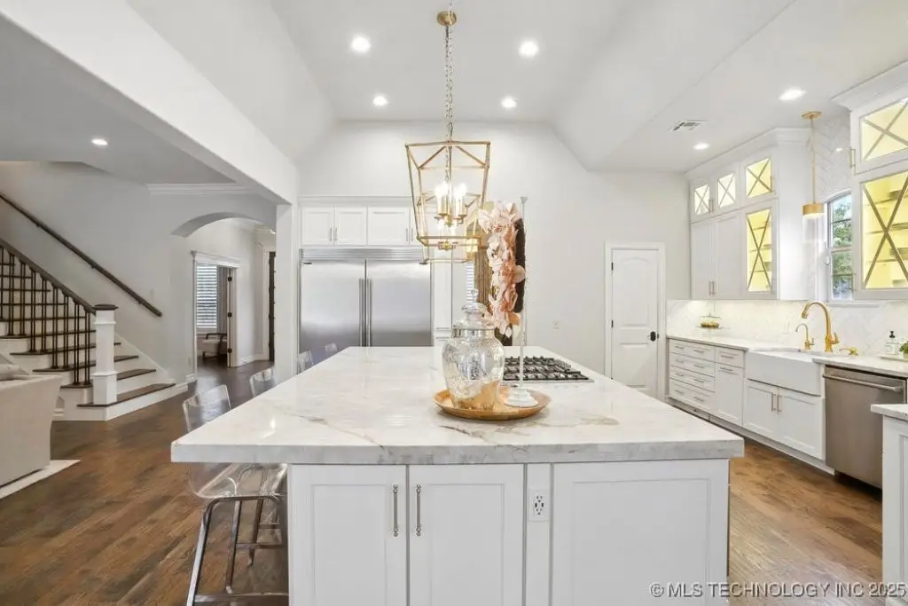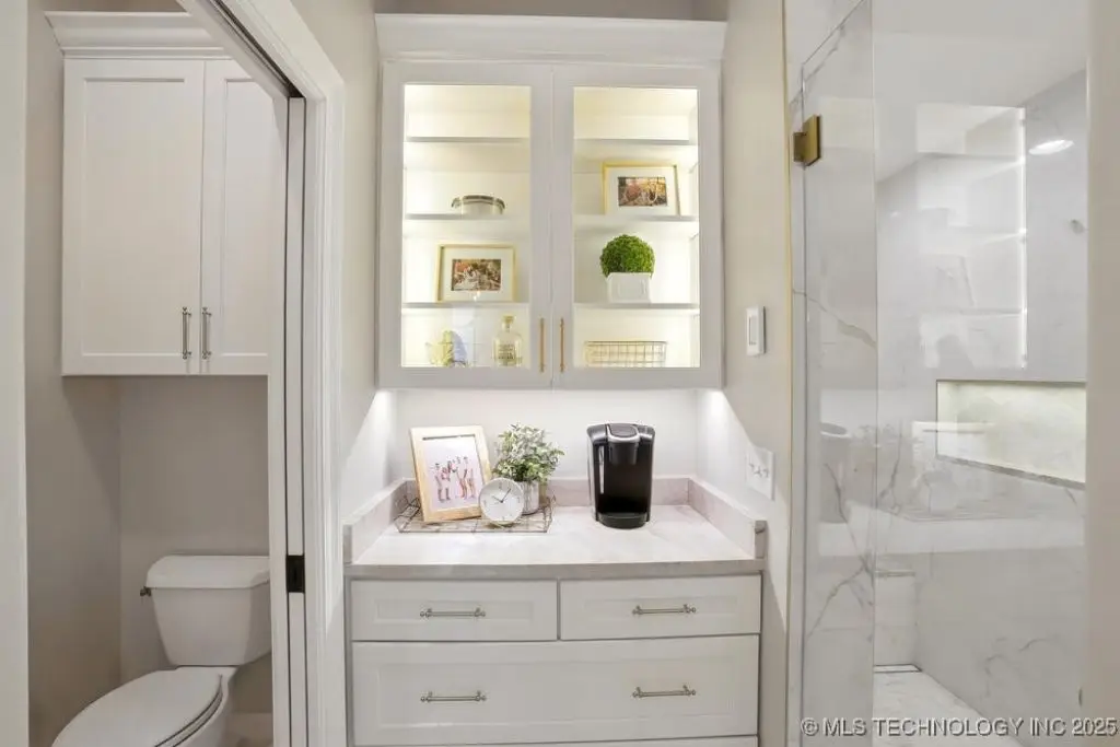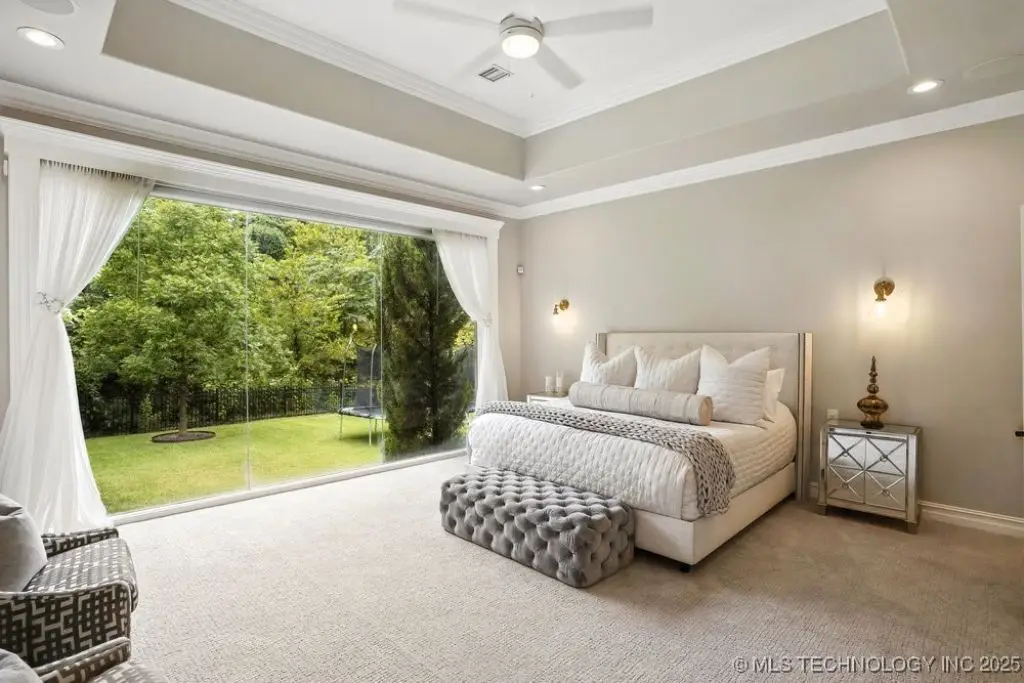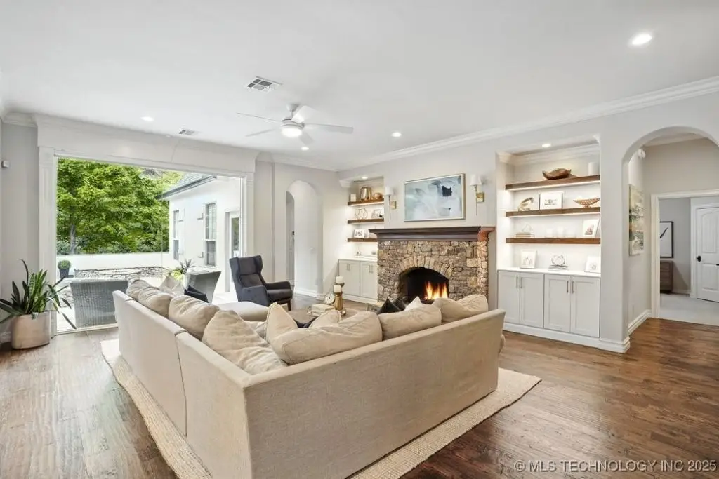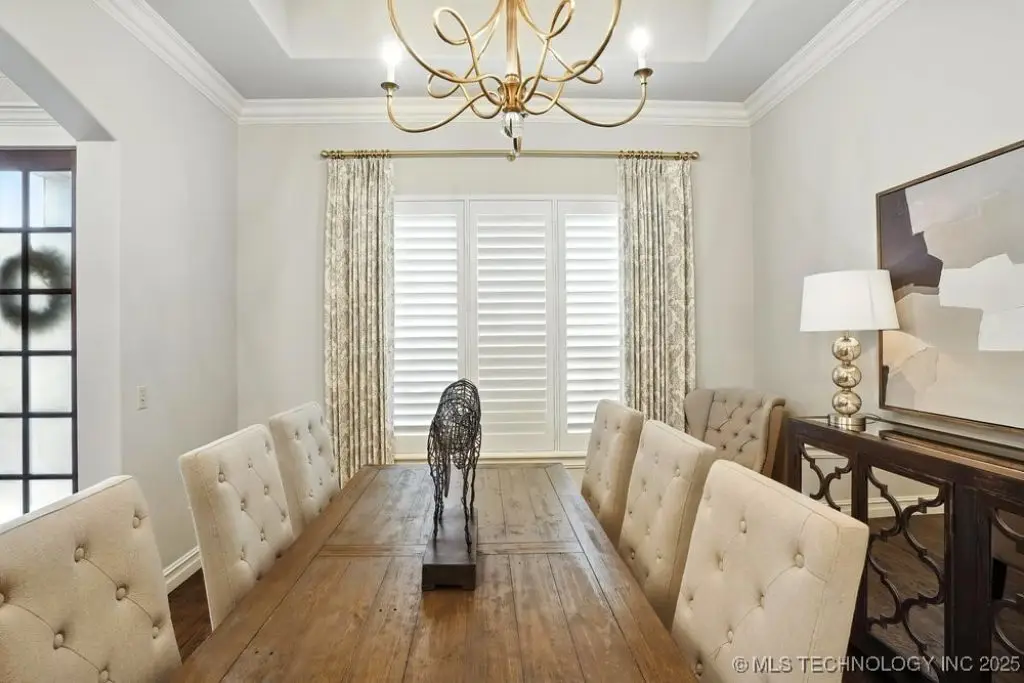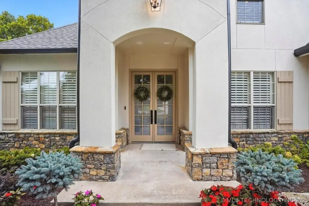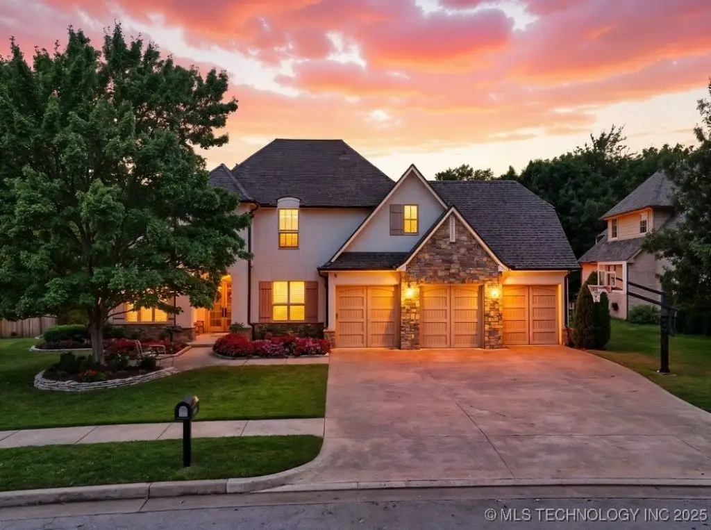 Welcome to your luxurious retreat, perfectly situated at the crossroads of Bixby and South Tulsa, offering the ultimate in comfort and convenience. This beautifully updated residence features five spacious bedrooms, four and a half baths, and a stunning grand foyer that opens to elegant formal spaces, including a formal dining/sitting room and a private office with its own closet. At the heart of the home is a chef's dream kitchen, designed to ignite culinary creativity. Outfitted with top-of-the-line Bosch appliances including double ovens and a built-in drawer microwave. This chefs kitchen is adorned with quartzite countertops, a Dolomitic Marble backsplash, and custom cabinetry extending to the ceiling with soft-close doors and drawers. A large STUNNING single-slab center island seats five, making it ideal for casual dining. Step outside to your private backyard oasis, featuring an in-ground pool, spa, firepit, and a fully equipped outdoor kitchen all set against the serene backdrop of a lush greenbelt. Gorgeous mature trees surround the home and are a focal point through the picturesque windows adorning the home. The luxurious primary suite offers a true escape, complete with a gas fireplace, all-new custom cabinetry, and elegant Dolomitic Marble finishes. The spa-inspired ensuite bath boasts a composite quartz stand-alone soaking tub, a curbless walk-in shower with multiple showerheads, and a heated quartzite bench designed for pure relaxation. On the main level, a private guest suite includes its own ensuite bath, perfect for visitors. Upstairs, you'll find three additional bedrooms, one with a private bath and walk-in closet, and two that share a stylish Pullman bath. A flexible living area or game room with a wet bar and mini fridge adds even more versatility. With hand-scraped hardwood floors, plantation shutters, and high-end finishes throughout, this home seamlessly blends timeless elegance with modern luxury. Welcome to refined living. Welcome home.