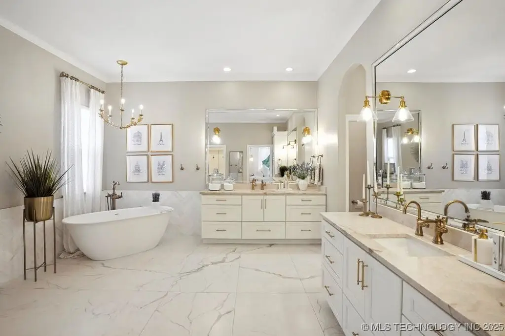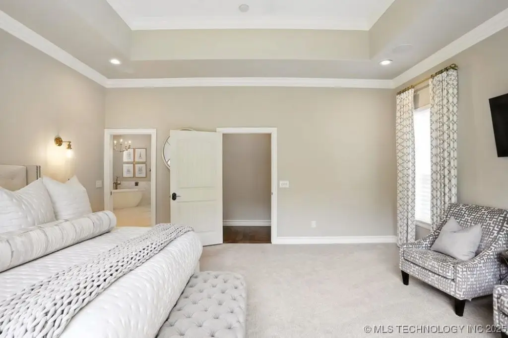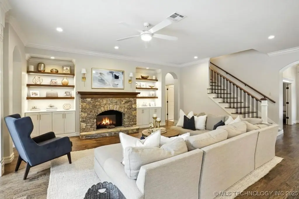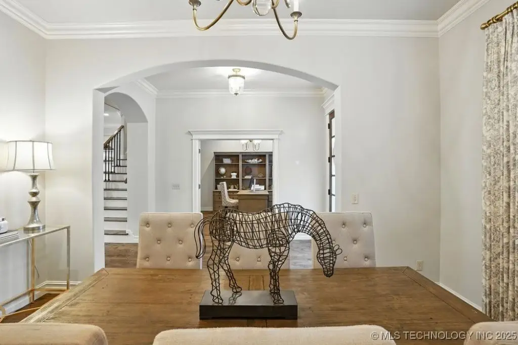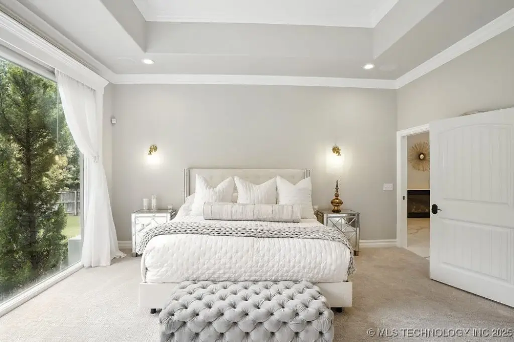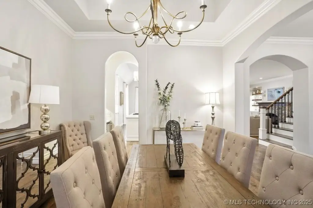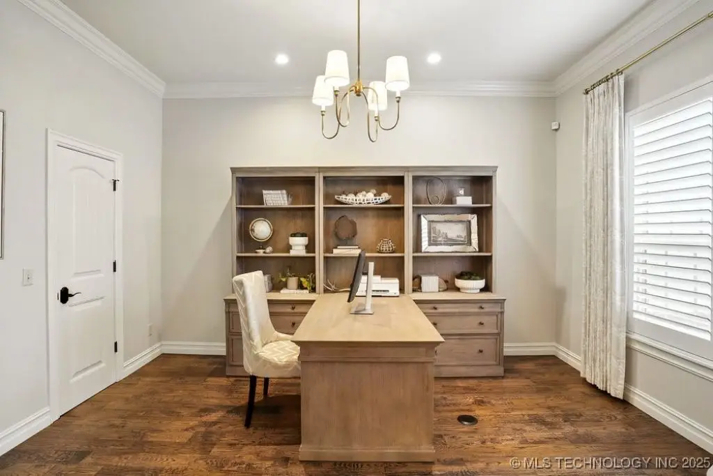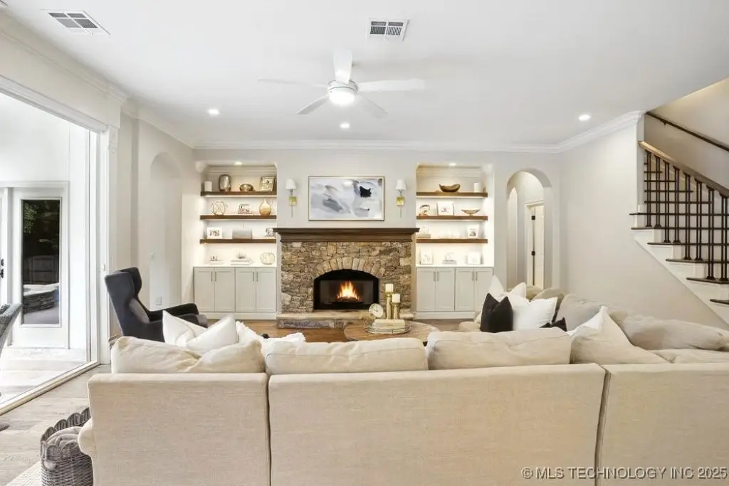Welcome to your luxurious retreat, perfectly situated at the crossroads of Bixby and South Tulsa, offering the ultimate in comfort and convenience. This beautifully updated residence features five spacious bedrooms, four and a half baths, and a stunning grand foyer that opens to elegant formal spaces, including a formal dining/sitting room and a private office with its own closet. At the heart of the home is a chef's dream kitchen, designed to ignite culinary creativity. Outfitted with top-of-the-line Bosch appliances including double ovens and a built-in drawer microwave. This chefs kitchen is adorned with quartzite countertops, a Dolomitic Marble backsplash, and custom cabinetry extending to the ceiling with soft-close doors and drawers. A large STUNNING single-slab center island seats five, making it ideal for casual dining. Step outside to your private backyard oasis, featuring an in-ground pool, spa, firepit, and a fully equipped outdoor kitchen all set against the serene backdrop of a lush greenbelt. Gorgeous mature trees surround the home and are a focal point through the picturesque windows adorning the home. The luxurious primary suite offers a true escape, complete with a gas fireplace, all-new custom cabinetry, and elegant Dolomitic Marble finishes. The spa-inspired ensuite bath boasts a composite quartz stand-alone soaking tub, a curbless walk-in shower with multiple showerheads, and a heated quartzite bench designed for pure relaxation. On the main level, a private guest suite includes its own ensuite bath, perfect for visitors. Upstairs, you'll find three additional bedrooms, one with a private bath and walk-in closet, and two that share a stylish Pullman bath. A flexible living area or game room with a wet bar and mini fridge adds even more versatility. With hand-scraped hardwood floors, plantation shutters, and high-end finishes throughout, this home seamlessly blends timeless elegance with modern luxury. Welcome to refined living. Welcome home.