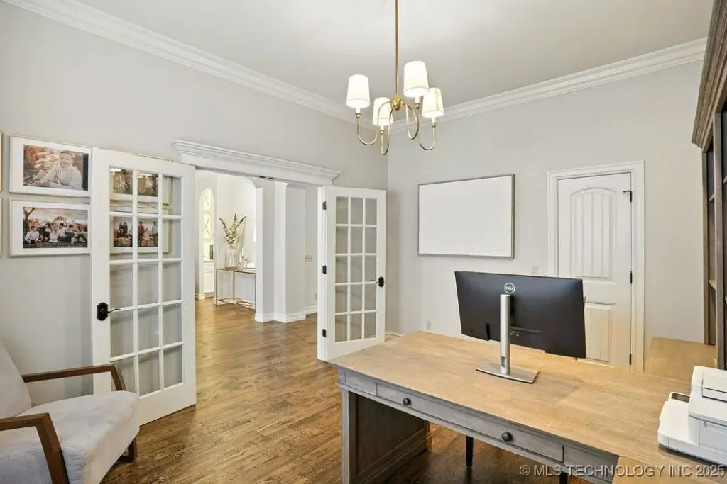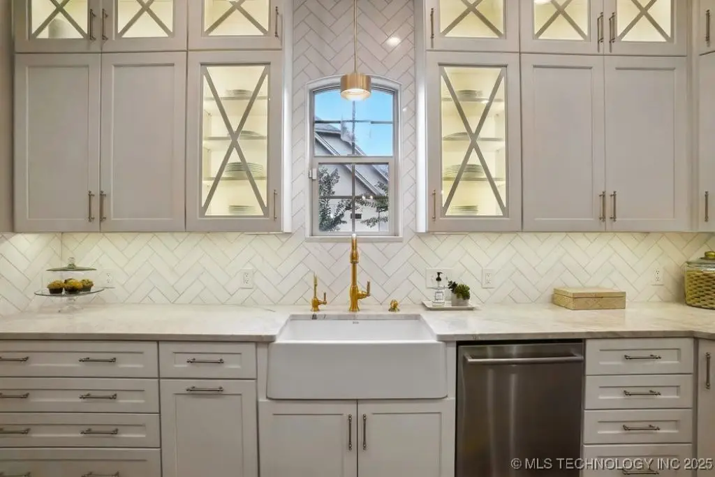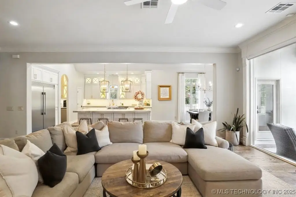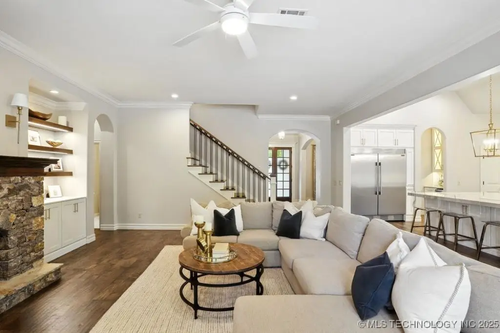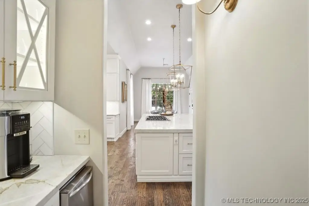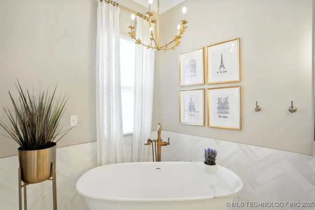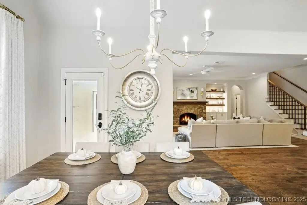 Welcome to your luxurious retreat, perfectly situated at the crossroads of Bixby and South Tulsa, offering the ultimate in comfort and convenience. This beautifully updated residence features five spacious bedrooms, four and a half baths, and a stunning grand foyer that opens to elegant formal spaces, including a formal dining/sitting room and a private office with its own closet. At the heart of the home is a chef's dream kitchen, designed to ignite culinary creativity. Outfitted with top-of-the-line Bosch appliances including double ovens and a built-in drawer microwave. This chefs kitchen is adorned with quartzite countertops, a Dolomitic Marble backsplash, and custom cabinetry extending to the ceiling with soft-close doors and drawers. A large STUNNING single-slab center island seats five, making it ideal for casual dining. Step outside to your private backyard oasis, featuring an in-ground pool, spa, firepit, and a fully equipped outdoor kitchen all set against the serene backdrop of a lush greenbelt. Gorgeous mature trees surround the home and are a focal point through the picturesque windows adorning the home. The luxurious primary suite offers a true escape, complete with a gas fireplace, all-new custom cabinetry, and elegant Dolomitic Marble finishes. The spa-inspired ensuite bath boasts a composite quartz stand-alone soaking tub, a curbless walk-in shower with multiple showerheads, and a heated quartzite bench designed for pure relaxation. On the main level, a private guest suite includes its own ensuite bath, perfect for visitors. Upstairs, you'll find three additional bedrooms, one with a private bath and walk-in closet, and two that share a stylish Pullman bath. A flexible living area or game room with a wet bar and mini fridge adds even more versatility. With hand-scraped hardwood floors, plantation shutters, and high-end finishes throughout, this home seamlessly blends timeless elegance with modern luxury. Welcome to refined living. Welcome home.
