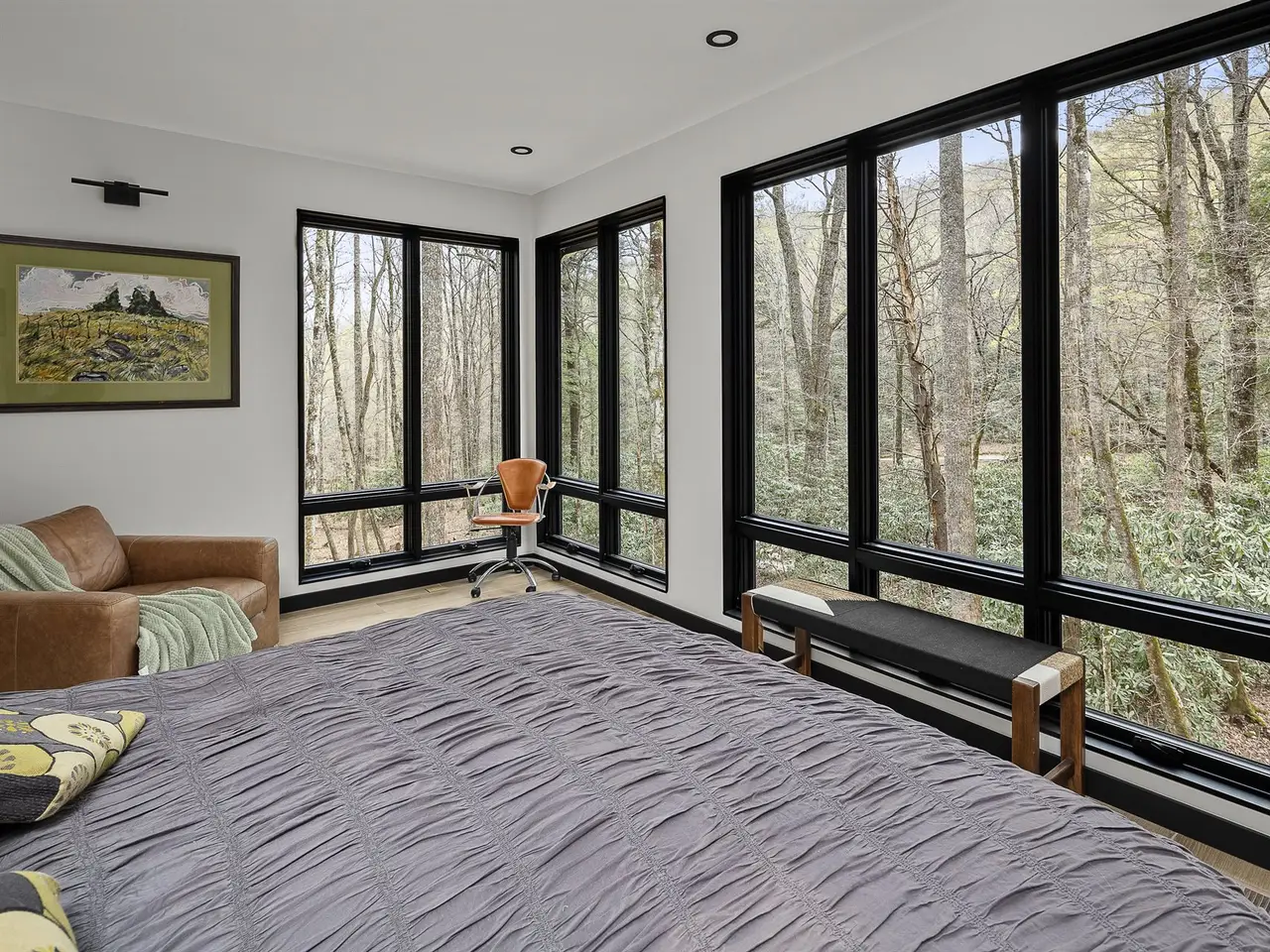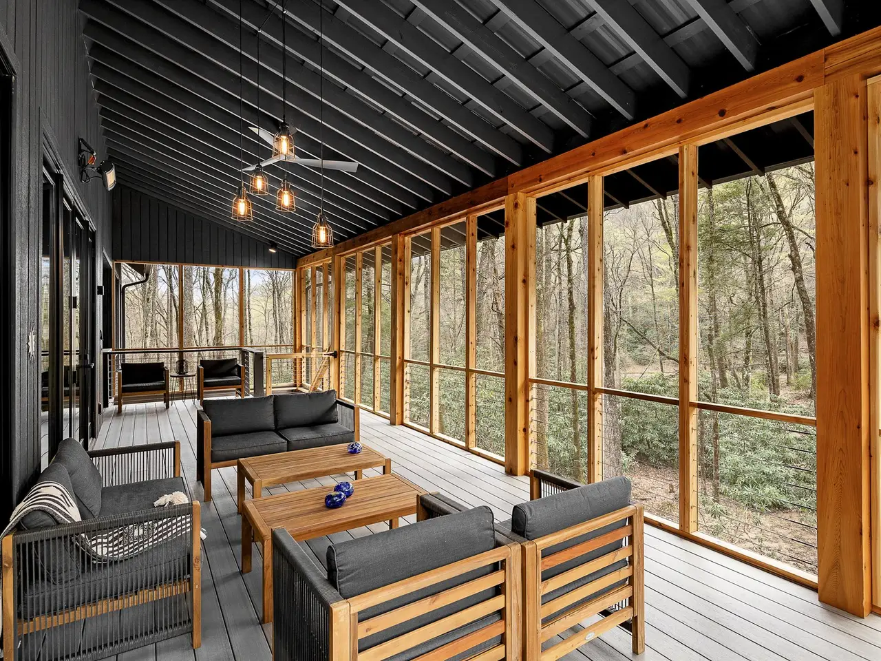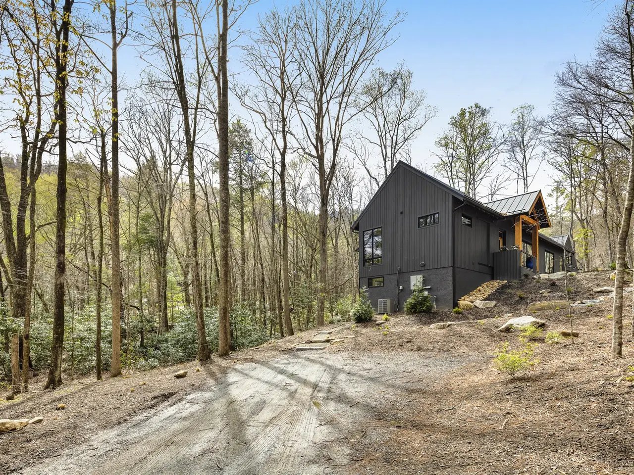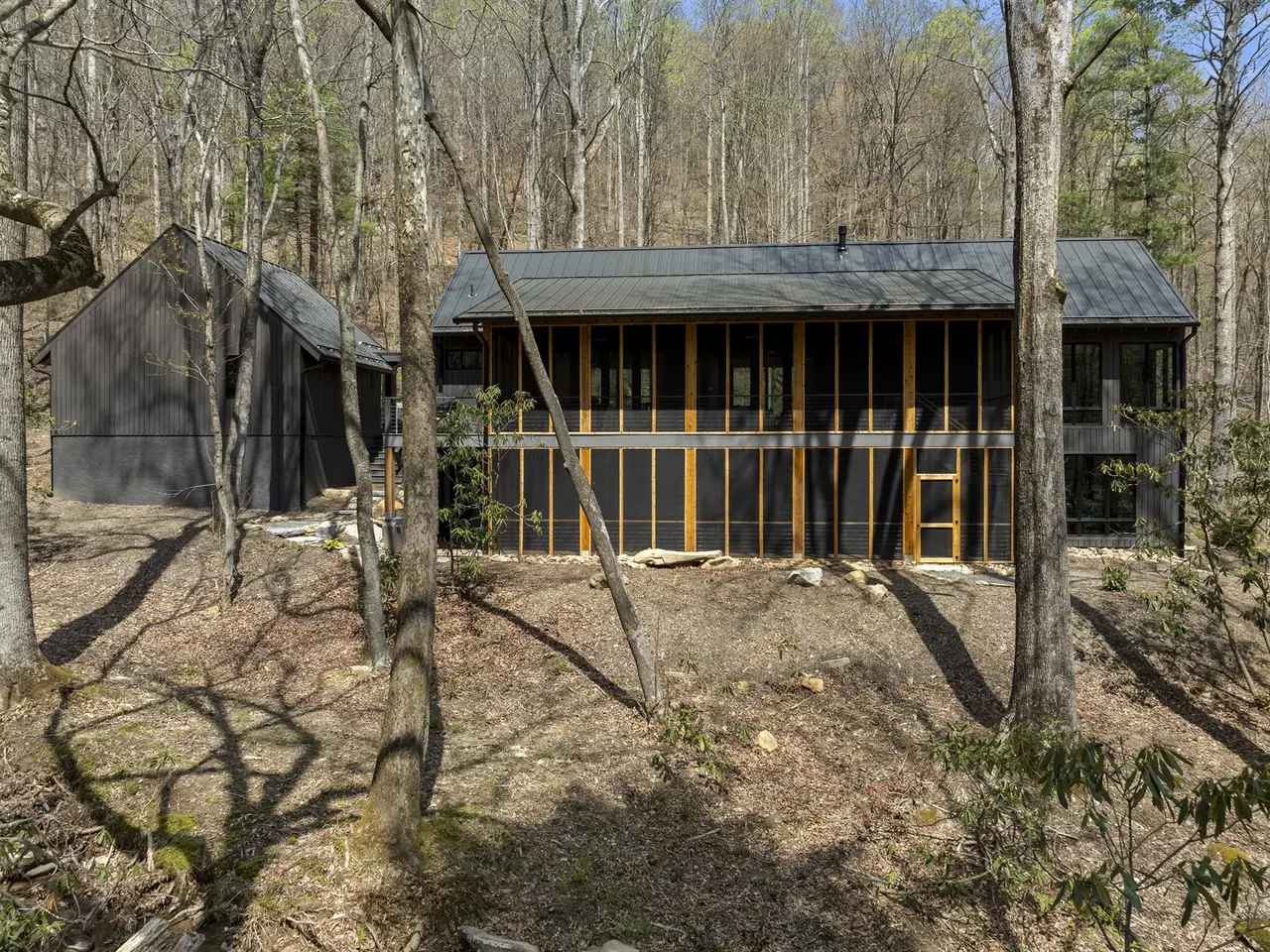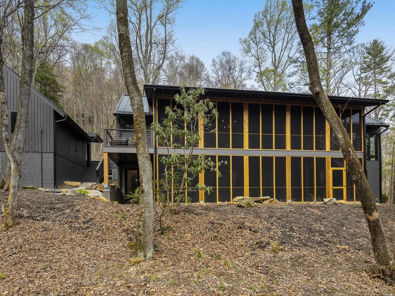 Nestled within the gated Laurel Ridge community, this sleek contemporary custom home offers a unique blend of luxury and privacy, just 12 minutes from downtown Black Mountain. Professionally landscaped grounds blend seamlessly with the natural surroundings. Inside, the great room welcomes you with a soaring vaulted ceiling adorned with solid wood beams, floor-to-ceiling ceramic tile accents, and expansive windows. The chef's kitchen features Dekton countertops, custom cabinetry and sleek black appliances. Outside, two fully screened patios beckon for alfresco dining or leisurely afternoons, accompanied by the gentle sounds of a nearby creek. The main-level primary suite boasts a spa-like bath and spacious walk-in closet. Descending to the terrace level, discover a separate guest suite and full apartment with a guest room and office space. Additional features include a two-car garage wired for an EV charger. Experience the pinnacle of luxury mountain living at this remarkable property.