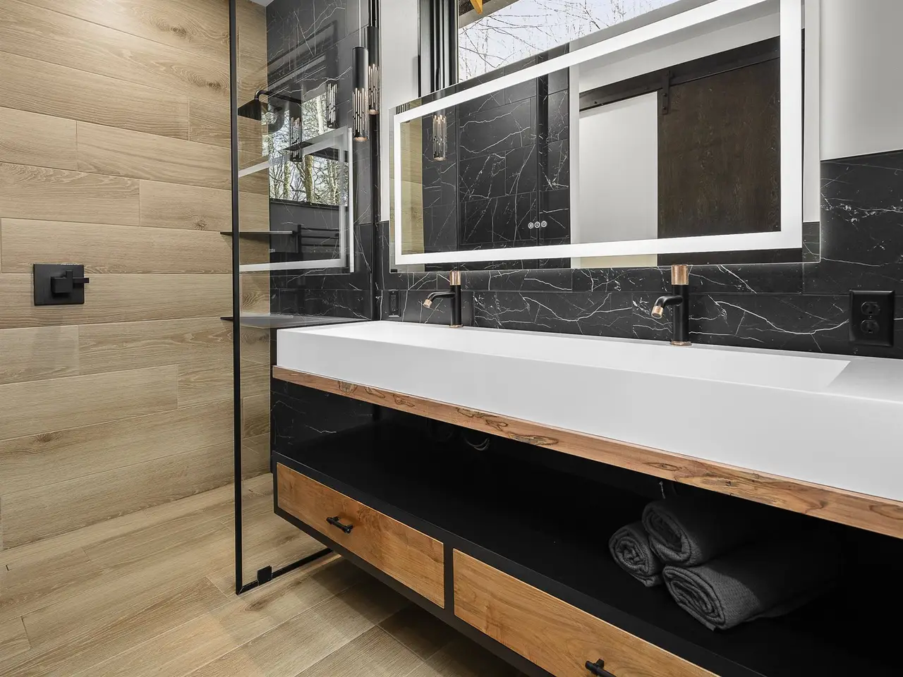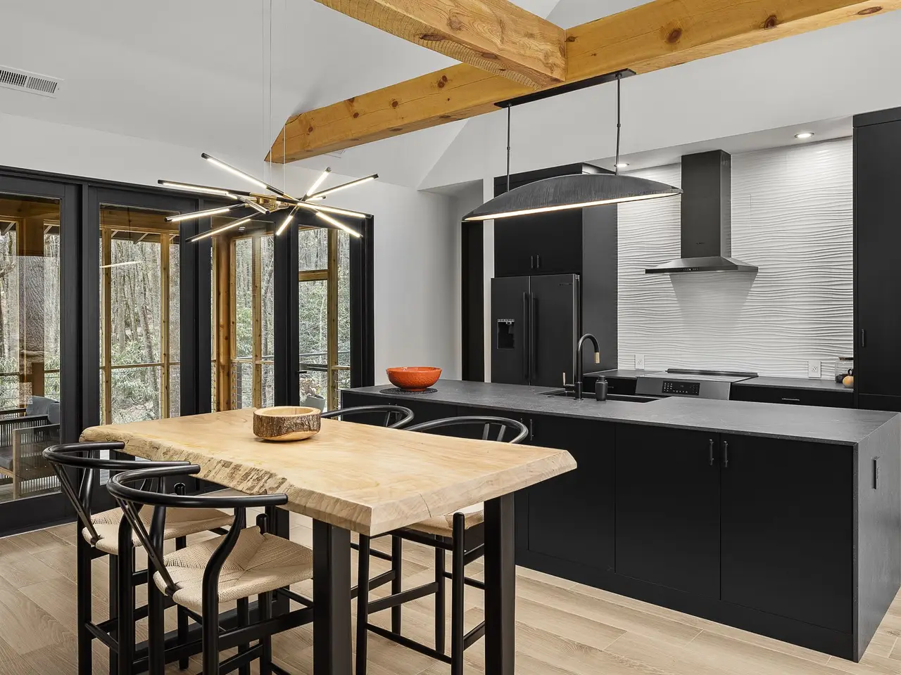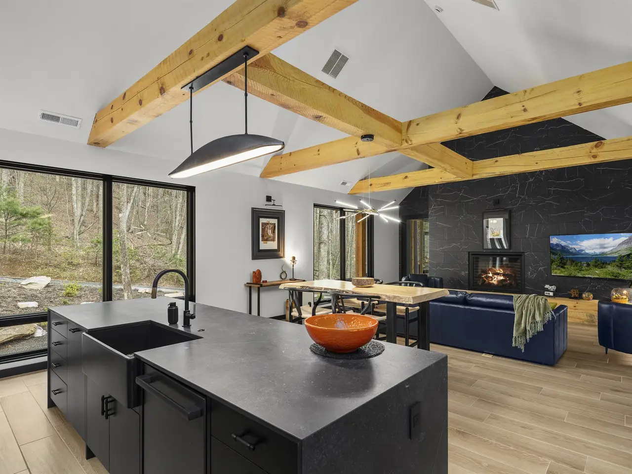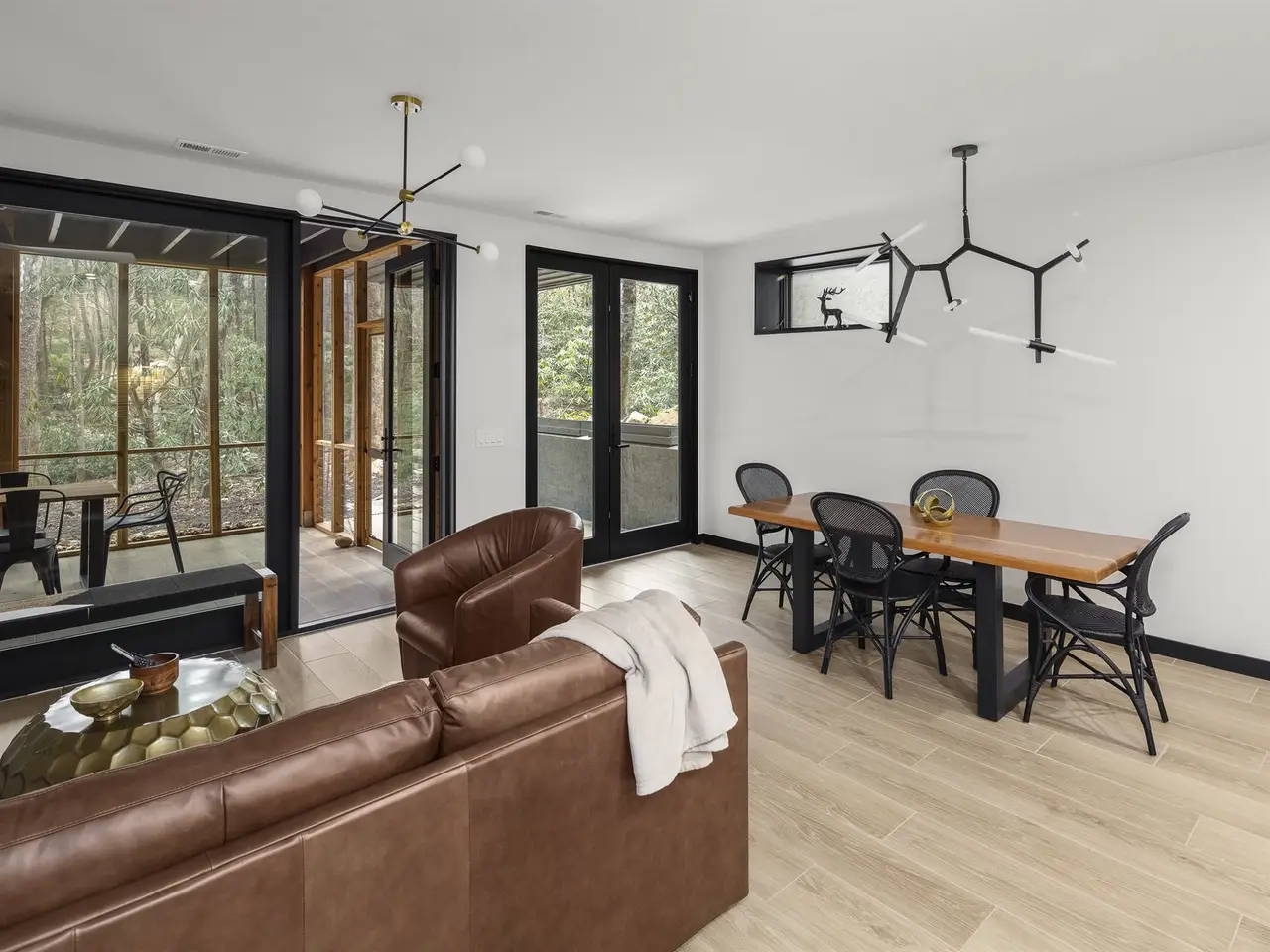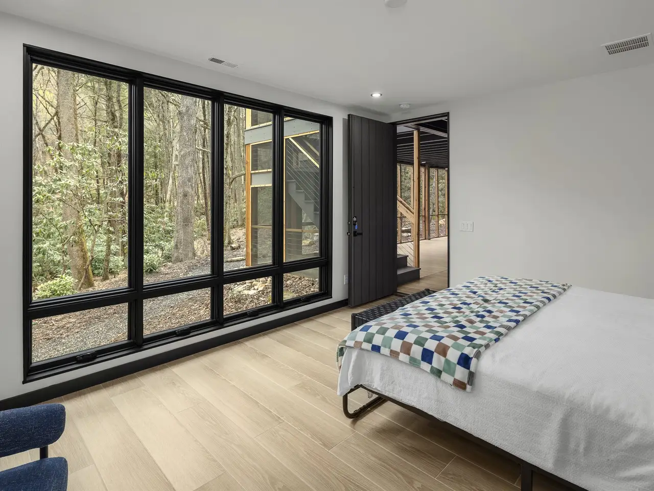 Nestled within the gated Laurel Ridge community, this sleek contemporary custom home offers a unique blend of luxury and privacy, just 12 minutes from downtown Black Mountain. Professionally landscaped grounds blend seamlessly with the natural surroundings. Inside, the great room welcomes you with a soaring vaulted ceiling adorned with solid wood beams, floor-to-ceiling ceramic tile accents, and expansive windows. The chef's kitchen features Dekton countertops, custom cabinetry and sleek black appliances. Outside, two fully screened patios beckon for alfresco dining or leisurely afternoons, accompanied by the gentle sounds of a nearby creek. The main-level primary suite boasts a spa-like bath and spacious walk-in closet. Descending to the terrace level, discover a separate guest suite and full apartment with a guest room and office space. Additional features include a two-car garage wired for an EV charger. Experience the pinnacle of luxury mountain living at this remarkable property.