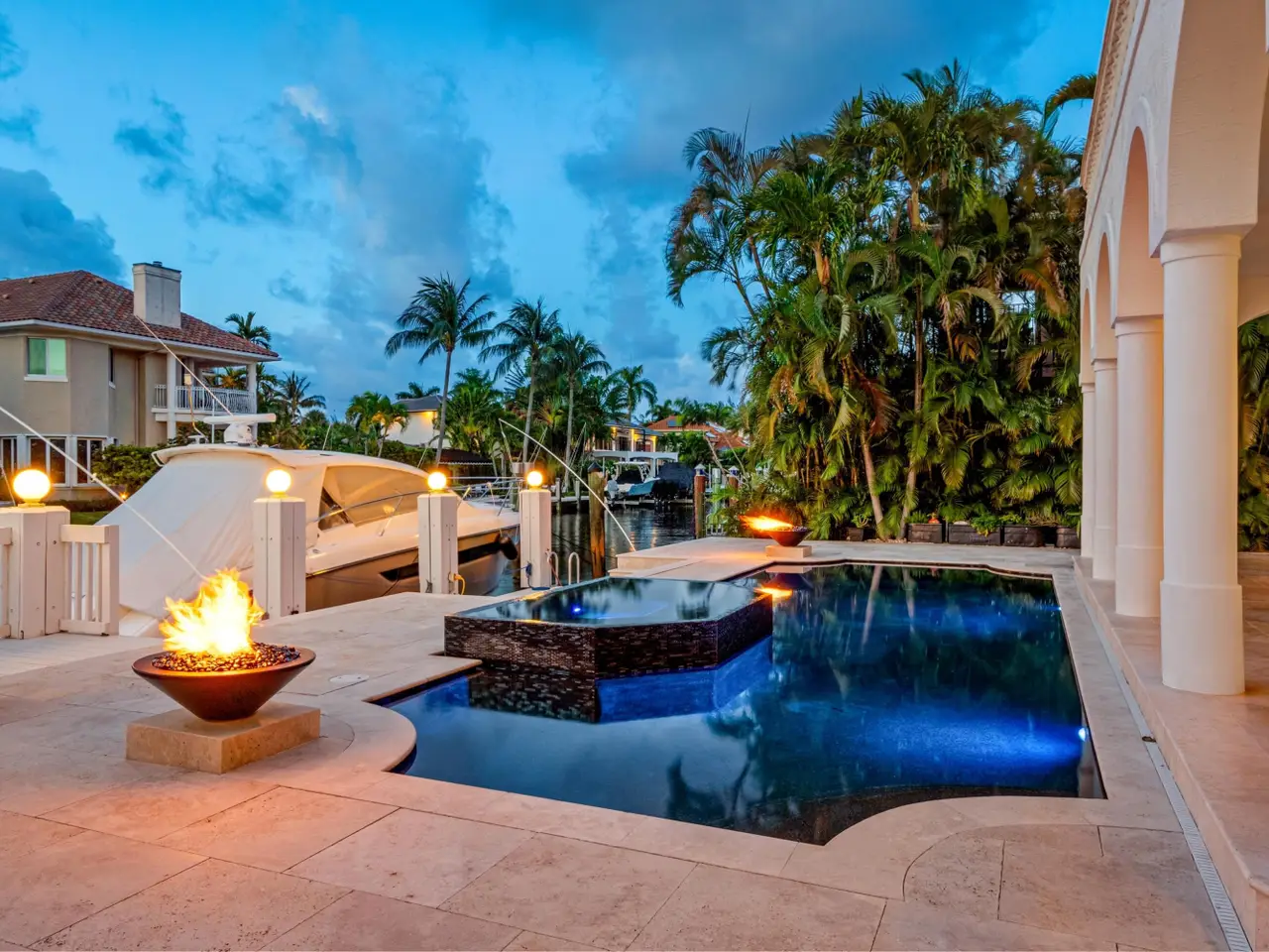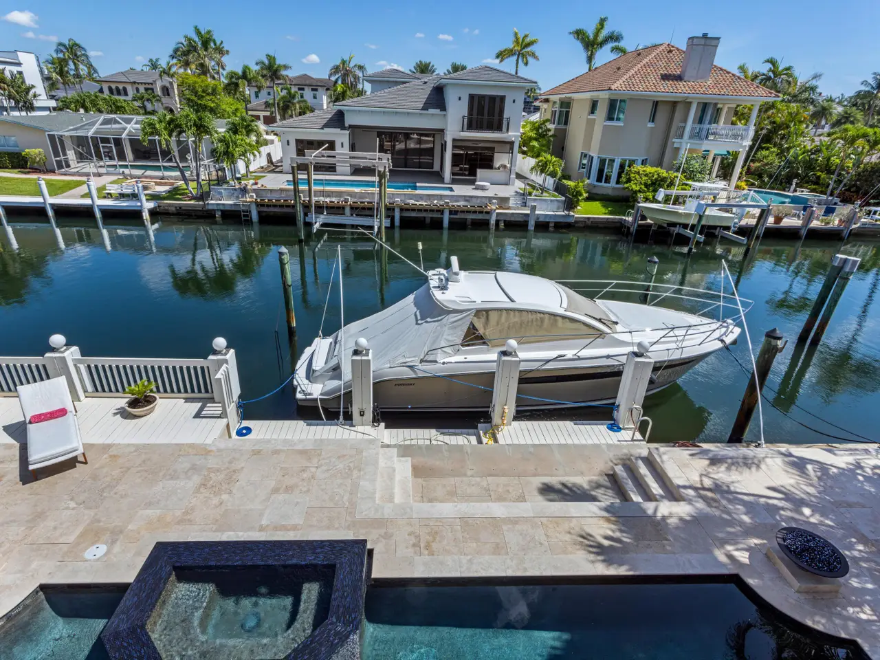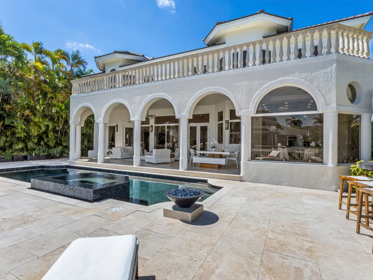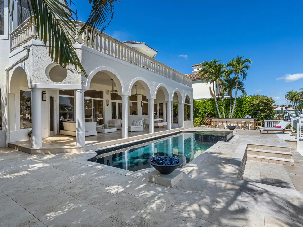 Luxe Boca Raton deepwater estate in the desirable Lake Rogers community fronts 80 feet on a deep-water canal with a dock offering easy ocean access, desirable for boaters. Interiors are peerlessly defined by grand architectural adornments, and the magnificent outdoor entertaining area centers on a sun-splashed pool with a spill-over spa bounded by an expansive patio with a wet bar and barbeque area.