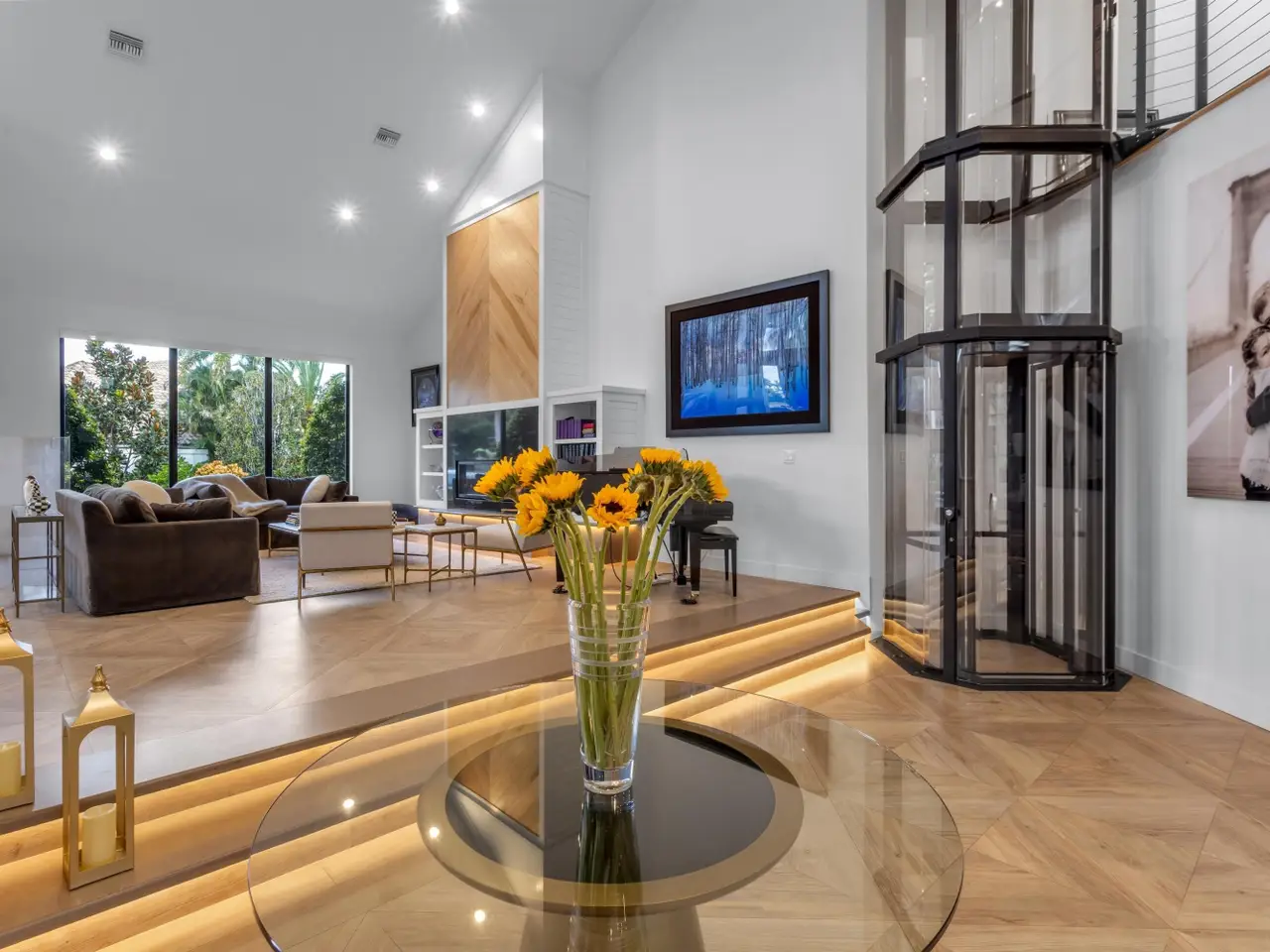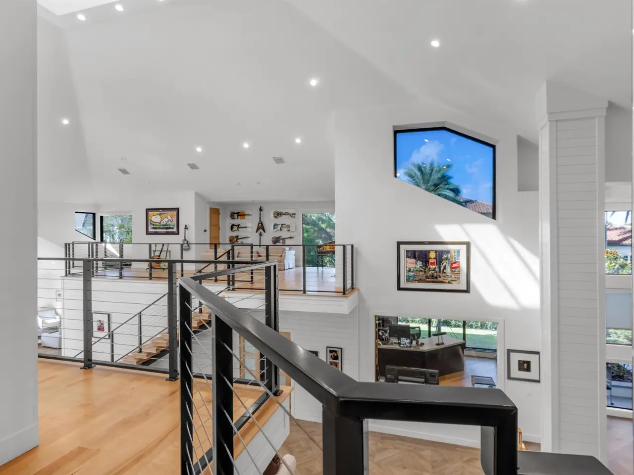Blending contemporary architecture with lofty urban chic, this dramatic yachting estate offers a voluminous open floor plan with stunning interiors, serene water views, and direct ocean access. A massive glass grid entry with oversized custom double doors reveals a towering 30-foot foyer, which is a prelude to the voluminous expanse of this open-plan design. A skylit gallery sitting area is framed by twin suspended staircases with open cable rails and recessed stair lights. The dining area offers a floor-to-ceiling expansive grid window wall view of the sun-drenched pool and waterway. Soaring shiplap walls and bleached oak designed porcelain floors provide a modern farmhouse ambience.