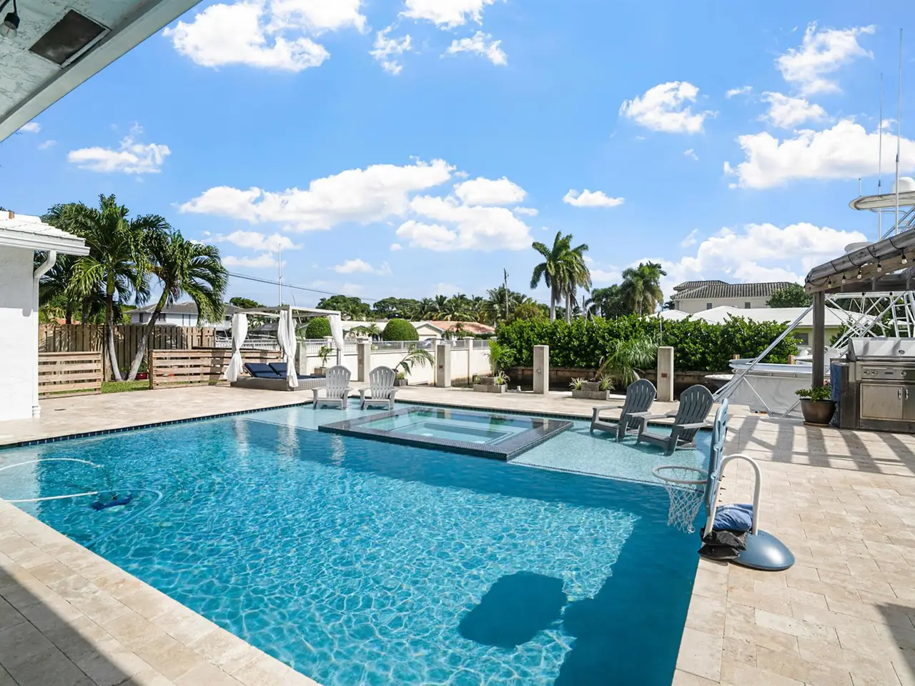 Experience luxury waterfront living in this Deepwater Dream Home, featuring a resort-style pool and spa, tiki bar, and a fully equipped summer kitchen--perfect for entertaining. The property offers protected dockage with 90 feet of waterfrontage, ideal for the avid yachtsman. Recent upgrades include a newer roof, three newer A/C units, concrete dock and seawall, and completion of impact-resistant windows and doors throughout. Enjoy the ultimate South Florida lifestyle in this beautiful waterfront residence. Can be easily converted to a 2-car garage. All upgrades, dates, pricing, and survey located in the document section. Owner financing available.
