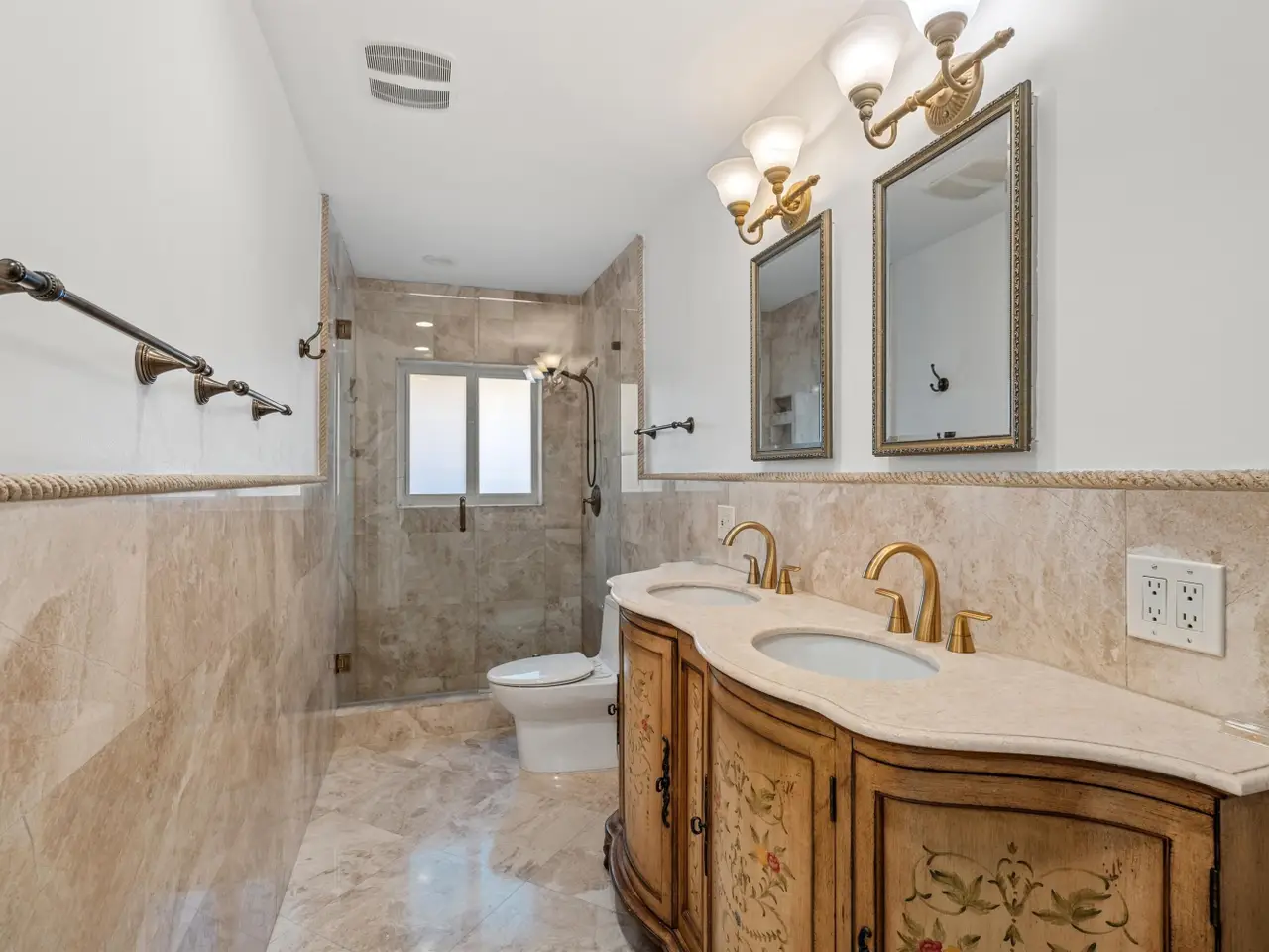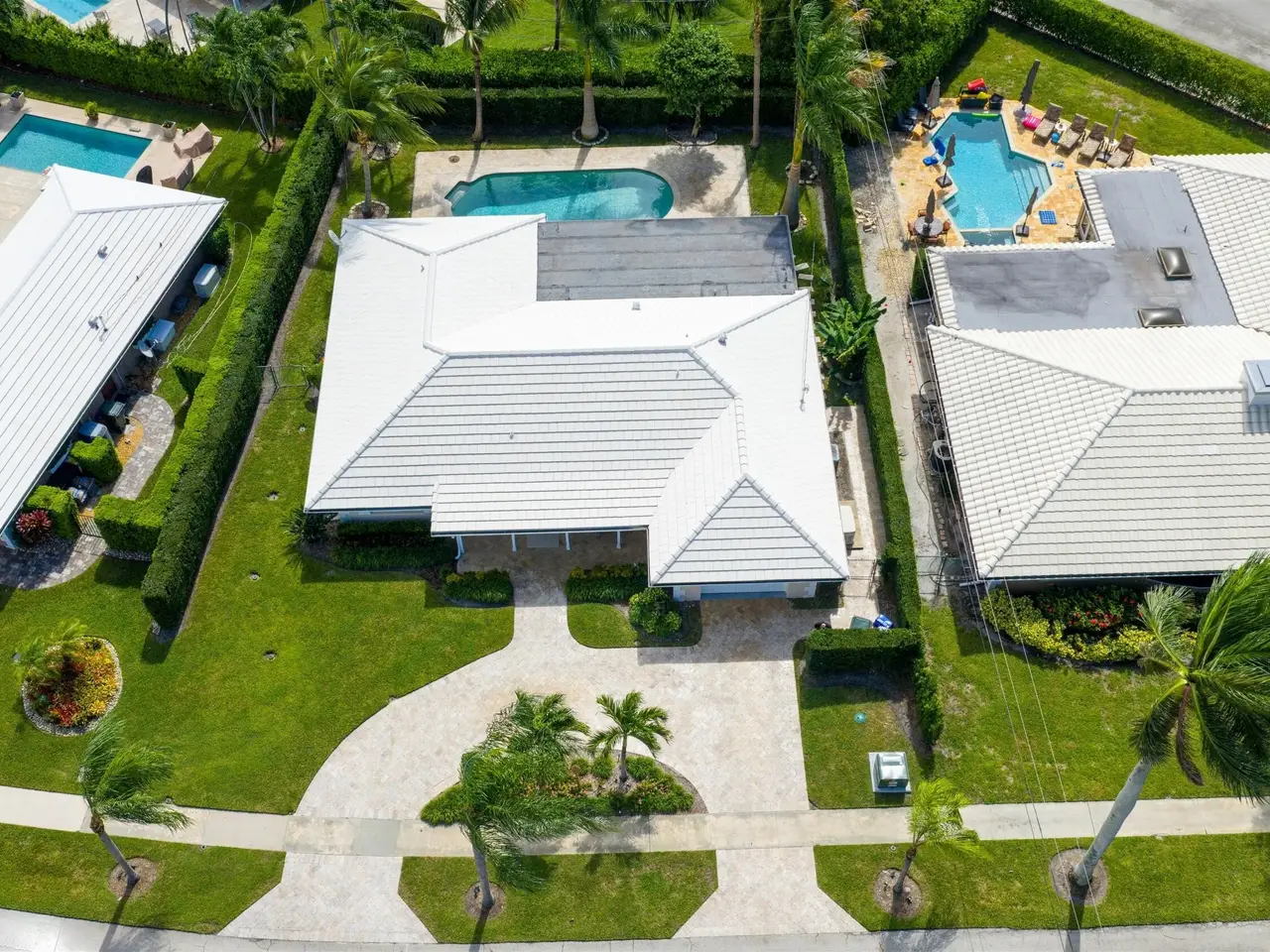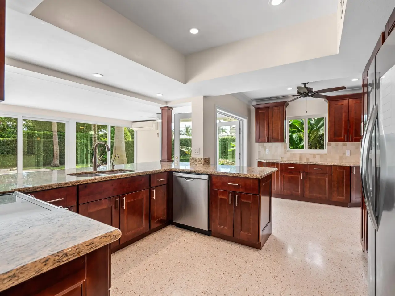 Located in desirable Camino Gardens, this classic Bermuda-style residence presents a harmonious blend of tropical character and modern sophistication, featuring an updated gourmet kitchen and designer bathrooms. The light-filled interiors span 2,539 +/- total square feet in a free-flowing, open floor plan. Architectural details include crown moldings and elegant plantation shutters. The central great room is perfectly situated for entertaining, serviced by a spacious bar connecting it to the kitchen. The kitchen is equipped with Mahogany Shaker cabinetry, granite countertops, and stainless-steel appliances. The adjoining breakfast nook offers a built-in buffet with glass showcase cabinetry.