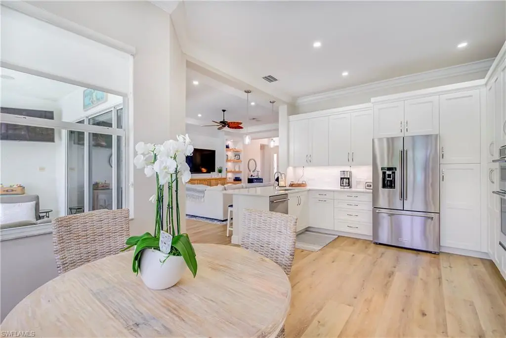 Beautifully renovated and ideally located just steps from the clubhouse and resort amenities, this 3-bedroom, 3-bath pool home in Vasari Country Club offers luxury living with quality craftsmanship, stylish finishes, and a new roof among its many thoughtful updates. The dream kitchen is designed for both beauty and functionality, featuring custom cabinetry, elegant hardware and faucet, and a full suite of 2022 KitchenAid appliancesùincluding a refrigerator, dishwasher, convection wall oven/microwave, and cooktopùalong with a Whirlpool beverage fridge. Wide-plank luxury vinyl flooring flows throughout the main living areas, creating a modern and cohesive space. The open great room is an entertainerÆs dream, with a custom shiplap-paneled entertainment wall, built-in shelving, and a mounted television. A wall of three-panel glass sliders opens to your private lanai, where you'll enjoy beautiful views of the pool, tranquil lake, and VasariÆs 18th hole. The spacious ownerÆs suite has direct access to the lanai and features a spa-like bath with dual vanities and a separate water closet. The split-bedroom layout includes two generous guest bedrooms, offering privacy and comfort for family and friends. Extensive improvements include: a brand-new roof and gutters (2025), full exterior paint (2025), remodeled kitchen (2022), new luxury vinyl flooring (2022), new Built Right pool heater and pump (2023), remodeled living room with complete interior paint including doors, trim, ceilings, and closets (2023), new carpet in guest bedrooms (2023), new hot water heater and overhead garage storage (2021), and refreshed landscaping (2022). This home includes immediate golf membership with full access to VasariÆs extensive amenities. Enjoy 18 holes of championship golf, tennis on lighted Har-Tru courts, bocce, a resort-style pool and spa, a vibrant social calendar, and coming soonùpickleball. The elegant clubhouse features both formal and casual dining, locker rooms, and game and meeting spaces. Ideally located near Gulf beaches, I-75, and US-41, with convenient access to Naples and Fort Myers, top dining spots, shopping destinations, cultural venues, and scenic biking trails. This home is truly move-in readyùoffering modern elegance, ideal indoor-outdoor living, and a vibrant resort lifestyle in one of Bonita SpringsÆ most sought-after communities.