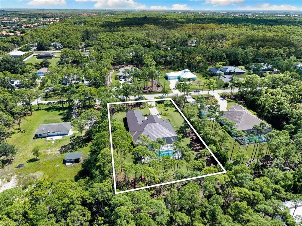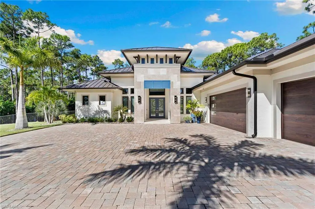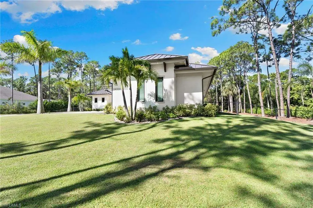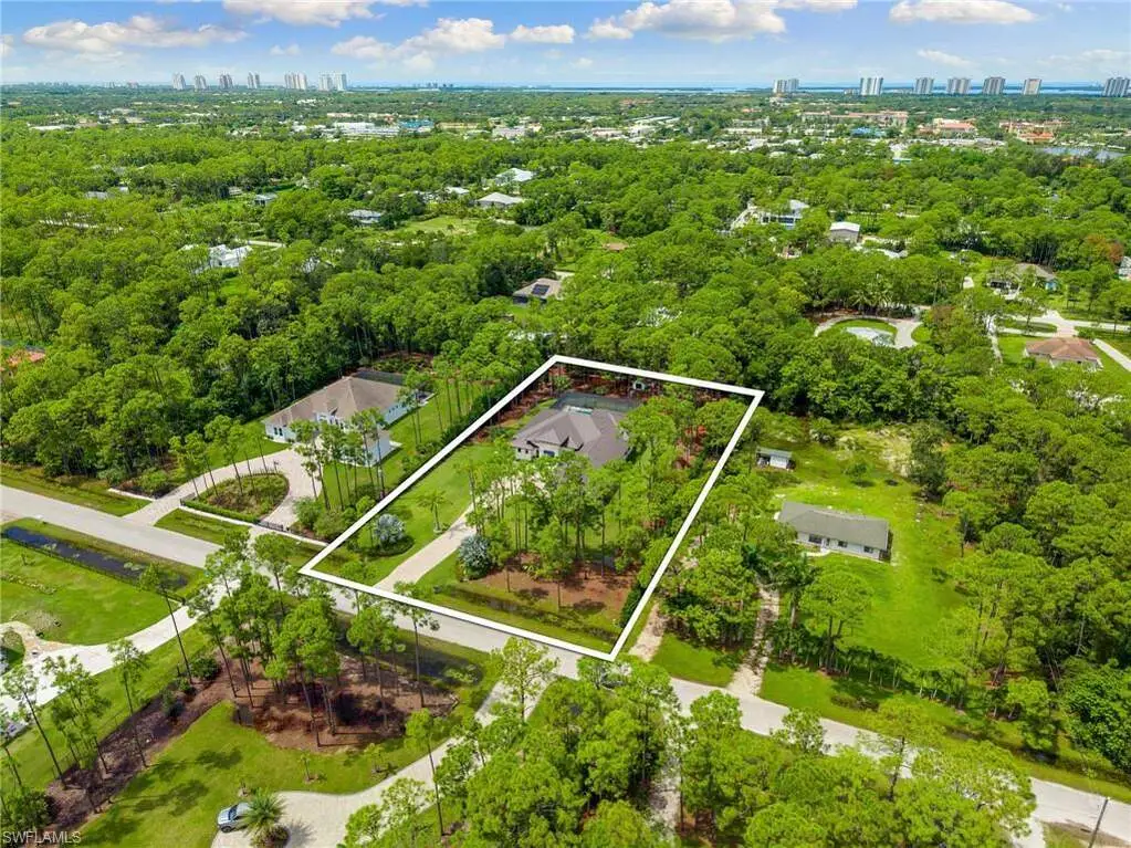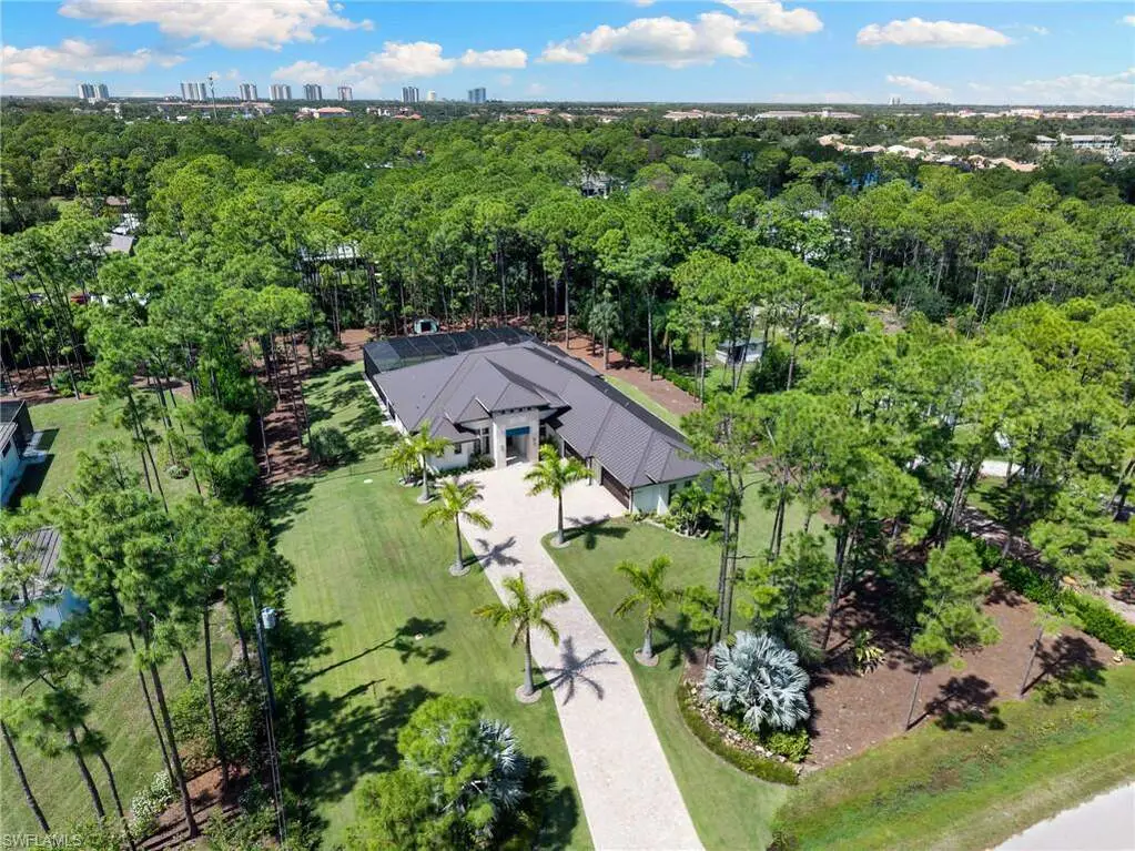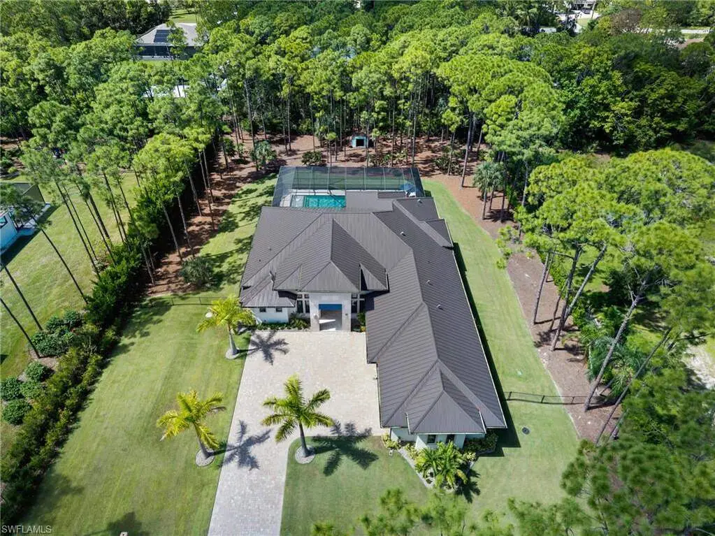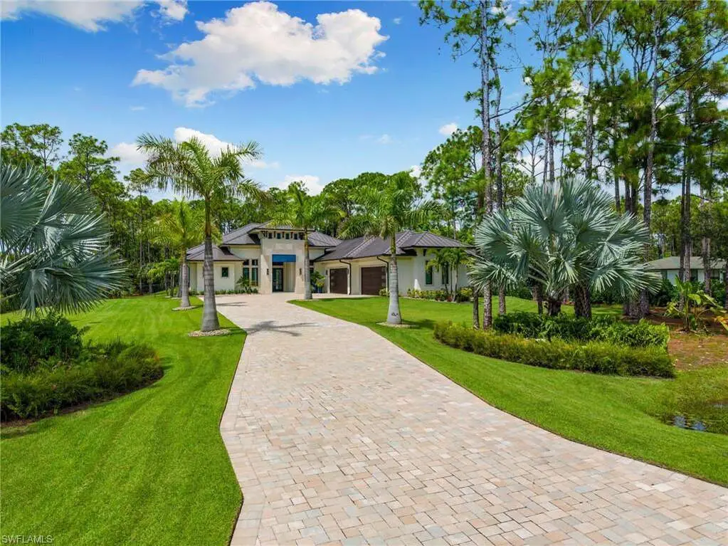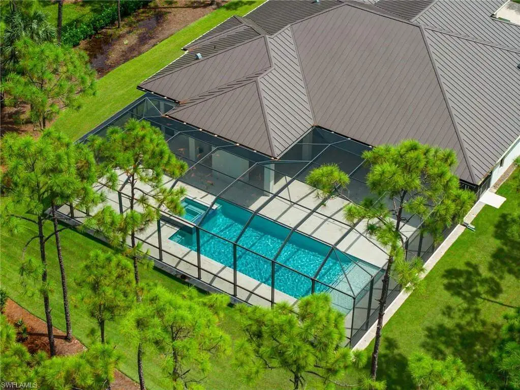STUNNING 2023 CUSTOM-BUILT LUXURY ESTATE SITUATED ON A SPRAWLING 1.25-ACRE LOT IN BONITA SPRINGS' COVETED "SAN CARLOS ESTATES!" Enjoy serene, wooded views and prime WEST EXPOSURE for breathtaking sunsets and prime sun over the pool. This contemporary residence features an exceptional open floor plan with 2,745 sq ft under air, offering 3 bedrooms + den, an oversized laundry/mud room that could be converted into a 4th bedroom, an oversized under-air storage room (ideal as a closet for the 4th bedroom), a spacious 4-car garage with room for a home gym, hurricane impact windows & doors throughout, whole-house generator, a metal roof & 2 A/C zones for optimal comfort. Every detail was carefully designed, from the wide-plank wood-look tile floors and soaring ceilings with wood-beam accents to the custom shaker-style doors with champagne hardware and designer LED lighting. The chef's kitchen boasts a gas range, quartz countertops with a matching backsplash, an oversized eat-in island, driftwood-style cabinetry with champagne fixtures, Miele & Monogram appliances, a walk-in pantry, and an adjacent wet bar with wine fridge. The fully pocketing sliders create a seamless indoor-outdoor flow, opening to a private oasis with a resort-style 38 ft long salt water pool (complete with tanning shelf and bubbler), spa, outdoor kitchen with gas grill, griddle & wine fridge, covered seating with fireplace, and expansive pool deck-perfect for entertaining and al fresco dining. The luxurious primary suite offers a spa-like bathroom with a modern free-standing tub, oversized walk-in shower with multiple shower heads, dual vanities with custom cabinetry, and a generous walk-in closet with center storage island. Impeccably landscaped, this estate is finished with a pavered driveway and stately front exposure. Residents of San Carlos Estates enjoy unparalleled space, privacy & nature with the best dining/shopping amenities just down the street. No HOA fees or rental restrictions! Peaceful living in a central location with easy access to US-41, Imperial Pkwy & I-75. 2 mins to the Promenade shopping/dining, less than 5 mins to Coconut Point, 15 mins to world-class beaches & 20 mins to RSW International Airport.