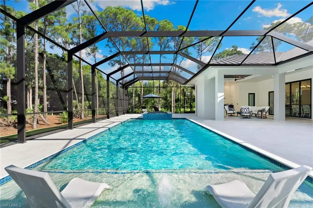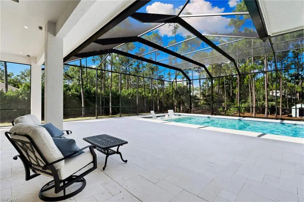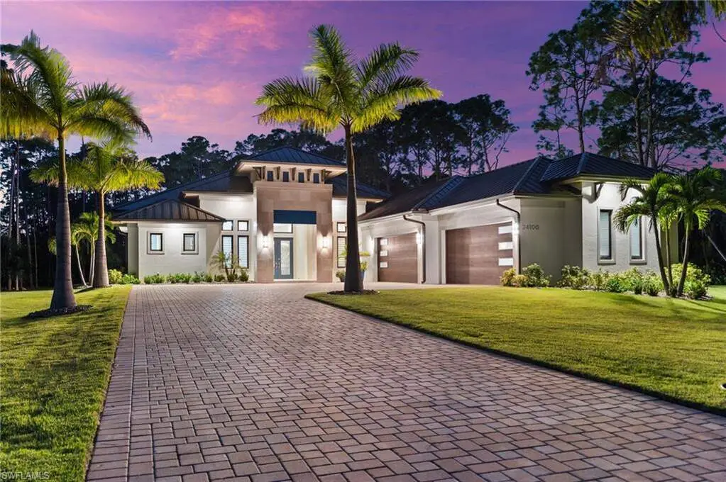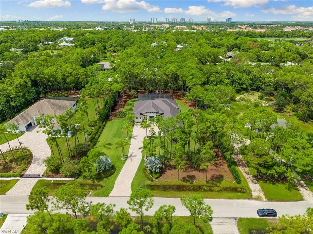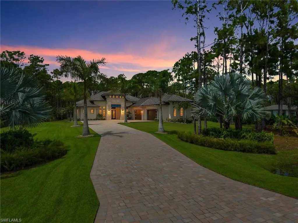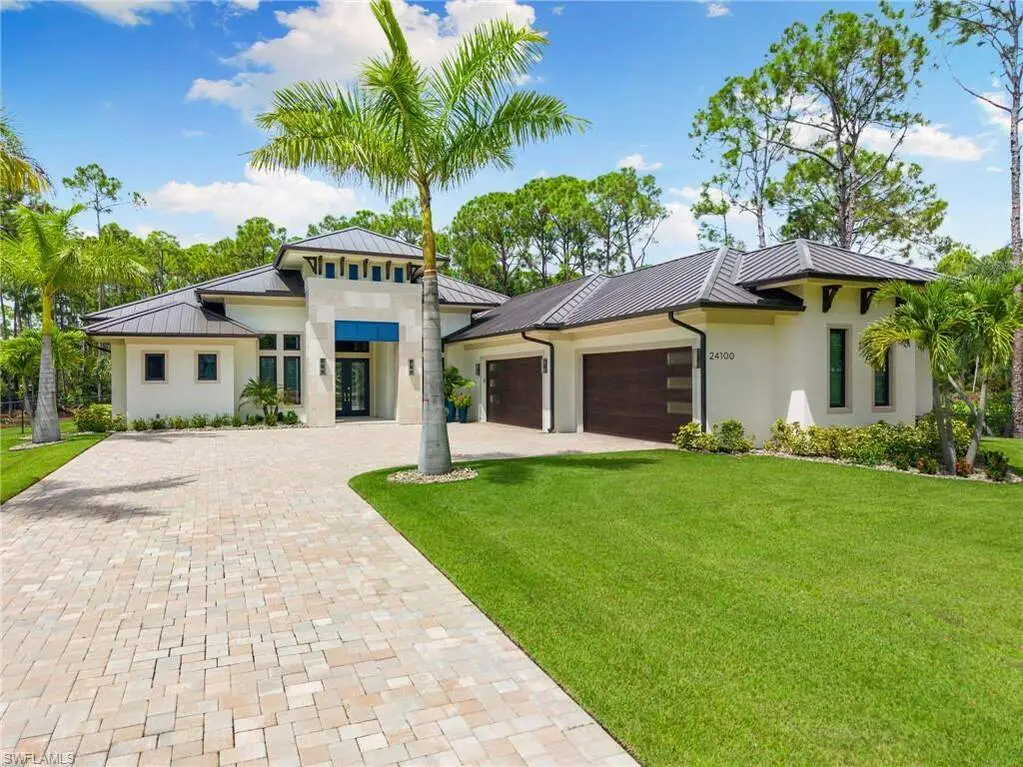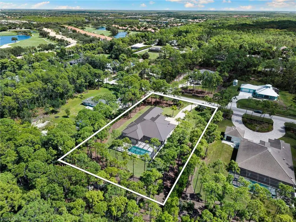 STUNNING 2023 CUSTOM-BUILT LUXURY ESTATE SITUATED ON A SPRAWLING 1.25-ACRE LOT IN BONITA SPRINGS' COVETED "SAN CARLOS ESTATES!" Enjoy serene, wooded views and prime WEST EXPOSURE for breathtaking sunsets and prime sun over the pool. This contemporary residence features an exceptional open floor plan with 2,745 sq ft under air, offering 3 bedrooms + den, an oversized laundry/mud room that could be converted into a 4th bedroom, an oversized under-air storage room (ideal as a closet for the 4th bedroom), a spacious 4-car garage with room for a home gym, hurricane impact windows & doors throughout, whole-house generator, a metal roof & 2 A/C zones for optimal comfort. Every detail was carefully designed, from the wide-plank wood-look tile floors and soaring ceilings with wood-beam accents to the custom shaker-style doors with champagne hardware and designer LED lighting. The chef's kitchen boasts a gas range, quartz countertops with a matching backsplash, an oversized eat-in island, driftwood-style cabinetry with champagne fixtures, Miele & Monogram appliances, a walk-in pantry, and an adjacent wet bar with wine fridge. The fully pocketing sliders create a seamless indoor-outdoor flow, opening to a private oasis with a resort-style 38 ft long salt water pool (complete with tanning shelf and bubbler), spa, outdoor kitchen with gas grill, griddle & wine fridge, covered seating with fireplace, and expansive pool deck-perfect for entertaining and al fresco dining. The luxurious primary suite offers a spa-like bathroom with a modern free-standing tub, oversized walk-in shower with multiple shower heads, dual vanities with custom cabinetry, and a generous walk-in closet with center storage island. Impeccably landscaped, this estate is finished with a pavered driveway and stately front exposure. Residents of San Carlos Estates enjoy unparalleled space, privacy & nature with the best dining/shopping amenities just down the street. No HOA fees or rental restrictions! Peaceful living in a central location with easy access to US-41, Imperial Pkwy & I-75. 2 mins to the Promenade shopping/dining, less than 5 mins to Coconut Point, 15 mins to world-class beaches & 20 mins to RSW International Airport.