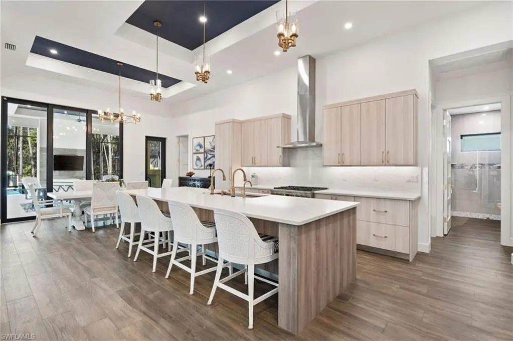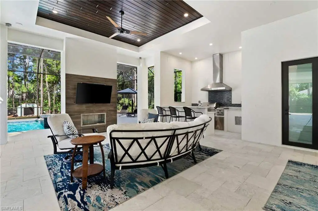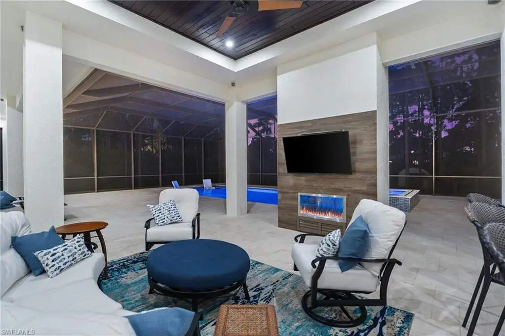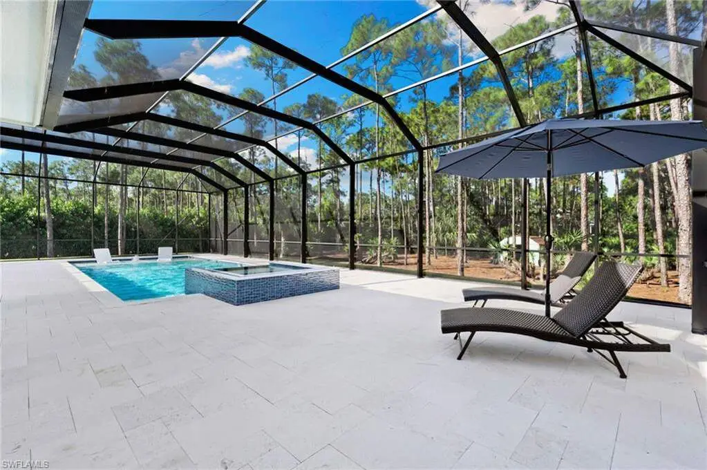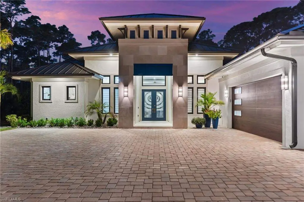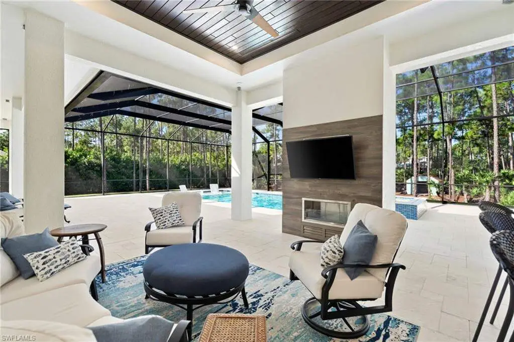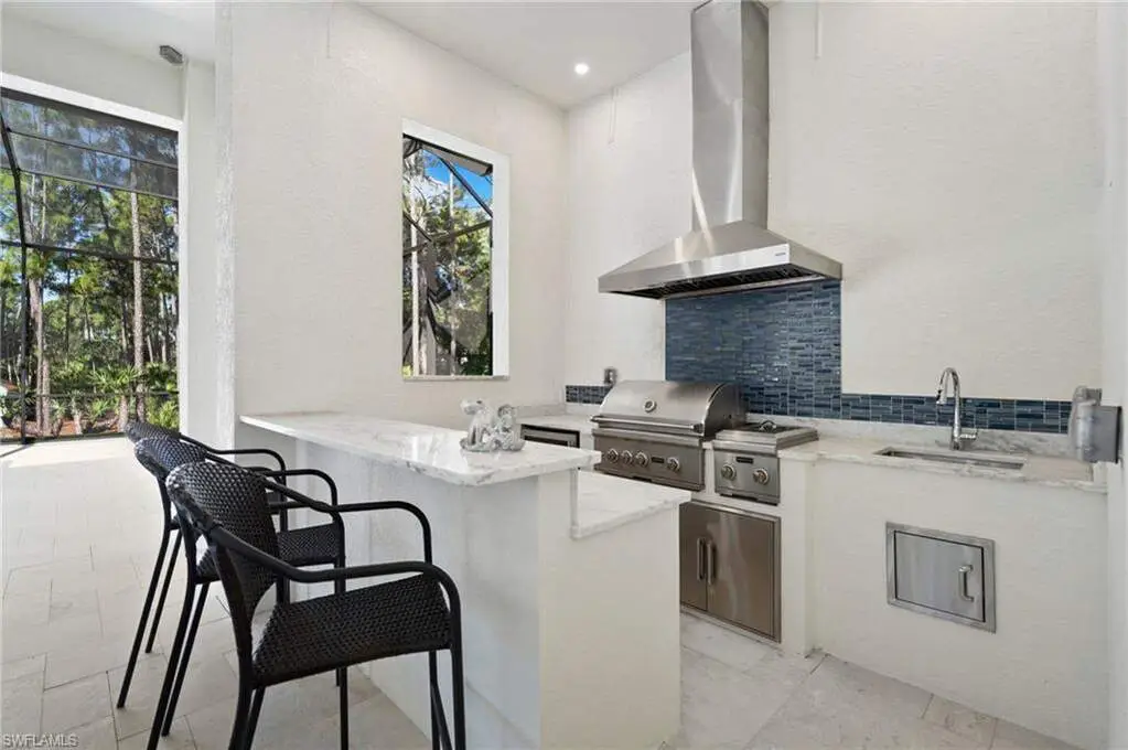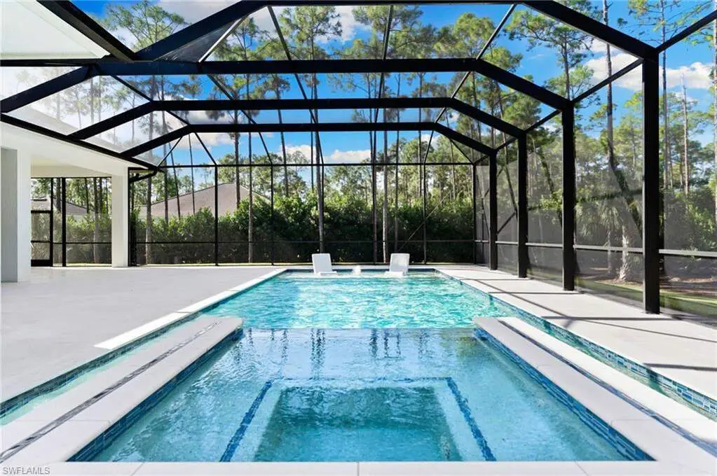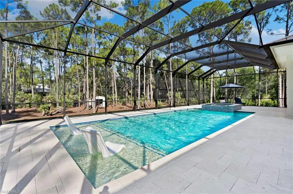 STUNNING 2023 CUSTOM-BUILT LUXURY ESTATE SITUATED ON A SPRAWLING 1.25-ACRE LOT IN BONITA SPRINGS' COVETED "SAN CARLOS ESTATES!" Enjoy serene, wooded views and prime WEST EXPOSURE for breathtaking sunsets and prime sun over the pool. This contemporary residence features an exceptional open floor plan with 2,745 sq ft under air, offering 3 bedrooms + den, an oversized laundry/mud room that could be converted into a 4th bedroom, an oversized under-air storage room (ideal as a closet for the 4th bedroom), a spacious 4-car garage with room for a home gym, hurricane impact windows & doors throughout, whole-house generator, a metal roof & 2 A/C zones for optimal comfort. Every detail was carefully designed, from the wide-plank wood-look tile floors and soaring ceilings with wood-beam accents to the custom shaker-style doors with champagne hardware and designer LED lighting. The chef's kitchen boasts a gas range, quartz countertops with a matching backsplash, an oversized eat-in island, driftwood-style cabinetry with champagne fixtures, Miele & Monogram appliances, a walk-in pantry, and an adjacent wet bar with wine fridge. The fully pocketing sliders create a seamless indoor-outdoor flow, opening to a private oasis with a resort-style 38 ft long salt water pool (complete with tanning shelf and bubbler), spa, outdoor kitchen with gas grill, griddle & wine fridge, covered seating with fireplace, and expansive pool deck-perfect for entertaining and al fresco dining. The luxurious primary suite offers a spa-like bathroom with a modern free-standing tub, oversized walk-in shower with multiple shower heads, dual vanities with custom cabinetry, and a generous walk-in closet with center storage island. Impeccably landscaped, this estate is finished with a pavered driveway and stately front exposure. Residents of San Carlos Estates enjoy unparalleled space, privacy & nature with the best dining/shopping amenities just down the street. No HOA fees or rental restrictions! Peaceful living in a central location with easy access to US-41, Imperial Pkwy & I-75. 2 mins to the Promenade shopping/dining, less than 5 mins to Coconut Point, 15 mins to world-class beaches & 20 mins to RSW International Airport.