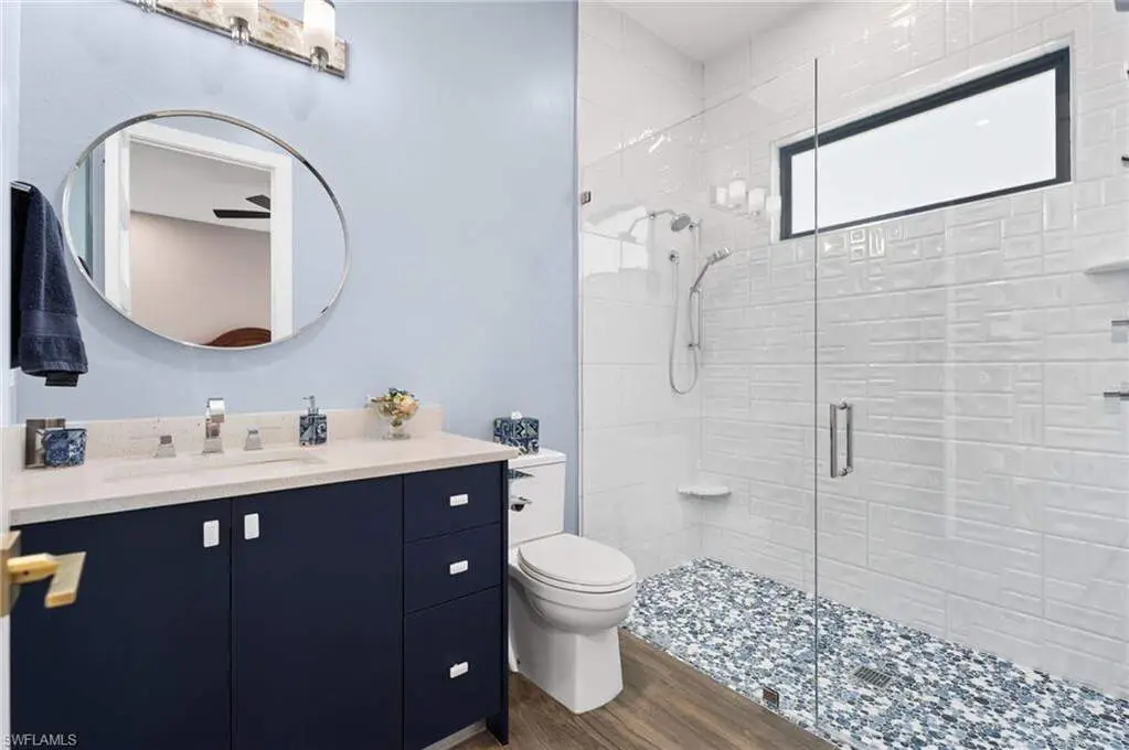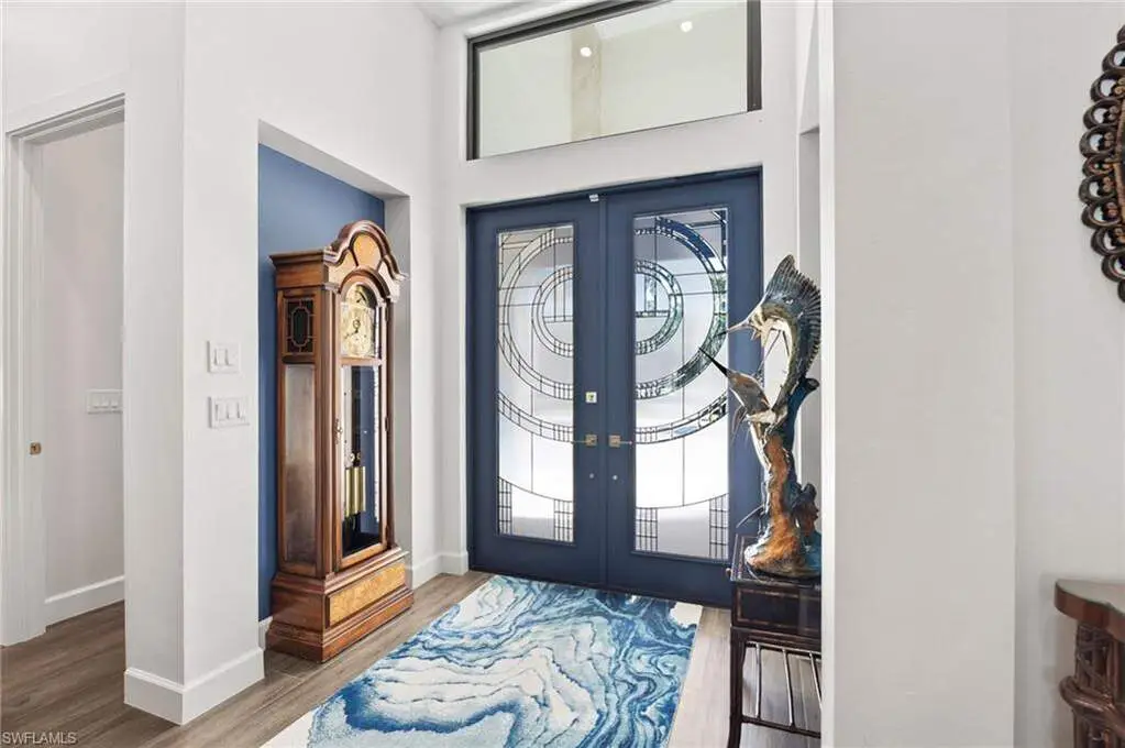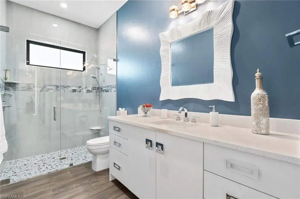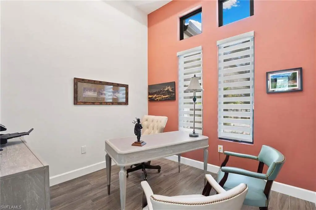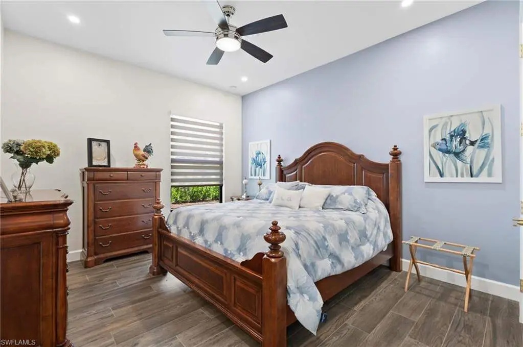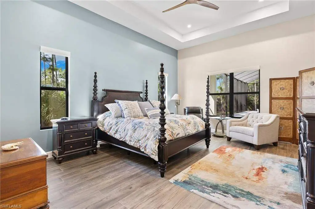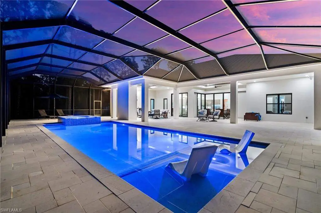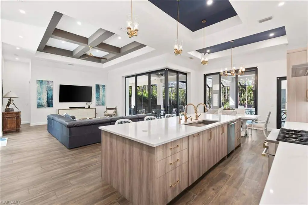 STUNNING 2023 CUSTOM-BUILT LUXURY ESTATE SITUATED ON A SPRAWLING 1.25-ACRE LOT IN BONITA SPRINGS' COVETED "SAN CARLOS ESTATES!" Enjoy serene, wooded views and prime WEST EXPOSURE for breathtaking sunsets and prime sun over the pool. This contemporary residence features an exceptional open floor plan with 2,745 sq ft under air, offering 3 bedrooms + den, an oversized laundry/mud room that could be converted into a 4th bedroom, an oversized under-air storage room (ideal as a closet for the 4th bedroom), a spacious 4-car garage with room for a home gym, hurricane impact windows & doors throughout, whole-house generator, a metal roof & 2 A/C zones for optimal comfort. Every detail was carefully designed, from the wide-plank wood-look tile floors and soaring ceilings with wood-beam accents to the custom shaker-style doors with champagne hardware and designer LED lighting. The chef's kitchen boasts a gas range, quartz countertops with a matching backsplash, an oversized eat-in island, driftwood-style cabinetry with champagne fixtures, Miele & Monogram appliances, a walk-in pantry, and an adjacent wet bar with wine fridge. The fully pocketing sliders create a seamless indoor-outdoor flow, opening to a private oasis with a resort-style 38 ft long salt water pool (complete with tanning shelf and bubbler), spa, outdoor kitchen with gas grill, griddle & wine fridge, covered seating with fireplace, and expansive pool deck-perfect for entertaining and al fresco dining. The luxurious primary suite offers a spa-like bathroom with a modern free-standing tub, oversized walk-in shower with multiple shower heads, dual vanities with custom cabinetry, and a generous walk-in closet with center storage island. Impeccably landscaped, this estate is finished with a pavered driveway and stately front exposure. Residents of San Carlos Estates enjoy unparalleled space, privacy & nature with the best dining/shopping amenities just down the street. No HOA fees or rental restrictions! Peaceful living in a central location with easy access to US-41, Imperial Pkwy & I-75. 2 mins to the Promenade shopping/dining, less than 5 mins to Coconut Point, 15 mins to world-class beaches & 20 mins to RSW International Airport.