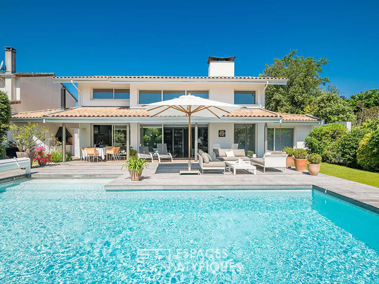 Immerse yourself in the luxury and tranquility of this magnificent 200 sqm architect-designed house, located in the heart of a vast, carefully landscaped garden. This unique property combines modern elegance, comfort and privacy. Upon entering, you will be greeted by a large entrance hall with plenty of practical storage space and a WC, offering a functional and well-designed space. The large living room is the heart of the house. It is decorated with a contemporary fireplace and opens onto the garden through large full-height bay windows, allowing natural light to bathe the interior while offering a breathtaking view of the green garden. The Bulthaup kitchen, independent and fully equipped, is accompanied by a laundry room and an adjoining pantry, providing additional storage space and facilitating daily organization. The expansive, single-storey master suite includes a large walk-in closet and en-suite bathroom with shower and bath, providing a luxurious and intimate relaxation space. Upstairs, a mezzanine overlooks the living room, adding a unique architectural touch and allowing access to two additional bedrooms. They share a bathroom with WC, offering comfort and practicality for residents or guests. Outside you will find a parking space on the front plot as well as a large double garage, providing convenient and secure parking solutions. The landscaped garden is a true green setting, with a heated swimming pool not overlooked, perfect for moments of relaxation and swimming in complete privacy. This architect-designed house is a jewel that combines modernity, comfort and nature, offering an exceptional living environment for those looking for an elegant and peaceful residence. ENERGY CLASS: C / CLIMATE CLASS: C. Estimated average amount of annual energy expenditure for standard use, established based on energy prices for the year 2021: between 1300 and 1820 euros. Additional information * 4 rooms * 3 bedrooms * 1 bathroom * 1 bathroom * Floor : 1 * Outdoor space : 700 SQM * Parking : 1 parking space * Property tax : 3 614 €
