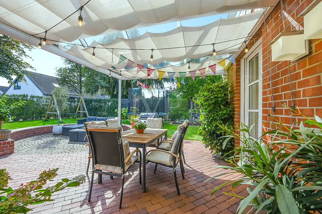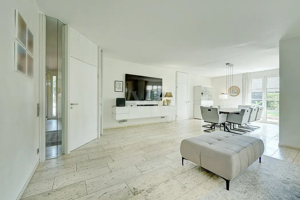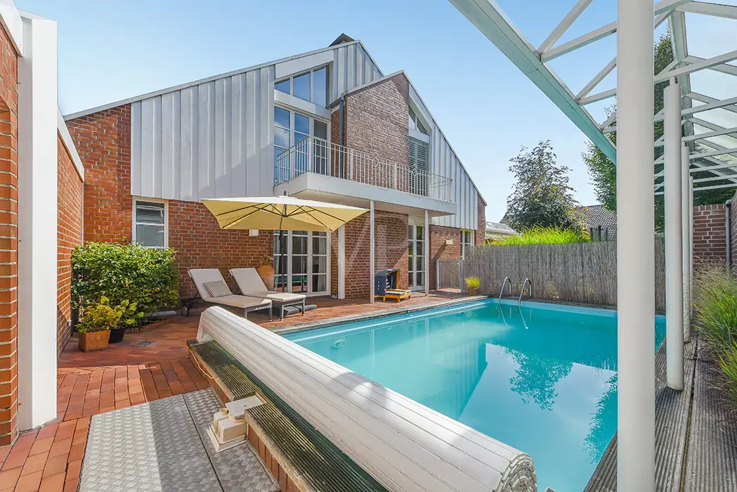 As soon as you enter, you will feel the spaciousness and warmth that this detached house radiates. With approx. 246 m² of living space and a lovingly landscaped plot of around 751 m², this is a place where you will want to come and stay. The house has been continuously modernized and was last staged in 2023 - a home that harmoniously combines tradition and modern living comfort. The heart of the house awaits you on the first floor: a spacious living and dining area with an open-plan design that conveys a feeling of freedom and togetherness. Large windows let your gaze wander into the idyllic garden and create a seamless connection between inside and outside. From here, you enter the sun-drenched terrace - your personal space for relaxing evenings or social gatherings. In summer, the pool invites you to enjoy refreshing moments - a real highlight for the whole family. The kitchen, which is both practical and cozy, quickly becomes the hub of everyday life. With the dining table at the back, the kitchen is as functional as it is charming. Further along the hallway, you reach the office with access to the pool. You then enter the utility room and another bathroom with shower. A guest WC rounds off the space on the first floor. Three inviting bedrooms await you on the upper floor, creating retreats for the whole family. Whether as a master bedroom, children's room or home office - there is space here for your individual living ideas. The two modernized bathrooms - some en suite - offer elegant sanitary elements and high-quality fittings. The separate sauna with bath provides a spa feeling in your own home. The fitness room in the basement offers further variety at any time of day. The property is also technically impressive: comfortable underfloor heating on the first floor, modern radiators in the attic and reliable gas heating, which was renewed in 1998. The comprehensive renovation in 2009 and the garden design in 2019 underline the well-kept and high-quality overall impression. The outdoor area is a true paradise: Whether a play and leisure area for children, cozy retreats in the greenery or relaxing hours by the pool - every member of the family will find their favourite spot here. There are practical and sheltered parking spaces for your vehicles right next to the house. This detached house combines everything that makes living special: spaciousness, comfort and an ambience that invites you to feel at home. Here you will not just find a house - here you will find a home. Last but not least, the technical equipment should be emphasized, the PV system with 25 kWp, 19.5 kWh storage capacity and emergency power capability. The property is available by arrangement. We would be happy to send you a detailed exposé with pictures and are of course also available for an individual viewing appointment. We look forward to your inquiry.