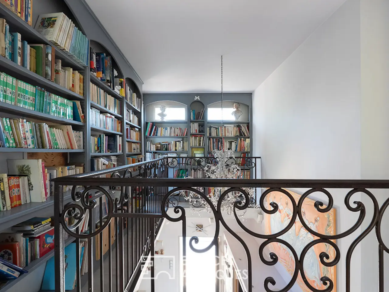 The entrance reveals generous volumes bathed in light. The main living room, highlighted by large bay windows, opens onto vast terraces which naturally extend the interior spaces. The noble materials - stone, solid wood, handcrafted ironwork - reflect quality of execution and attention to detail. The independent kitchen, both convivial and functional, is part of an elegant and sober atmosphere. Two master suites, each with a dressing room and a private bathroom, offer total comfort and direct access to the garden. Upstairs, a vast library landing distributes three bright bedrooms, a bathroom, a shower room and a terrace overlooking the property. The generous openings reveal an unobstructed view of the park, giving the whole a real feeling of space and serenity. The full basement accommodates a spacious office, a laundry room, a workshop, a cellar, a pantry and a home cinema room with an adjoining shower room. Each space has found its rightful function, serving daily comfort.