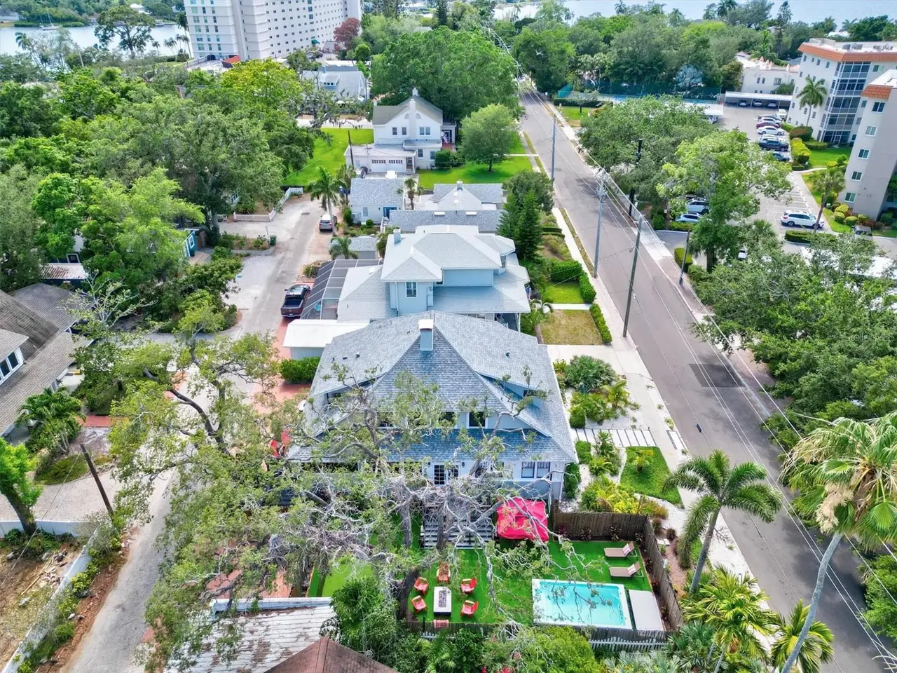 Immerse yourself in the rich history and timeless elegance of this meticulously renovated historic home located in the heart of Point Pleasant in downtown Bradenton. This distinguished two-story, 4-bedroom, 5-bathroom American Four Square home offers a harmonious blend of classic architectural charm and contemporary luxury. Originally built in 1913, the Betts House stands as a testament to Bradenton's storied past, with every detail meticulously preserved and enhanced for modern living. The newly landscaped front yard leads to the inviting, large wrap-around porch evoking a sense of nostalgia, reminiscent of days gone by. The grand living area has the original leaded windows with a fireplace and leads to both the family room and kitchen. The spacious family room has impact windows and a convenient full bath with the stairway leading to the four bedrooms and four additional baths. The remodeled kitchen and dining area is an open and inviting space overlooking the side yard. Crafted with care, the kitchen features impact windows, KraftMaid cabinetry, new LG appliances, a Bosch paneled dishwasher, exquisite butcher block counters, and complemented by an island topped with Dekton Entzo quartz. The large dining area still has the vintage leaded windows and leads to the impressive added butler's pantry that was formerly a side porch. It offers a wine refrigerator, two refrigerated drink drawers, a sink, and additional cabinetry also with Dekton Entzo quart. This area offers a seamless transition between indoor and outdoor entertaining. Once upstairs, you will find three bedrooms with three remodeled ensuite baths and a fourth bedroom serviced by an updated hall bath. The added primary bath has a spacious walk-in shower, dual vanities, and a private water closet. Step outside and discover a private oasis, complete with a composite side deck, rebuilt back porch, and a partially submerged 15'x8'x5' dual swim jet lighted Swim Spa. Practice your putting skills on the professionally installed 4-hole putting green, surrounded by lush artificial turf and expertly landscaped gardens. After a busy day, relax by the gas fire pit or rinse off in the outdoor shower before your resistance swim. Enjoy privacy with new bamboo fencing and landscape lighting, while the addition of string lighting illuminates the side yard for enchanting evenings under the stars. Thoughtful updates include a new roof in 2022, a replacement of the upstairs HVAC unit in 2023, 16 new impact windows, and a complete refinished and staining of wood floors, stairway, and handrails. In addition, the interior has been freshly painted and has new light fixtures and new window treatments throughout. Perfectly situated a very short distance from historic Old Main Street with its charming shops, bars, and restaurants as well as the marina, Manatee River, and the Riverwalk. The Betts House offers unparalleled access to the best of Bradenton's waterfront living. Experience the perfect harmony of history and modern comforts by discovering the timeless allure of this exceptional residence.