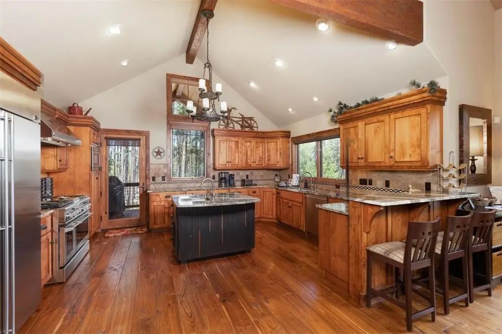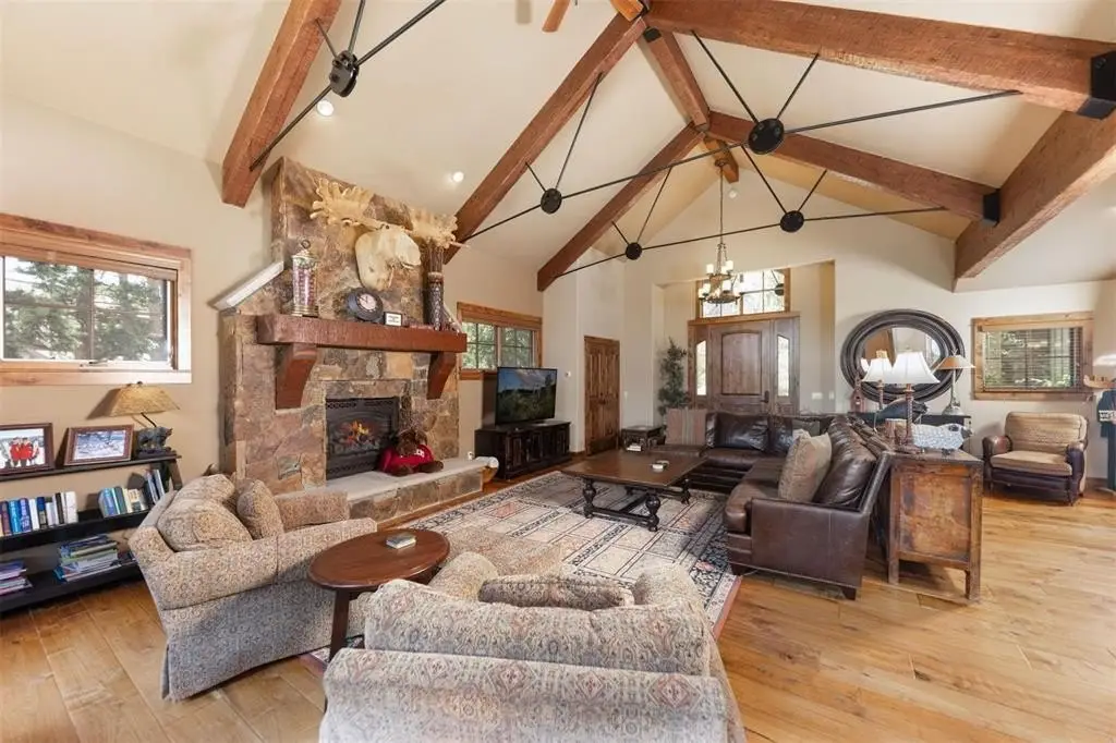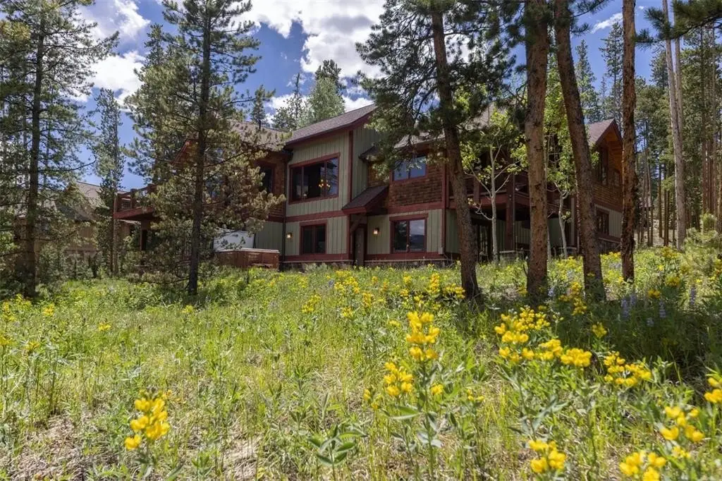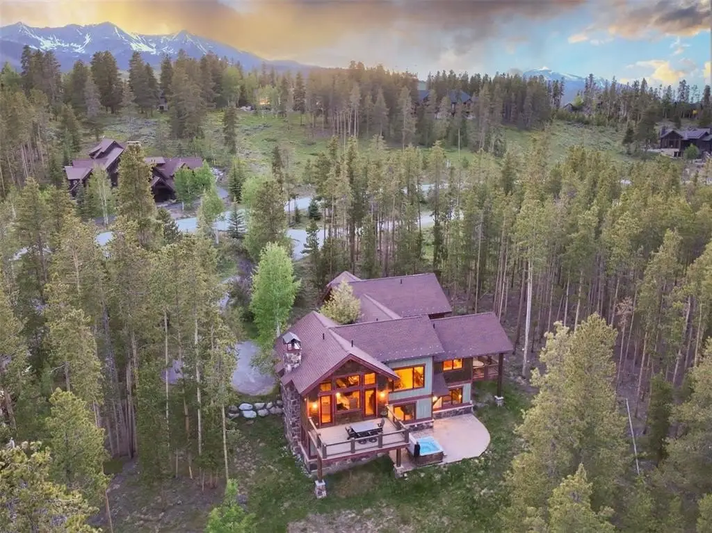 This classic mountain home is set low off Highlands Drive, nestled among protected trees and offering a rare combination of easterly mountain views and frontage along the iconic Jack Nicklaus–designed Breckenridge Golf Course. Overlooking holes 3 and 4 of the Beaver Course, the setting is private, picturesque, and serene. Inside, iron, stone, and wood elements create a bold first impression. Walnut floors span the main level, where a vaulted great room centers around a gas fireplace and expansive windows that bring the outdoors in. The layout flows easily into the dining area and well-equipped kitchen, featuring a gas range, custom hood, dishwasher, prep sink in the island, and a second sink by the window that perfectly frames the mountain scenery. Just off the kitchen, a covered deck is perfect for year-round use. The primary suite spans its own floor, complete with a private balcony, gas fireplace, office nook, walk-in closet, and a spacious bath with jetted tub, steam shower, and double vanity. The lower level is designed for comfort and entertaining, featuring a spacious family room where a wet bar with beverage fridge complements the cozy gathering space. Three additional bedrooms are located on this level—including two bedroom suites and a bunk room. Just outside, a private patio with a hot tub invites you to unwind and take in the peaceful alpine surroundings amidst the golf course.