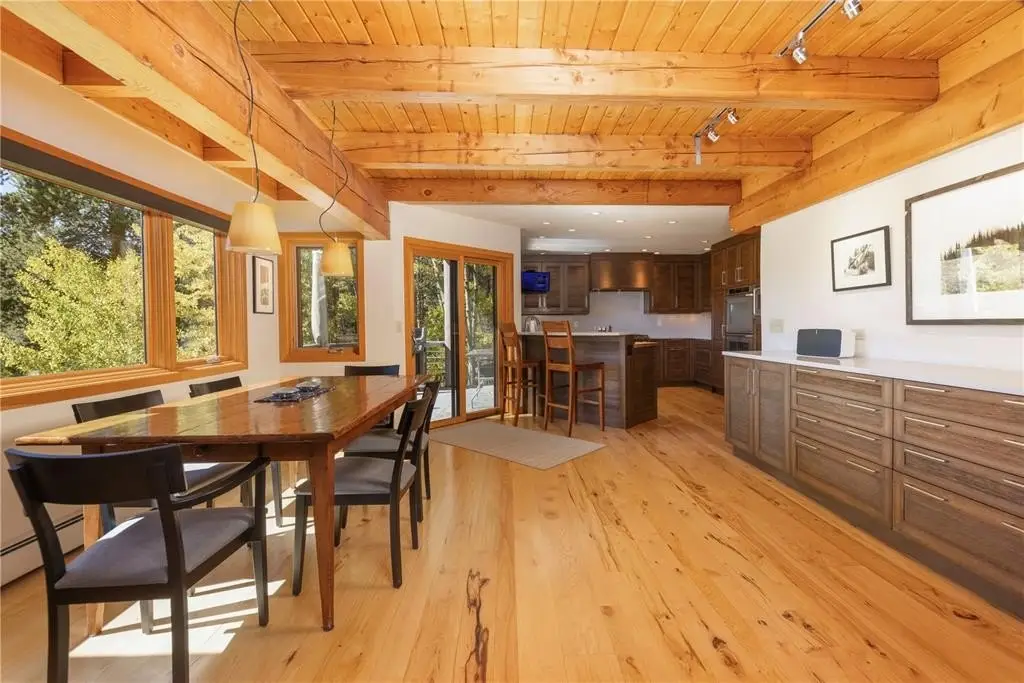 Nestled in a serene forest of aspens and evergreens, this 4-bedroom, plus office, contemporary mountain retreat in Breckenridge captures the essence of Colorado living. Bathed in passive solar light, the home offers breathtaking views of ten iconic peaks, including Quandary, Peak 10, Baldy, Red, and Hoosier Ridge. Set on 1.2 acres, the property has been thoughtfully updated with newer carpet, fresh exterior paint, a newer roof, expanded driveway, and newer front entry stairs, decks and exterior staircases. Inside, the heart of the home is a fully remodeled chef’s kitchen featuring William Ohs custom cabinetry, a Subzero refrigerator, gas cooktop and double oven, and old-growth Hickory floors that flow into the dining area. Step out onto the adjacent deck for grilling with a BBQ directly connected to the gas line, perfect for entertaining under the stars. A Danish soapstone wood-burning stove anchors the main living room, and adjacent you will find a private office including a cozy reading nook and inspiring views of Baldy, while a secondary family room on the lower level opens to a sun-drenched deck ideal for morning coffee or afternoon lounging. The spacious attached garage includes storage cabinetry and a dedicated workshop. With panoramic views and a quick walk to the bus stop, this property offers it all. Whether you're seeking solitude, adventure, or a place to gather, this home provides a rare blend of craftsmanship, comfort, and alpine beauty.