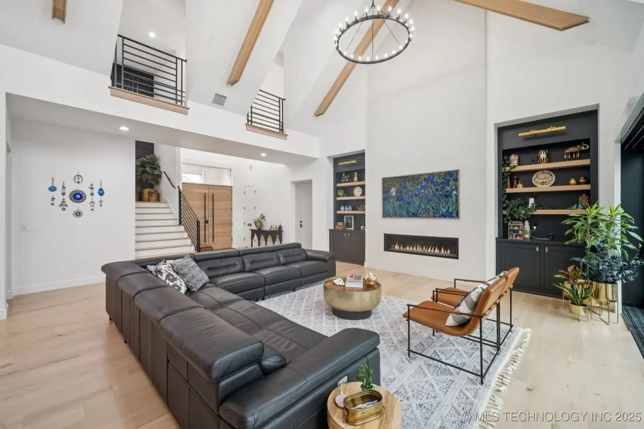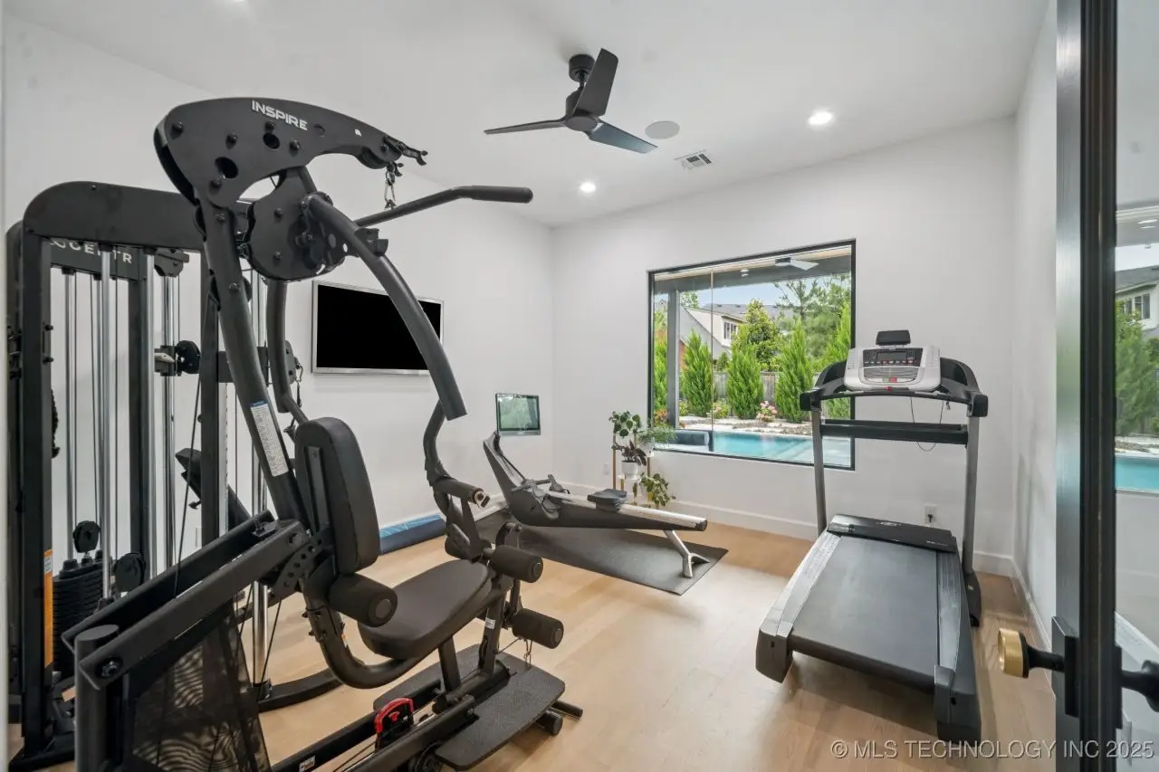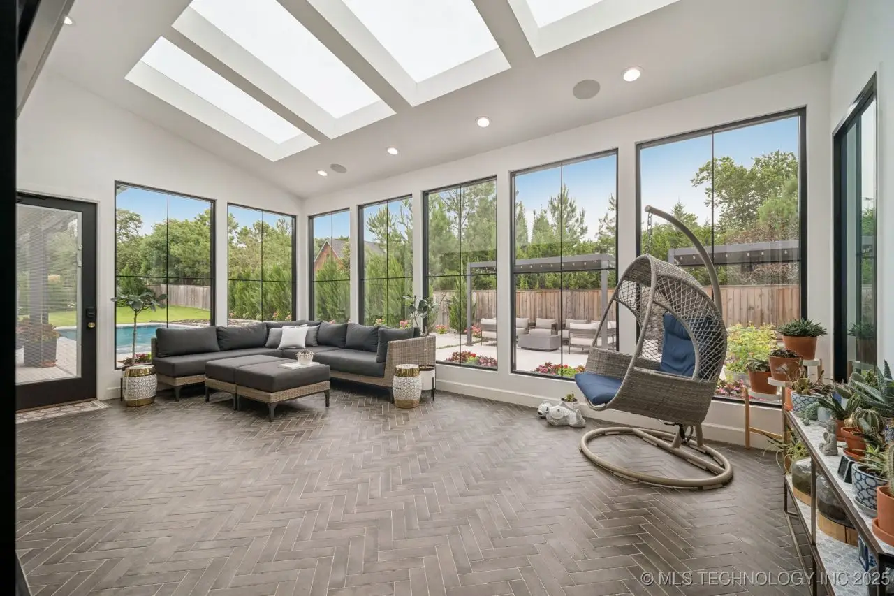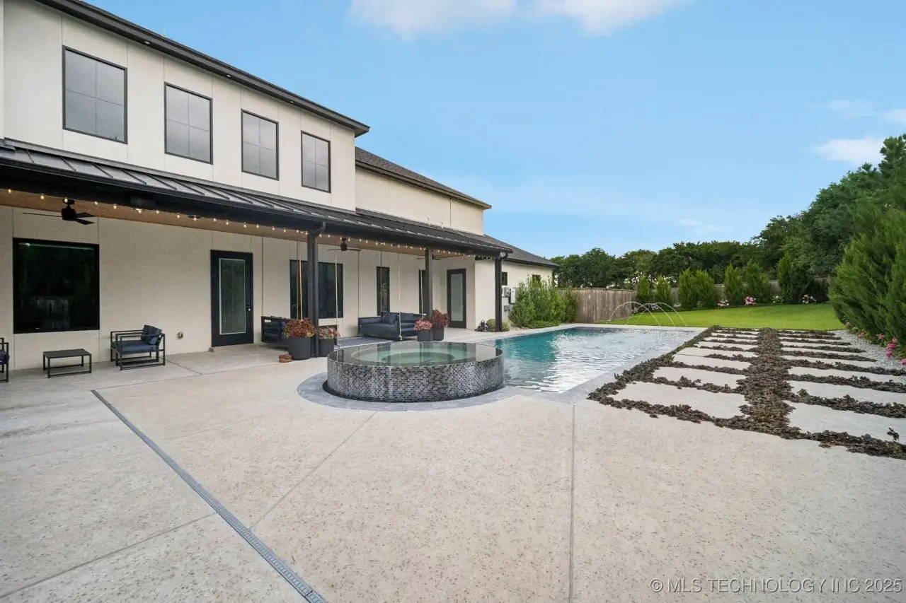 Modern Eco-Luxury Smart Home with Solar, Tesla Powerwall, Pool & Resort-Style Outdoor Living Completed in 2023, this modern estate combines contemporary elegance, energy efficiency, and future-ready technology. A striking exterior and lush evergreen landscaping welcome you inside, where soaring ceilings and floor-to-ceiling windows fill the home with light. The main level offers a designer kitchen with Thermador appliances, reverse osmosis system and a Scullery-style prep kitchen - a fully equipped second kitchen tucked away for cooking perfect for both everyday living and entertaining. Flexible living spaces include 5 bedrooms (all with ensuite baths + walk-in closets), 6 bathrooms, office, gym, an all-season enclosed sunroom designed to enjoy the changing scenery year-round, theater with wet bar, game room, hobby room, and dual laundries. A future elevator shaft and storm shelter add comfort and peace of mind. Step outdoors to a private resort retreat: sleek pool with spa, shaded pergolas, outdoor kitchen, covered patios (including a private patio off the primary suite), mature oak trees, raised garden beds, fruit trees, and drip irrigation. Smart features include rooftop solar panels, Tesla Powerwall, whole-home audio, integrated security with surveillance, motorized shades, wall iPorts, and EV-ready outlets in the oversized epoxy-finished 4-car garage. Located in the award-winning Bixby School District, this property blends sustainability, innovation, and luxury into one lifestyle. Special Features: Solar Panels Tesla Powerwall EV Charging / 4 car Smart Home Whole-Home Audio Motorized Shades Chef's Kitchen + Full Prep Kitchen / Pantry Theater Gym Sleek Pool & Spa Outdoor Kitchen Pergolas Seamless Indoor / Outdoor living Storm Shelter Future Elevator Shaft Dual Laundry Irrigated Raised Gardens Private Primary Patio. Be sure to view the video (https://iframe.videodelivery.net/5d62837dbdb4c3eabbff880f08a89753)
