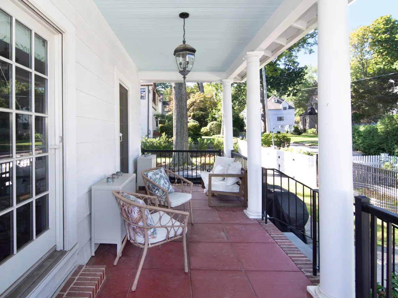 A movie set setting! This stunning white Colonial sits on beautiful corner lot fenced in with white picket fencing and new landscaping. The charming stone patio makes for a tranquil oasis for all to enjoy. This immaculate home features three bedrooms, two full baths and two half baths. The well appointed chef's kitchen boasts a Viking range, gorgeous Minuet Quartzite countertops & elegant backsplash. It also includes island seating, beverage refrigerator, ice maker and white cabinetry-perfect for entertaining. The adjoining family room is bright and airy, seamlessly connected to the kitchen for easy everyday living. The home's living room has new custom cabinetry and a work from home alcove. Two French doors lead to the covered patio-ideal for inside/outside living at its finest! The formal dining room is the perfect space for gatherings for a crowd. Upstairs, the second floor offers a spacious primary bedroom with custom cabinetry along with two additional bedrooms. Each features with custom fitted closets. The third floor provides versatile bonus space and includes a beautifully appointed bathroom with a steam shower. The lower level is a great space for an exercise gym or a playroom! Located within walking distance of all that Bronxville Village has to offer and just 0.9 mile for the Bronxville Metro-North station, this home is the perfect blend of elegance, comfort and convenience.