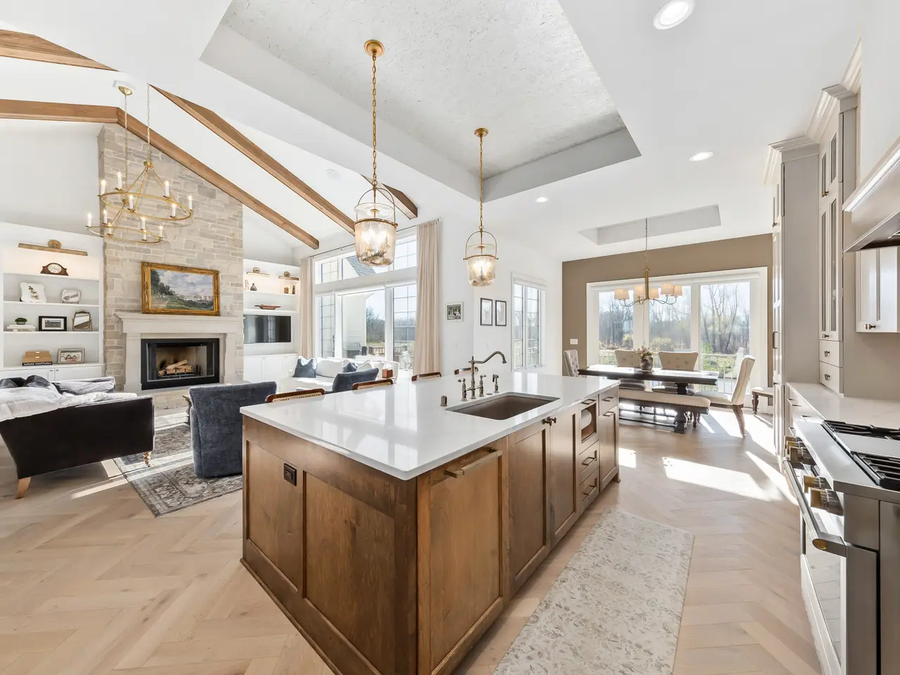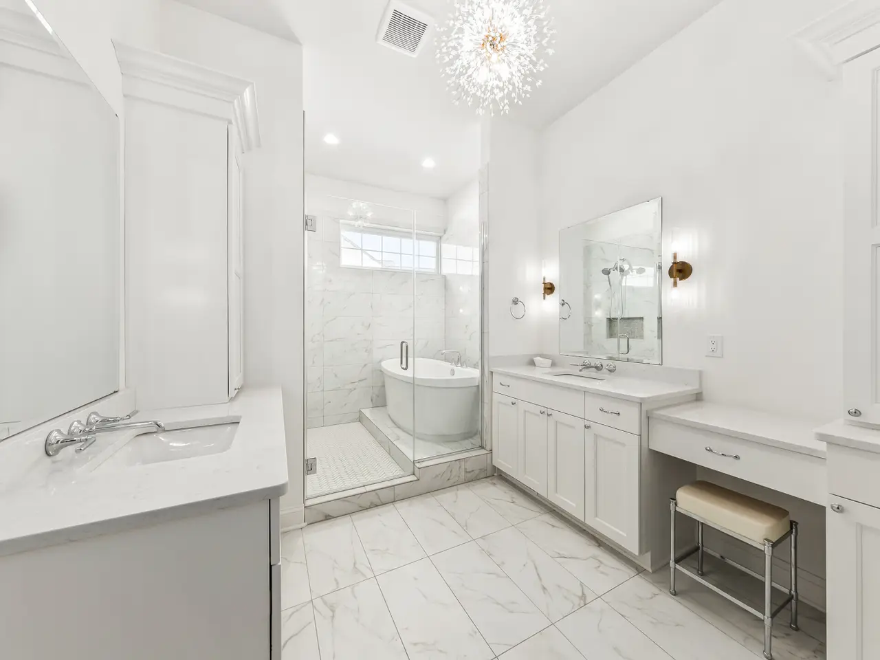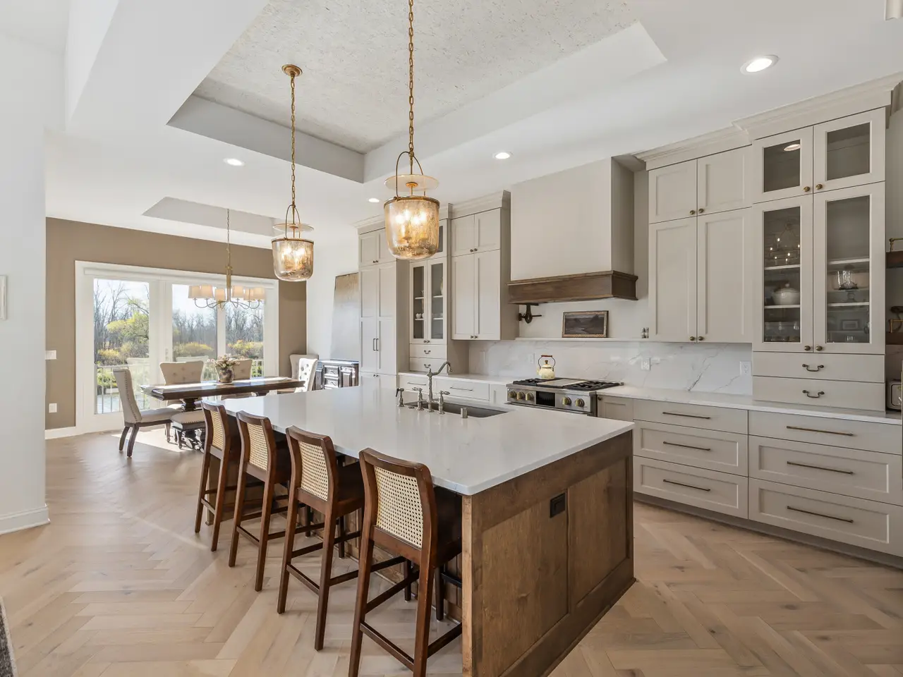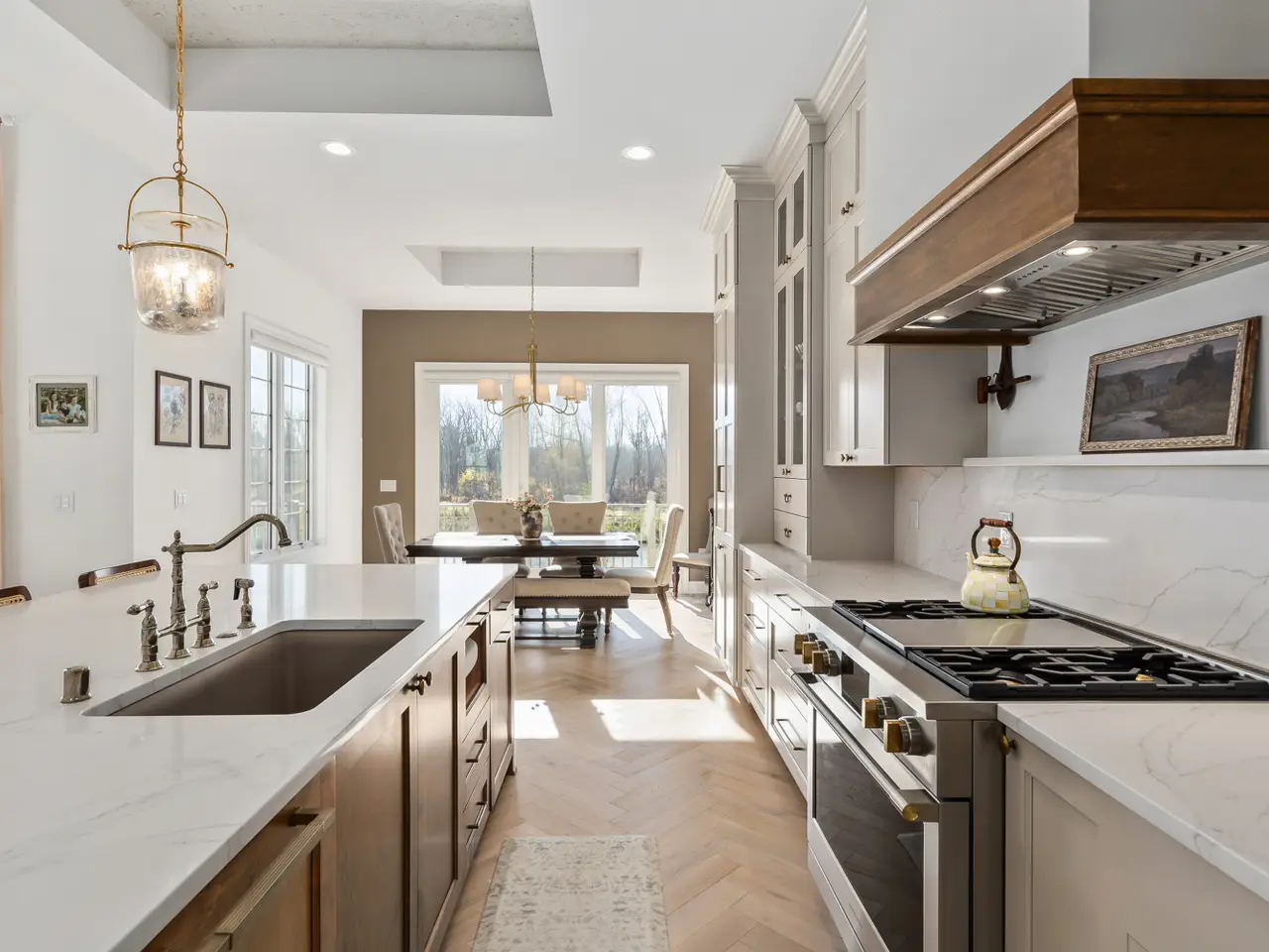 Welcome to this 2024 custom masterpiece in the Elmbrook School District, where no detail was overlooked. A double-arched front entry framed by stone courtyard walls sets the tone for the craftsmanship inside. Anderson 400 Series casement windows fill the home with light, showcasing quartz surfaces and custom millwork throughout. The mudroom features custom lockers and a tiled dog shower, while a bonus office above the garage offers built-ins with leather pulls and a hidden entry to a private golf simulator. The primary suite opens to a serene screened-in porch. The finished lower level includes custom built-ins, a snack bar, guest suite, full bath with sauna across from the gym, a built-in playhouse, bonus playroom, and a sunken theater area. Every inch of this home blends thoughtful design with luxury and comfort.