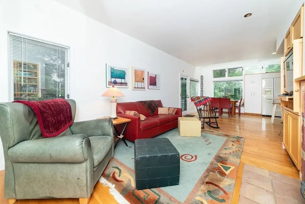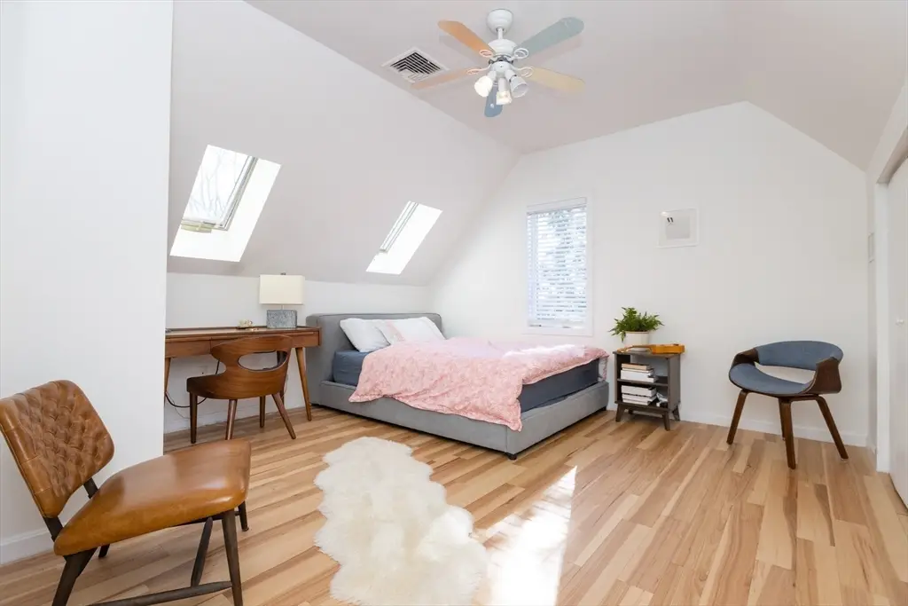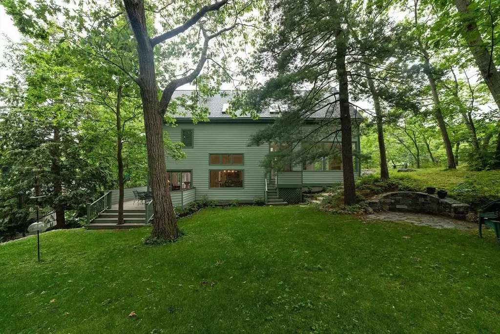 Impressive, custom built contemporary home on an expansive half acre+ wooded lot on tree lined street in Chestnut Hill. Designed by Harvard architect Mollie Moran includes sweeping 10 ft. cathedral ceilings & window walls overlooking lush park like multi level landscape. Elegant living room with marble wood burning fireplace accented with a wall of built-ins & a stunning entertainment sized dining room. Spacious, eat-in kitchen with built in window seat looks out onto private front deck. Adjoins a comfortable family room with wood burning stove & exits through triple patio door to another private deck. Second level includes two bedrooms, a bath & multiple closets with laundry. Also a king size en-suite primary bedroom & an additional office or media room that could easily be used as a bedroom. The third floor suite is perfect for teen or au pair. This is a one of a kind property! 2018 roof, high efficiency HVAC system & more. This is a must see.
