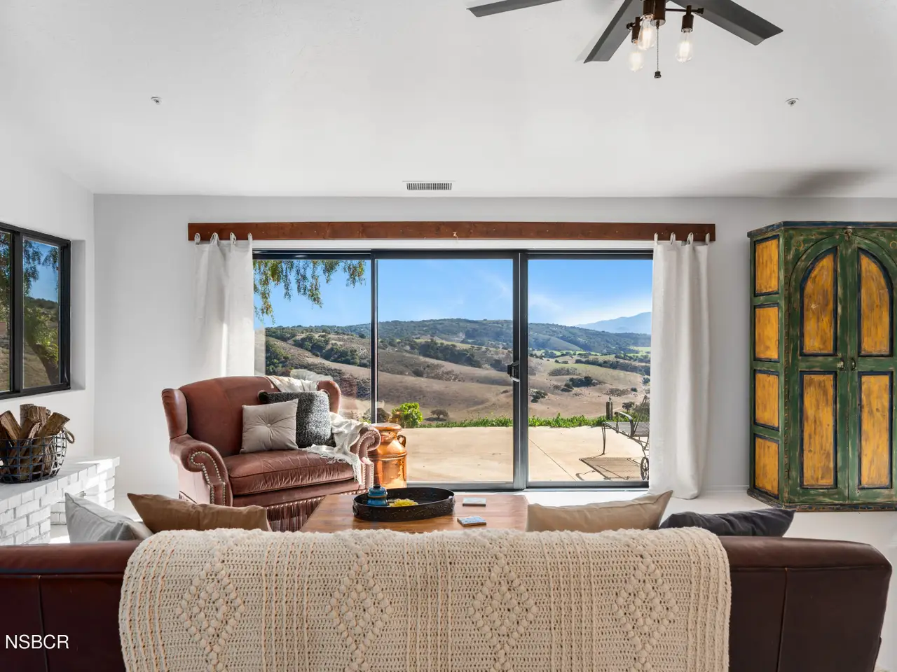 Soar with the hawks and watch the deer roam across your hillside from this peaceful 20-acre sanctuary in the gated Jonata Springs Ranch. Surrounded by breathtaking mountain and valley views, this tranquil retreat offers a rare blend of natural beauty, privacy, and access to over 10 miles of deeded equestrian trails.Bathed in natural light, the home's open great-room design creates a seamless flow to the expansive patio--perfect for morning coffee, sunset gatherings, or simply breathing in the stillness of the valley. The renovated kitchen features custom Mexican tilework, upgraded appliances, and classic Saltillo tile floors that add warmth and charm. Two ensuite bedrooms offer comfort and privacy, while a third room - used as an office--has a private entrance ideal for creative work or flexible living. The home includes owned solar panels with battery back up for energy efficiency and sustainability, plus ample space to add a barn, ADU, or pool. Set along private Falcon Ridge Lane and supported by one of the Santa Ynez Valley's most reliable private water companies, this property is a perfect pied-a-terre, tranquil country retreat, or full-time sanctuary surrounded by nature and wildlife--a place to slow down, reconnect with nature, and find your inner calm. For additional Jonata Springs Ranch information visit jonatasprings.org
