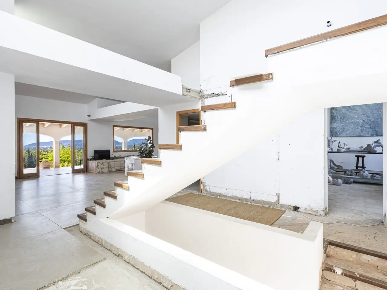 This currently three-bedroom villa is located in Sa Coma, approximately fifteen minutes drive from Palma. It offers breathtaking views of the Tramuntana mountains and the Bay of Palma. Most of the work has already been done, now the final design can be done, giving the future owner the opportunity to finish it to his liking. The villa has a living area of 338 m2 and includes an open-plan living room with dining area and kitchen, three bedrooms, two bathrooms and several additional rooms such as a large and bright art studio. The basement is currently converted into a cozy apartment with an open kitchen, one bedroom and access to the pool and the beautiful terrace with sea and mountain views. The property also has a garage and a roof terrace.