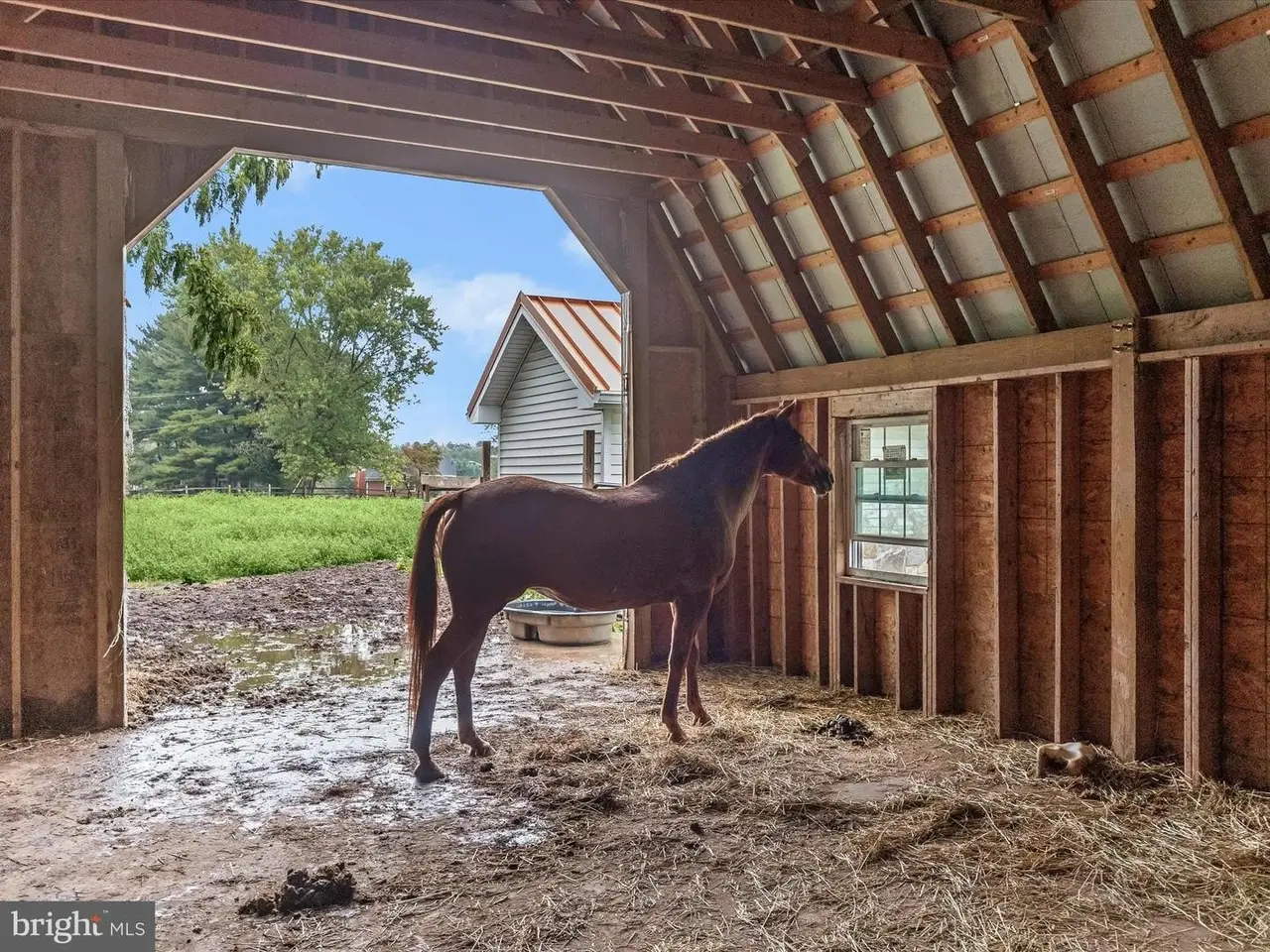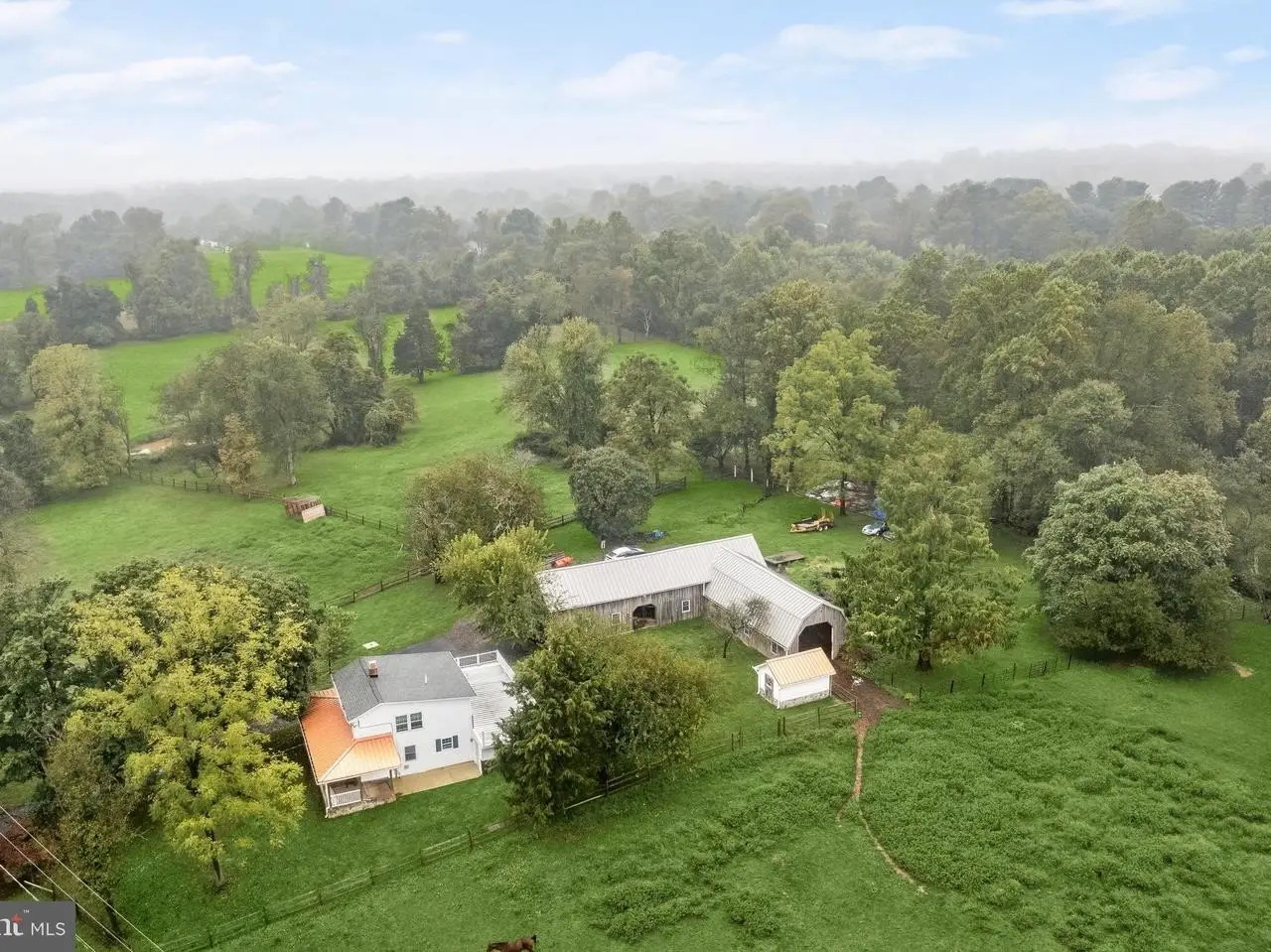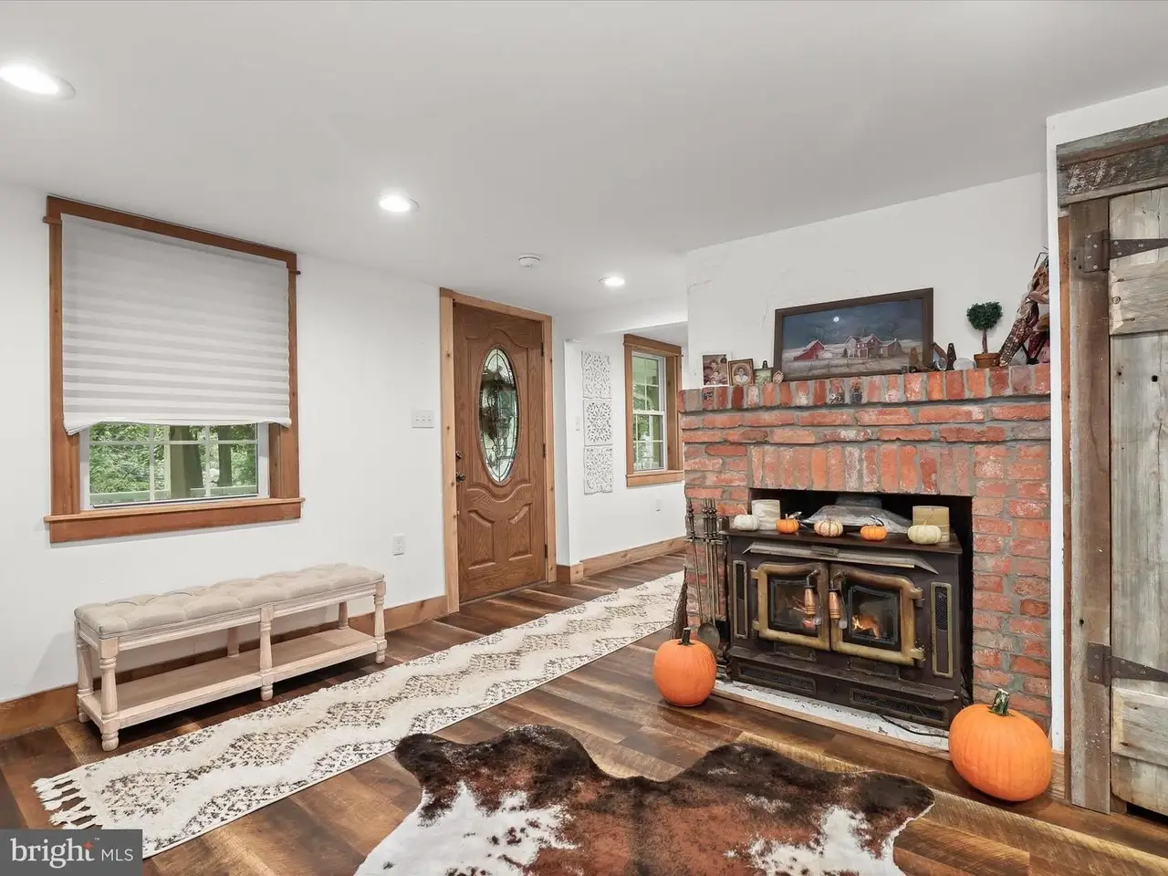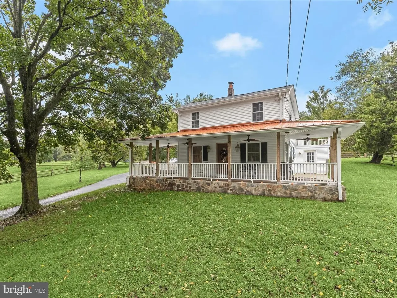 Nestled on a picturesque 10.86-acre pastoral lot, this charming farmhouse offers the perfect blend of rustic charm and modern amenities, featuring two bedrooms and a full bathroom. A welcoming covered wraparound front porch greets you, leading into a bright interior adorned with a neutral color palette, recessed lighting, and sun-filled windows complemented by luxury vinyl plank flooring. The open-concept main level showcases a relaxing living area and a dining space that boasts a brick fireplace with a wood-burning stove, perfect for cozy gatherings. The well-equipped kitchen impresses with stainless steel appliances, granite counters, a brick backsplash, soft-close cabinets, a breakfast bar, and a pantry. This level also includes a convenient laundry room, along with versatile unfinished storage and bonus rooms. Upstairs, you will find the two bedrooms and the full bathroom with a tub shower. A nook at the end of the hallway could easily function as an office or workout space with French doors that lead to the rear balcony. A utility room for additional storage completes the upper level. Outside, the expansive barn is equipped with electricity and two stalls that open into one of the fenced pastures. A separate shed provides even more storage. This retreat is ideal for those seeking tranquility and space to roam.
