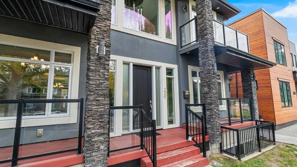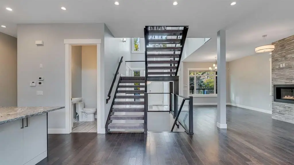 **Masterpiece of Modern Elegance in Parkdale Nestled just steps from the serene Bow River pathways and the lush beauty of Elbow Park, this exquisite residence offers the perfect balance of nature, luxury, and urban convenience. Ideally situated near the Alberta Children’s Hospital, Foothills Hospital, and Market Mall, every essential—whether shopping, recreation, or emergency care—is mere minutes away. Behind the property, tranquil walking and cycling trails invite you to unwind and reconnect with the outdoors. Set on a generous 45-foot lot in Calgary’s highly sought-after inner-city enclave of Parkdale, this stunning stucco home is a showcase of architectural sophistication and exceptional craftsmanship. Spanning over 4,000 sq.ft. of opulent living space, including 2,573sq.ft. above grade, it features five spacious bedrooms and four-and-a-half luxurious baths. From the moment you enter, the home’s grandeur is undeniable—beginning with a soaring 19-foot foyer, beautifully tiled floors, and a dramatic open-riser staircase that exudes modern artistry. Expansive windows flood the open-concept interior with natural light, highlighting fine finishes and elegant design details throughout. The main living area is anchored by a sleek gas fireplace, offering both warmth and sophistication—a perfect setting for relaxed evenings or formal gatherings. The chef-inspired kitchen is a true statement of luxury, boasting a large granite island with breakfast bar, two-tone custom cabinetry, a built-in wine cooler, and an elite JennAir appliance package. French doors lead seamlessly to an oversized patio, ideal for al fresco dining and entertaining, complete with a rough-in BBQ gas line and integrated sound system. A spacious main-floor office or flex room, along with a refined powder room, completes this impressive level. The upper floor unveils a private master retreat that redefines comfort and elegance. Featuring a west-facing balcony, a romantic two-sided fireplace, and a spa-worthy ensuite with a freestanding soaker tub, glass-enclosed shower, and bespoke walk-in closet, this suite is designed for pure relaxation. Two additional bedrooms—one with its own ensuite—plus a stylish full bath provide exceptional accommodation for family or guests. The fully developed lower level extends the home’s luxurious living with a vast recreation and media area, two additional bedrooms, and a full bath. A remarkable highlight is the legal basement suite with in-floor heating and a private entrance, offering both comfort and versatility—ideal for extended family, guests, or potential rental income. Additional features include a central vacuum system, built-in audio throughout all three levels, and advanced exterior security cameras for peace of mind. Every element of this residence has been thoughtfully curated to offer a lifestyle of refined elegance, comfort, and modern sophistication—all within one of Calgary’s most desirable riverside communities.