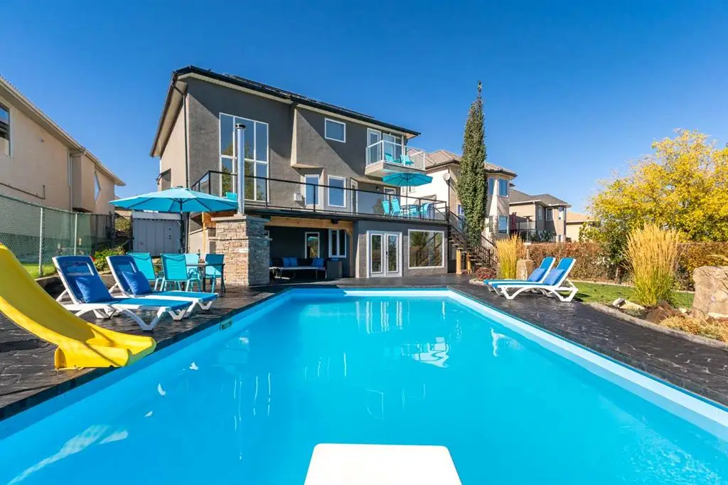 ***OPEN HOUSE - SUNDAY NOVEMBER 2, 1-3PM*** Nestled among the rolling hills of Patterson, this stunning 5-bedroom, 3.5 bath executive home combines elegant design, smart technology, and resort-style amenities—perfect for the modern family. As you enter the grand foyer, you’re greeted by a tranquil spa-inspired water feature, setting the tone for the sophistication that follows. The main living area boasts soaring 17’ ceilings, a cozy gas fireplace, and vinyl plank flooring throughout, creating an airy and inviting atmosphere. The gourmet kitchen is a chef’s dream, featuring granite countertops, a large entertaining island, built-in fridge, and gas range. Step outside to the massive deck, fully updated in 2024, where you can take in sweeping views of Calgary’s skyline. Adding to the functionality of the main floor are a formal dining room, front sitting room/office, and laundry/ mud room area - that leads into the attached oversized double garage. Upstairs, the primary suite offers true luxury—complete with a private balcony, a gorgeous ensuite featuring a Jacuzzi tub, heated floors, double vanity, stand-up shower as well as a generous walk-in closet. Two additional bedrooms, a loft area ideal for a home office, and another full bathroom with heated floors complete the upper floor. The fully finished walkout basement is an entertainer’s dream, featuring a second gas fireplace, two more bedrooms, a full bathroom, and even a kitchen area for hosting epic movie nights or game days with friends and family. The newly built flex/workout room includes rubber flooring and is pre-wired for a hot tub. Step outside to your own backyard paradise—a professionally landscaped oasis designed by an architect, featuring a 16’x32’ heated in-ground pool surrounded by stamped concrete decking, custom lighting controlled by app, and a retractable Elephant Cover for safety and convenience. Enjoy your favorite music indoors and out with the fully integrated sound system across all levels, and relax in the covered outdoor living area with a dual wood/gas fireplace and built-in Weber BBQ. There is also a gas hook up for a fire table. This home is move-in ready with new exterior finishes, solar panels reducing energy costs by approx. $300/month, programmable Gemstone lighting, in-ground irrigation, central A/C, central vac, two furnaces, two hot water tanks, water softener, keyless smart entry on all doors, and a new garage door (2024). Every inch of this home has been thoughtfully curated to deliver comfort, elegance, and entertainment—all with breathtaking views of the Bow River and Calgary’s west side. Move-in ready and built for making memories.
