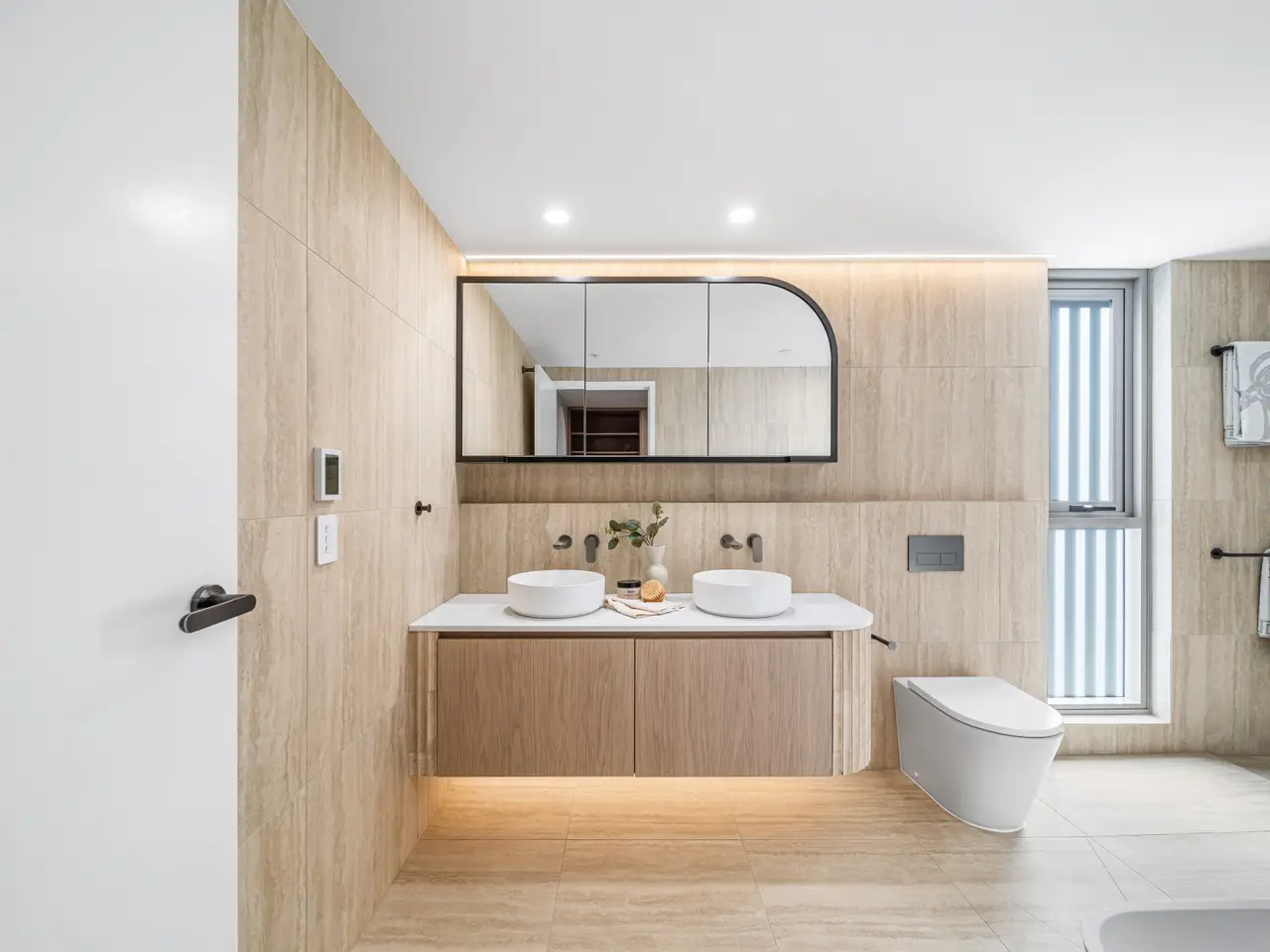 Luxury ensuite with double vanity, decadent bathtub