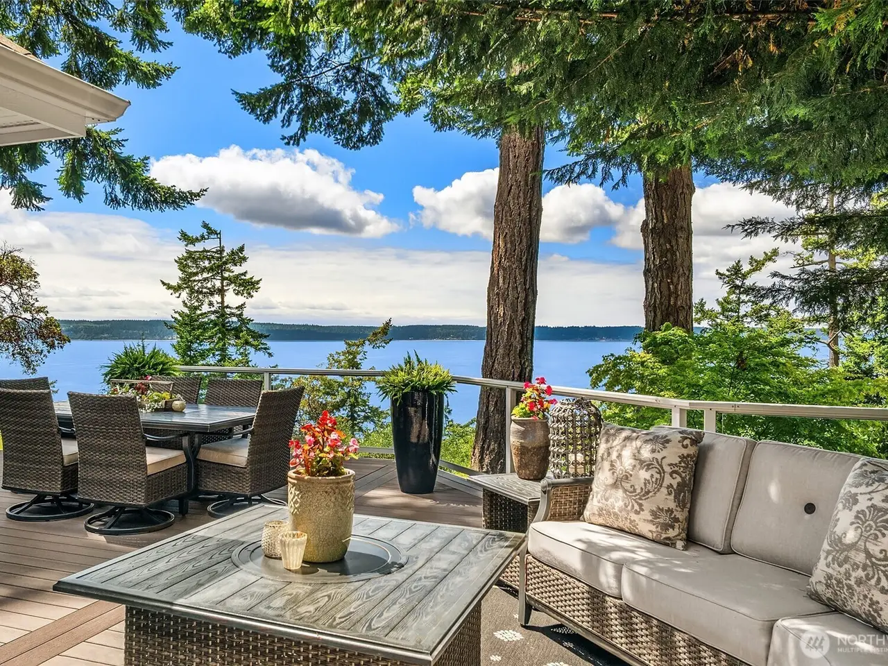 Set among lush gardens and framed by evergreens for privacy, this special home has desirable features around every corner. Understated luxury combined with privacy and unobstructed western views of Saratoga Pass, Olympics, and marine traffic. Designed for single-level living, the interior showcases thoughtfully designed spaces, new Wolf appliances (including micro), panel ready fridge, wine fridge, new roof, detached office, cottage shed, and huge deck together with multiple areas to relax and enjoy the yard. Enjoy the beach access footsteps away. 2 bedrooms + additional guest room. Carport and detached shop complete with a media lounge! Cross the bridge to Camano and feel the retreat vibe of the island-full time or part time. .