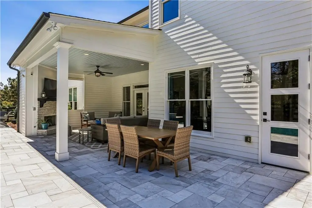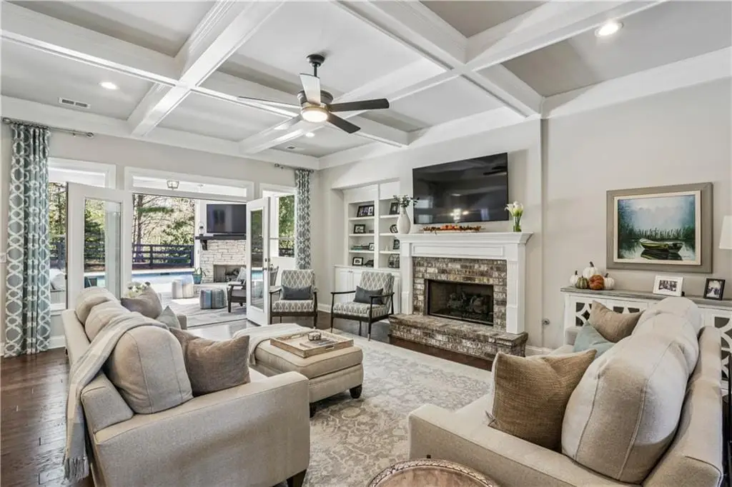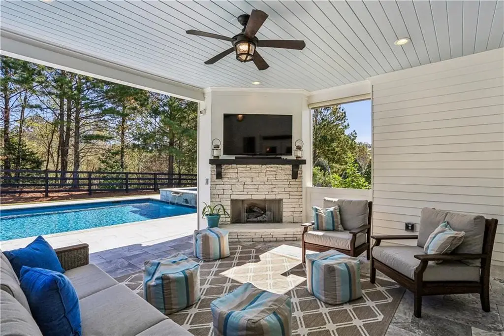 Set on two manicured acres in the prestigious Birmingham Estates community, this striking residence captures refined Southern living with modern flair. Featuring four bedrooms and three-and-a-half baths, the home blends effortless everyday comfort with luxurious outdoor living. From the welcoming front porch to the sparkling sport pool and hot tub surrounded by marble decking, every space is designed for connection, relaxation, and entertaining in style. The open-concept floor plan showcases gleaming hardwood floors, abundant natural light, and thoughtful architectural details throughout. The primary suite on the main level provides a peaceful retreat with a spa-inspired bath and generous walk-in closet. The heart of the home centers around a warm fireside great room and gourmet kitchen - ideal for entertaining or everyday living with an oversized island, custom cabinetry, and a casual dining area overlooking the backyard oasis. Upstairs, you'll find spacious secondary bedrooms and an expansive recreation room, ideal for movie nights, gaming, or guest accommodations. STORAGE IS ABUNDANT throughout, including a three-car garage, an accessible 12' x 14' temperature-controlled storage room above the garage, and well-organized closets. The covered patio with fireplace and TV makes entertaining effortless year-round, while the manicured lawn offers plenty of space for play and outdoor gatherings. Situated in one of Cherokee County’s most desirable neighborhoods known for its large estate lots, scenic setting, and charming mail pavilion, this home combines privacy, style, and convenience, just minutes from Milton, Alpharetta, and Crabapple.