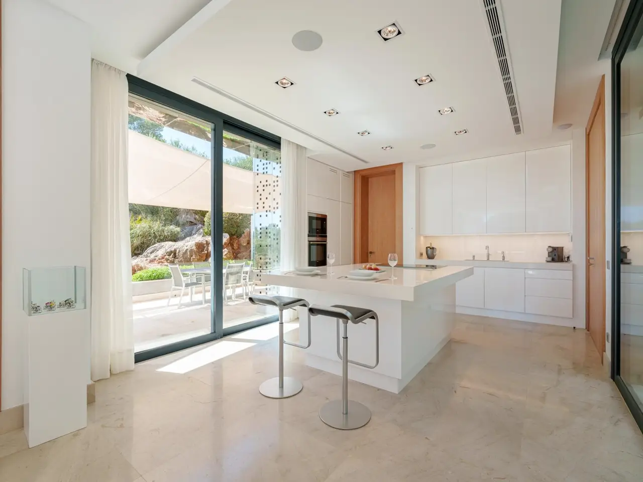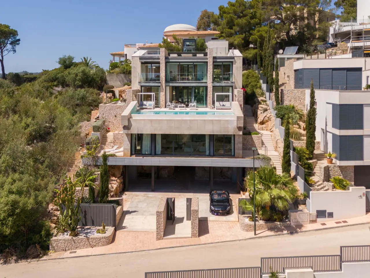 Exceptional and luxurious villa, located in one of the most privileged locations in Mallorca. Set on an elevated plot, it enjoys spectacular views of the sea and the mountains. Its prime location, about 400 meters from the beautiful beach and around 600 meters from the Canyamel golf course, allows easy and quick access to all the necessary services. The center of Palma and the international airport are 50 km away. Built on a plot of approximately 887 m², it is distributed over five floors accessible via a comfortable elevator and interior staircase. Its fabulous design, partly integrated into the rock, with high-quality materials and finishes, makes this villa a true Mediterranean gem. With more than 540 m² of living space, it features five generously sized bedrooms and six well-designed bathrooms to maximize comfort for its residents. Upon entering the villa, you are greeted by a spacious entrance hall that leads to the different areas of the house. The interior design prioritizes natural light and spaciousness. The main living room is generous and seamlessly connects with the dining area and modern kitchen, which is equipped with high-end appliances. From here, you have access to a large terrace with a spectacular swimming pool of approximately 48 m², with a sunbathing area, where you can enjoy wonderful views of the sea and the mountains. The villa has several terraces, all offering magnificent views, as well as the bedrooms. In addition, there are extra rooms that can be adapted to the preferences of the future owners, such as a gym, a home cinema, or any other needs. There is also a generously sized garage for several vehicles. An additional highlight is the underfloor heating and the Smart Home system that controls the lighting, temperature, and security of the house. In summary, this well-located and well-designed villa is ready to meet the needs of discerning buyers seeking a luxurious, spacious, well-equipped home with a touch of distinction. For more information or to arrange a visit, please do not hesitate to contact us.