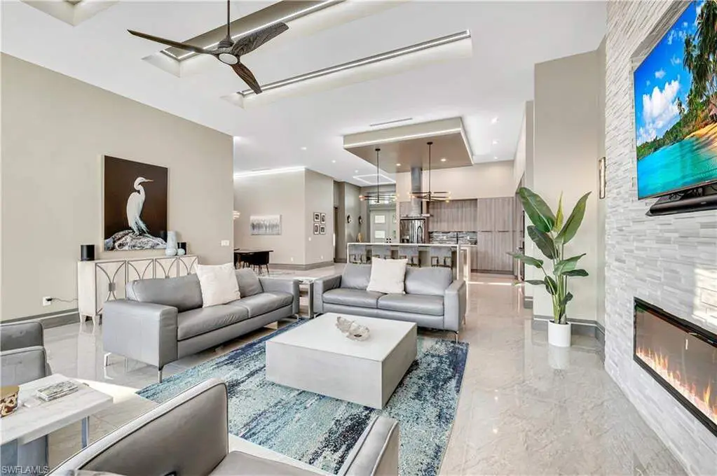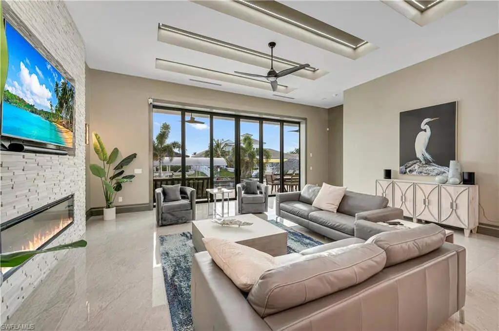 Gulf Access Waterfront Masterpiece in the Esteemed Yacht Club Neighborhood. This exquisite waterfront sanctuary, built in 2021, is a rare blend of modern luxury and coastal charm, offering an unparalleled living experience in the heart of the coveted Yacht Club neighborhood. Designed to impress, this Gulf-access residence boasts an open-concept floor plan, soaring 13-foot coffered ceilings, and an abundance of natural light that accentuates the home's architectural grandeur. With 3 spacious bedrooms plus a den, every space is thoughtfully curated for comfort and style. The primary suite is a private retreat, offering breathtaking water views, a cozy sitting area, and an elegant spa-inspired bath complete with floating vanities, a freestanding soaking tub, and an expansive walk-in shower. Two additional guest bedrooms open directly onto a private sunrise deck, the perfect place to start your day with coffee and serene water views. Designed for the ultimate indoor-outdoor lifestyle, a wall of pocketing glass doors seamlessly connects the living space to an extraordinary outdoor retreat. The expansive lanai, adorned with coffered ceilings and designer lighting, offers a shaded sanctuary for dining and lounging. Beyond, the resort-style pool and spa create a tropical paradise, with custom water features and an extended sun shelf, perfect for soaking up the Florida sunshine. The vast hardscape, featuring beautiful pavers and tropical landscaping, enhances the grandeur of this private waterfront haven. Boating enthusiasts will revel in the newly constructed private dock and boat lift, designed for effortless access to the open waters of the Gulf of Mexico. Whether you're setting sail for a sunset cruise or fishing along the coast, this home offers the ultimate waterfront lifestyle. The spacious dock area is ideal for entertaining, with ample space for seating, water sports, and enjoying the peaceful waterfront ambiance. Additional Highlights: Gourmet kitchen with double waterfall islands, designer lighting & custom cabinetry, expansive lanai with outdoor living & dining space, Southern exposure for year-round sunlight & breathtaking views, meticulously designed outdoor living spaces with premium pavers & lush tropical landscaping. This stunning coastal masterpiece delivers the perfect balance of luxury, comfort, and outdoor living at its finest.
