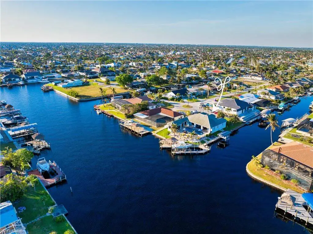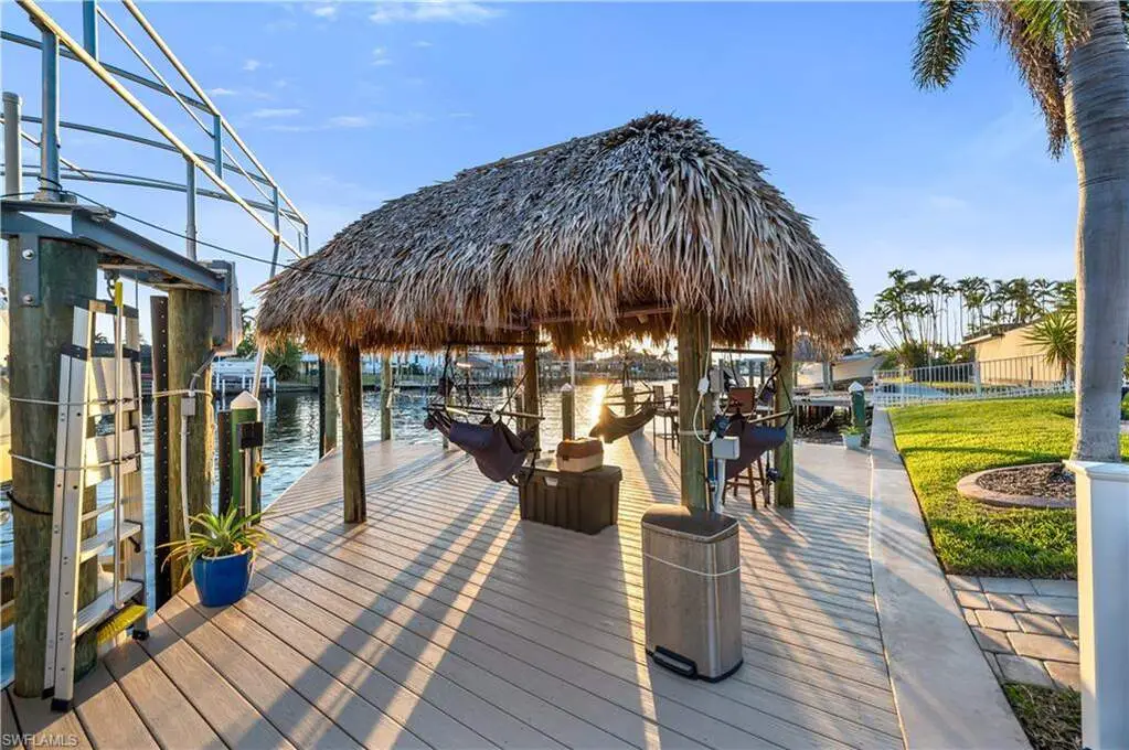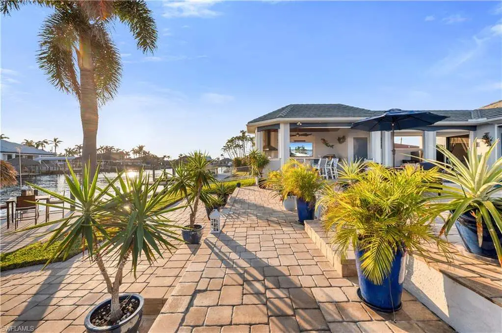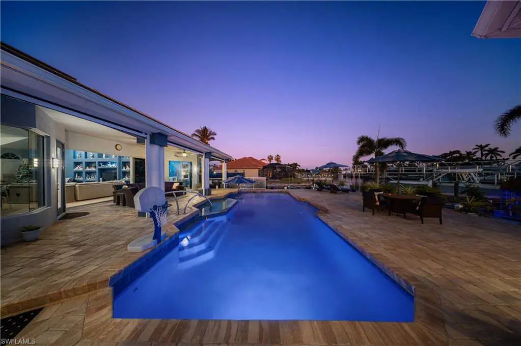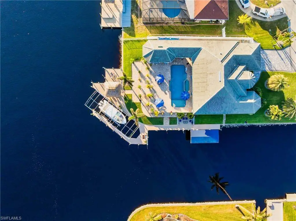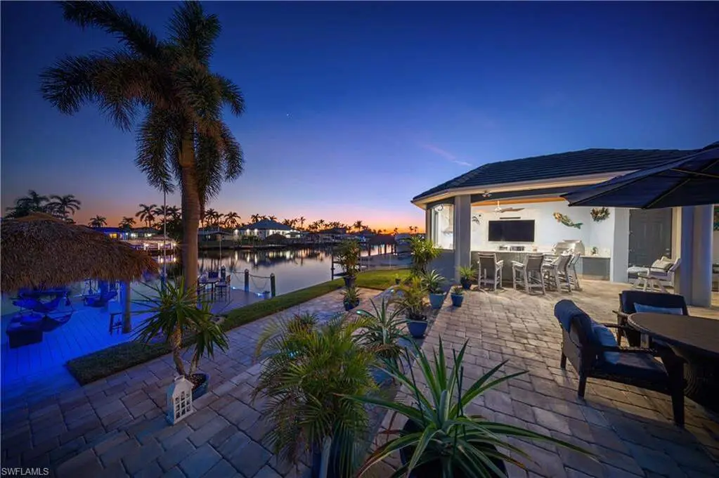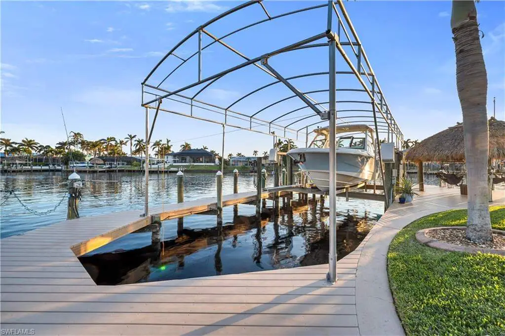 Welcome to 5374 Congo Court, a rare waterfront gem tucked away on a coveted corner lot in Cape Coral's desirable Yacht Club neighborhood. With 235 feet of intersecting canal frontage just steps from the river, this home is a boater's dream. A full wrap-around dock accommodates multiple vessels up to 55 feet and includes jet ski lifts for effortless access to the water. Designed for indoor-outdoor living, the expansive lanai showcases a massive 45-foot pool, outdoor kitchen, and bar - the perfect backdrop for entertaining or quiet relaxation. Inside, soaring 15-foot ceilings and walls of glass flood the great room with natural light and frame panoramic water views from every angle. The 3-bedroom, 3-bath residence is equipped with thoughtful upgrades including a whole-home generator powered by a 500-gallon propane tank. Mature tropical landscaping and swaying coconut palms complete the sense of privacy and paradise. Opportunities like this don't come along often. With motivated sellers and one of the best water lots in the Yacht Club, this home delivers an unbeatable blend of lifestyle, location, and value.
