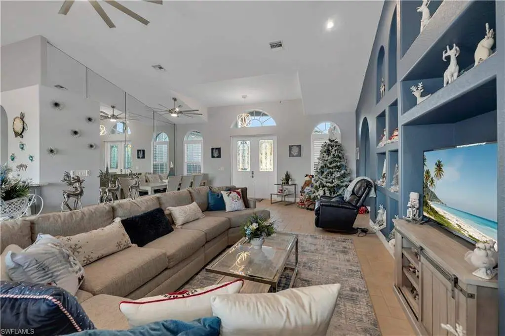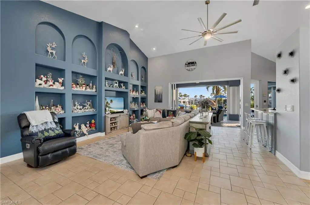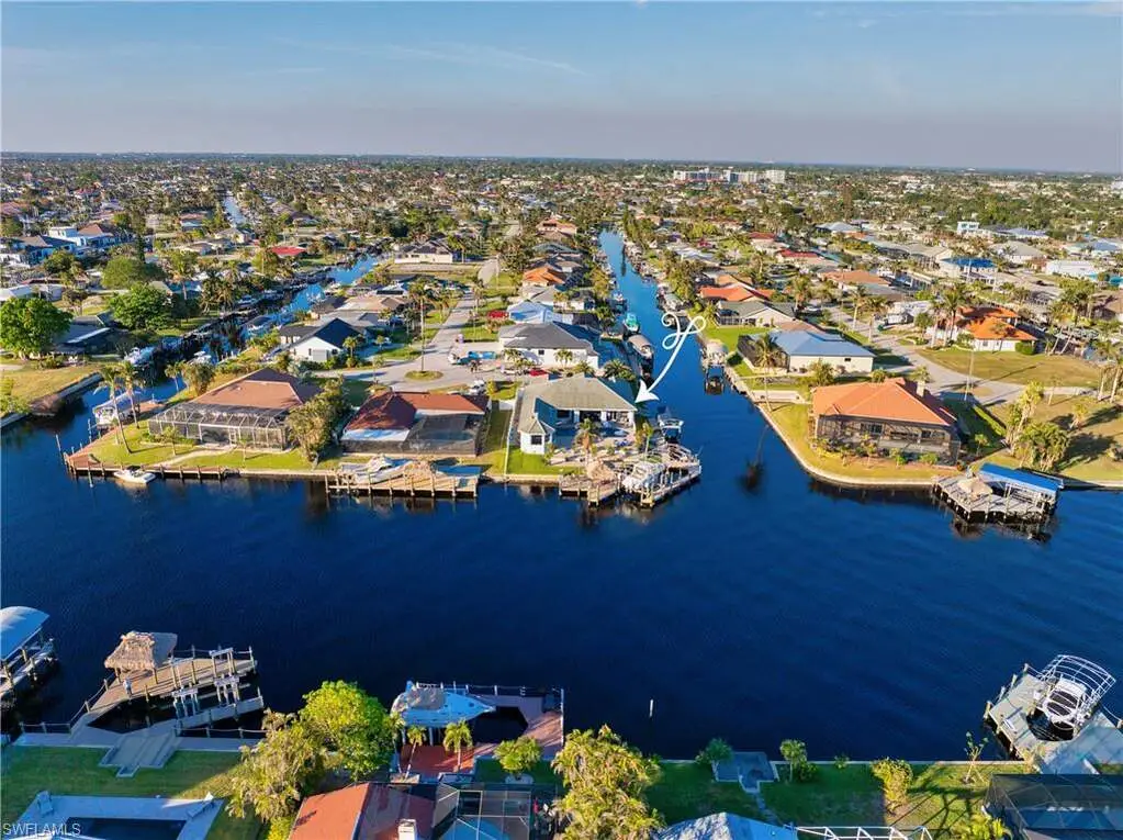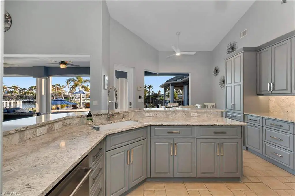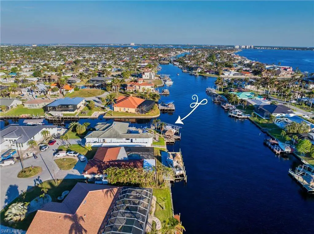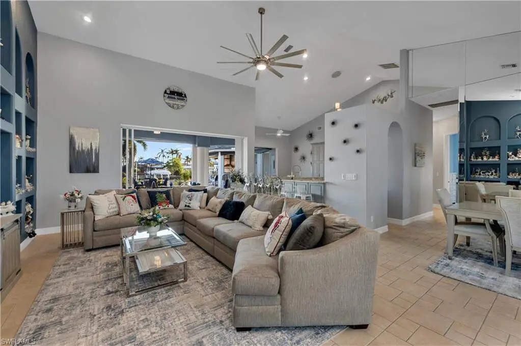Welcome to 5374 Congo Court, a rare waterfront gem tucked away on a coveted corner lot in Cape Coral's desirable Yacht Club neighborhood. With 235 feet of intersecting canal frontage just steps from the river, this home is a boater's dream. A full wrap-around dock accommodates multiple vessels up to 55 feet and includes jet ski lifts for effortless access to the water. Designed for indoor-outdoor living, the expansive lanai showcases a massive 45-foot pool, outdoor kitchen, and bar - the perfect backdrop for entertaining or quiet relaxation. Inside, soaring 15-foot ceilings and walls of glass flood the great room with natural light and frame panoramic water views from every angle. The 3-bedroom, 3-bath residence is equipped with thoughtful upgrades including a whole-home generator powered by a 500-gallon propane tank. Mature tropical landscaping and swaying coconut palms complete the sense of privacy and paradise. Opportunities like this don't come along often. With motivated sellers and one of the best water lots in the Yacht Club, this home delivers an unbeatable blend of lifestyle, location, and value.