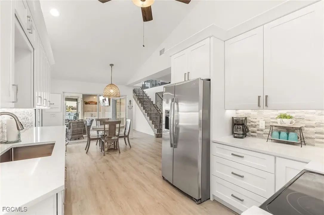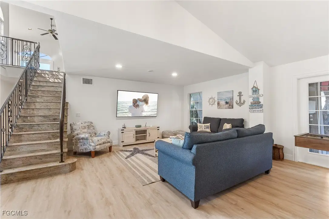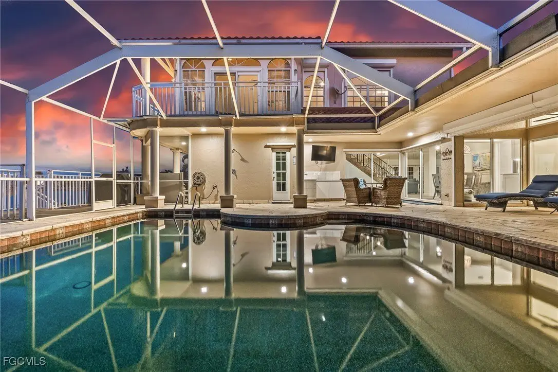 Welcome to a waterfront sanctuary unlike any other-perched on the shores of Lake Finisterre, Cape Coral's largest saltwater lake, offering breathtaking panoramic views and Gulf access for the ultimate Southwest Florida lifestyle! This spacious 3-bedroom, 2.5-bath home offers over 3,700 sq. ft. of indoor living, perfectly designed for those who crave water views, luxury, and functionality. Located in the highly desirable southwest, just minutes from Cape Harbour, this home offers an easy 20-minute boat ride to open water with just one bridge out-ideal for both casual cruisers and serious boaters. What truly sets this property apart are the incredible lake views that greet you from nearly every angle. Whether you're sipping coffee in the breakfast nook, entertaining from the upstairs lounge, or unwinding poolside, the expansive water vistas and vibrant skies deliver unforgettable sunrises and sunsets daily. Step inside to find an open, elegant layout with a formal sitting room, a large dining area, and a gourmet kitchen with solid-surface counters and stainless-steel appliances-all oriented to maximize lakefront sightlines. The primary suite is a true retreat with French doors leading to the pool, dual vanities, a soaking tub, walk-in closets, and a private water closet. Upstairs, an enormous bonus room/lounge offers endless possibilities: currently used as an entertainment hub complete with bar and poker table, it also features elevated panoramic views of the lake that make it the perfect space for relaxing or hosting guests. Want more? This space could easily be converted into a show-stopping master suite. Outside, enjoy the new 2023 dock with a tiki hut, perfect for fishing, lounging, or launching into the Gulf. The home has also undergone major upgrades including: - New roof (2023) - Fully remodeled lower level with updated plumbing and electrical - New flooring throughout Whether you're looking for a full-time residence, a vacation getaway, or an income property, this one-of-a-kind lakefront stunner delivers it all-with unmatched views, Gulf access, and prime location in one of Cape Coral's most sought-after waterfront communities.