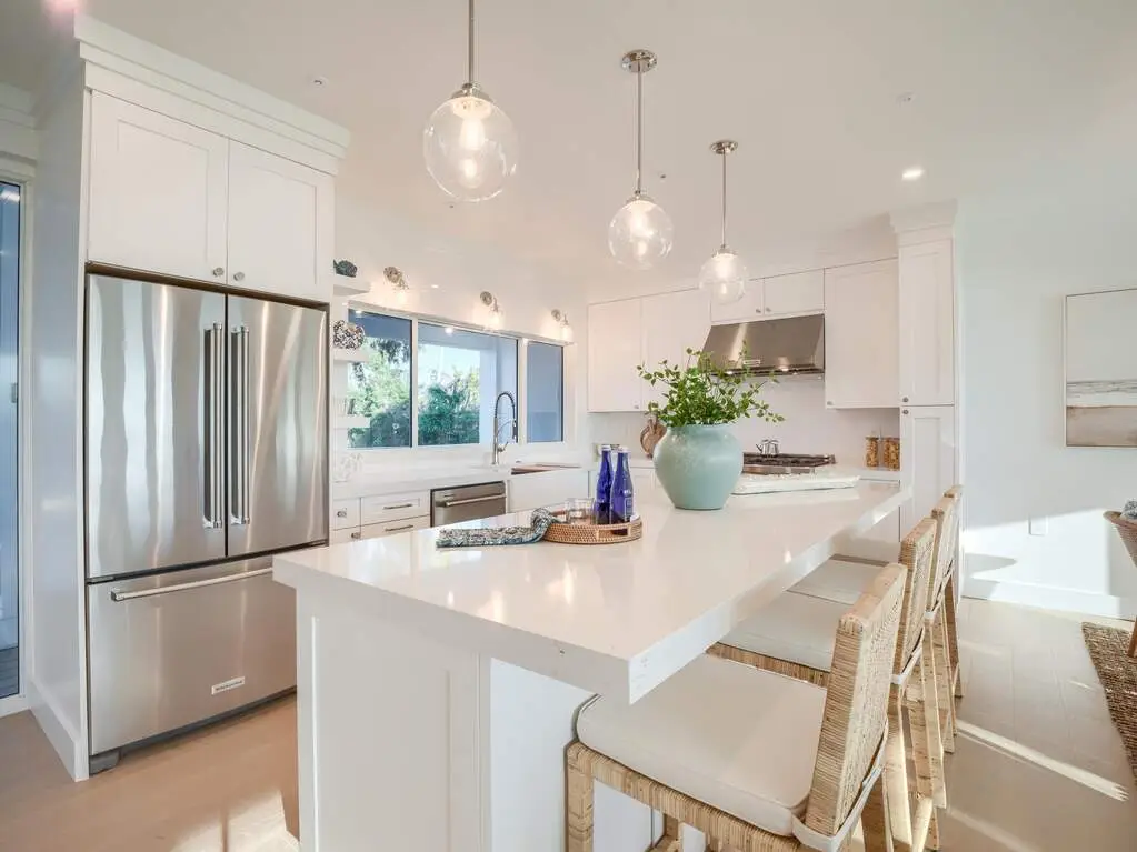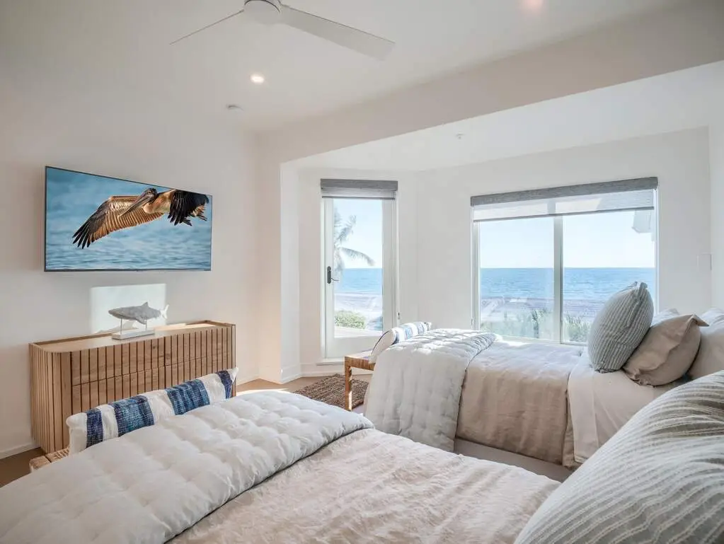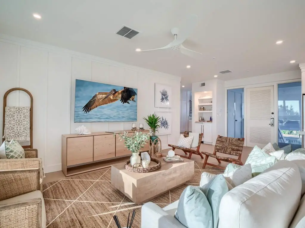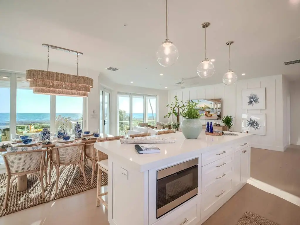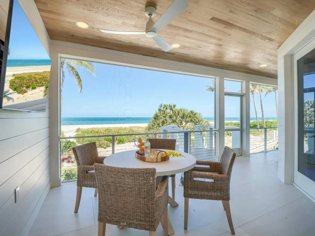 Enjoy immaculate Gulf and sunset views from this beautifully elevated and fully furnished 3-bedroom + entertainment room, 3.5-bath Sandrift residence located within the exclusive gates of South Seas Resort. Thoughtfully reimagined and masterfully upgraded, this home offers the perfect blend of luxury, comfort, and privacy in a low-density community setting. Step inside to discover a professionally designed coastal interior featuring wide-plank white oak flooring, custom board and batten accents, and carefully curated furnishings that create a refined, relaxed ambiance. The chef's kitchen is a showstopper, equipped with premium appliances, 2" thick Quartz countertops, handcrafted wood cabinetry, a wine/beverage bar, and an oversized farmhouse sink-highlighted by gas cooking for the culinary enthusiast. Each of the three spacious bedrooms is en-suite and offers stunning Gulf-front views, creating serene retreats for family and guests alike. The 2024 renovation brought significant upgrades throughout the home, including new plumbing, electrical, windows, decking, and a new roof-ensuring peace of mind and modern convenience. Outdoor living is elevated with multiple decks including a screened-in patio, a sunrise balcony with partial bay views, and an expansive upper sunset deck featuring panoramic Gulf views and sleek no-show cable railings. Additional highlights include a climate-controlled storage/entertainment room, a two-car climate-controlled garage with epoxy flooring, a separate back garage for beach gear, and a refreshing outdoor shower. This exceptional property offers the rare opportunity to enjoy resort-style living with all the comforts of a private home.