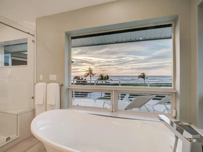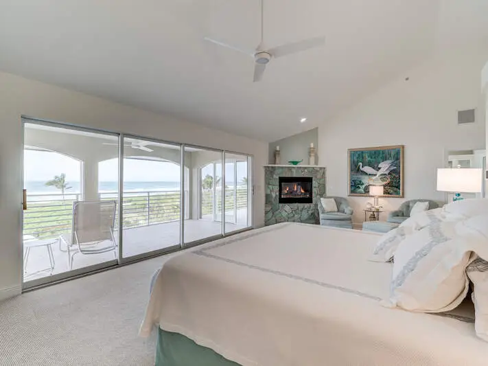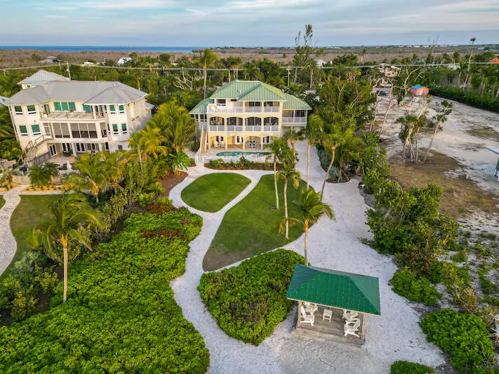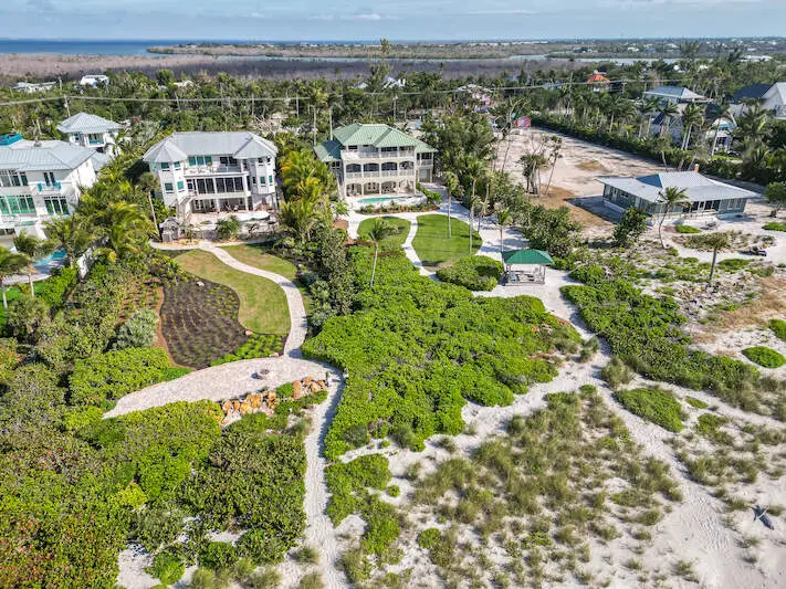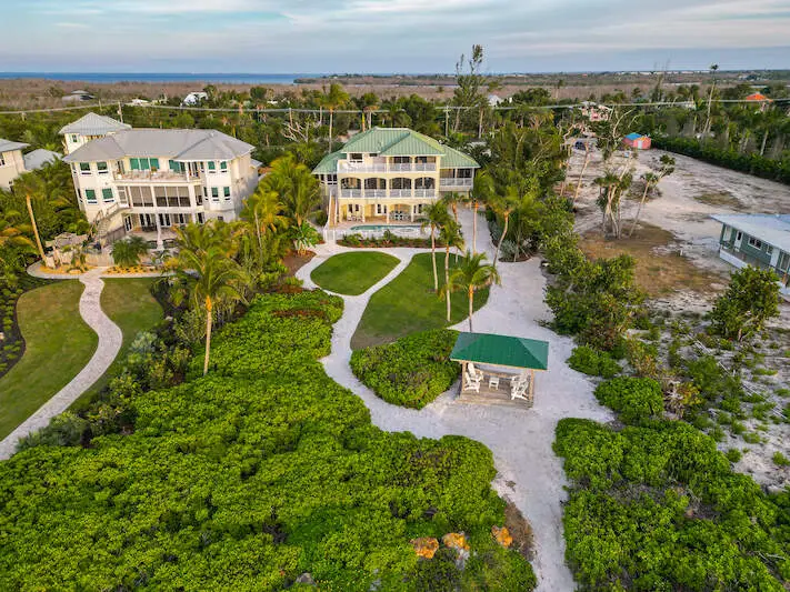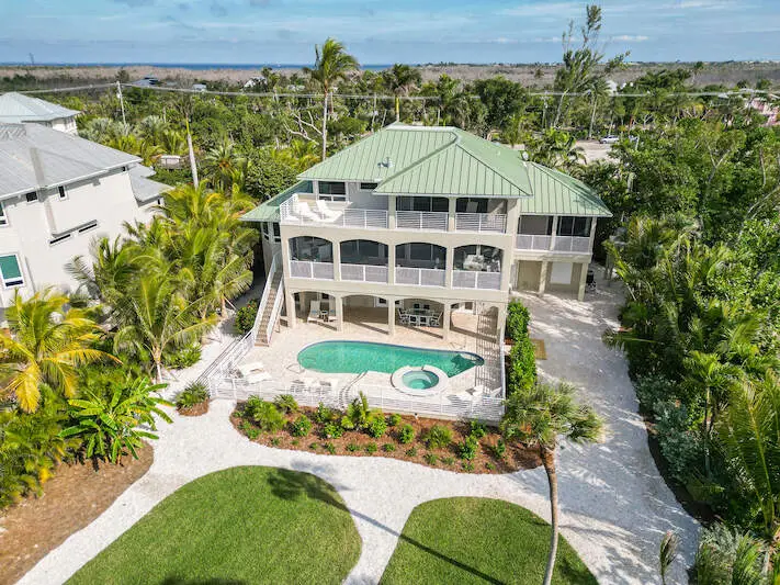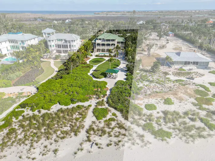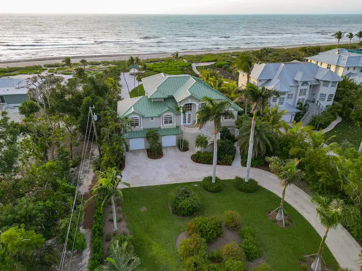 SOUTH HAVEN - Experience unparalleled tropical luxury at South Haven, a meticulously designed concrete piling home that seamlessly blends elegance and functionality. Recent enhancements include a fully remodeled kitchen, dining room, and primary bath, along with a 2023 roof replacement and premium finishes throughout. The main level features a sunlit foyer, guest accommodations, and dual guest retreats in a private wing. The redesigned kitchen boasts modern amenities and a bright dining nook, while the living room offers sweeping coastal views. Upstairs, the owner's suite captivates with Gulf of Mexico vistas, a stone-clad electric fireplace, and sophisticated woven flooring. The ground level includes a spacious garage and versatile spaces, all accessible via an elevator serving every level. Outside, Royal Palms frame the exquisitely designed pool area, complete with a sunbathing platform, covered dining, and lounging spaces. A beachside yard features a private cabana, landscaped greens, and a serene walkway to the shore. South Haven is the ultimate coastal retreat, offering exceptional craftsmanship, lush surroundings, and unforgettable sunsets.