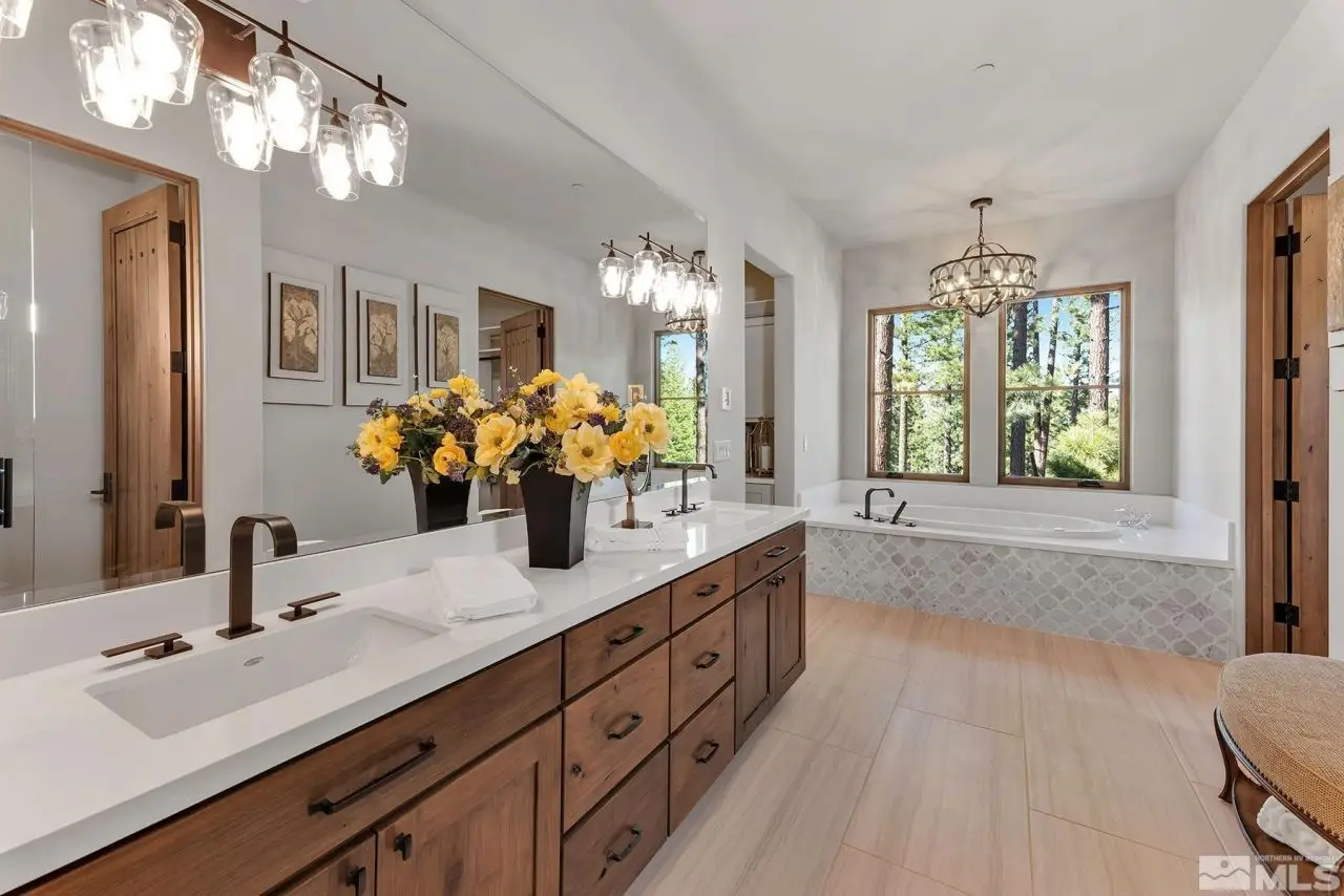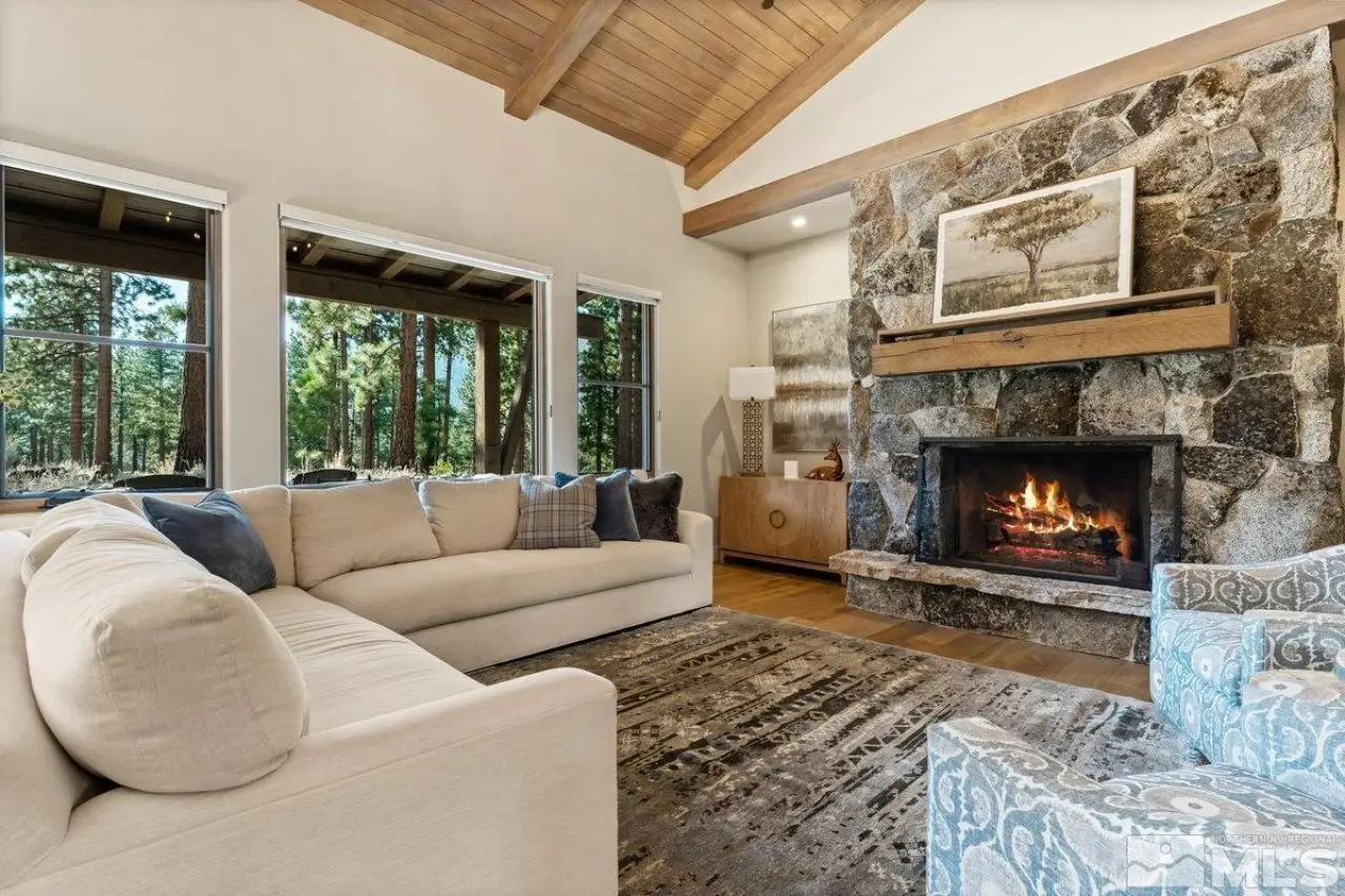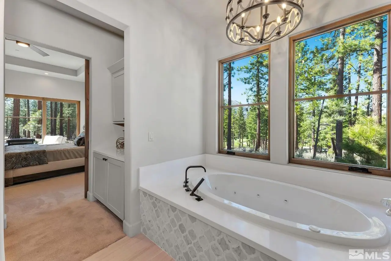 Immerse yourself in the tranquility of nature as you breathe in the crisp mountain air, serenade your senses with the melodies of chirping birds, and witness the graceful deer welcoming you to Clear Creek Tahoe - a haven where natural beauty meets luxury. Nestled amidst towering pines, this charming mountain cottage has sweeping views of the third fairway, as well as the lustrous green on Nevada's premier private golf course. Designed as a single-story custom retreat, this home offers a warm, inviting atmosphere and an open floor plan perfect for hosting gatherings with loved ones or enjoying sunset views from the expansive covered deck. The heart of the home, the Great Room, seamlessly integrates a spacious dining area and a well-appointed kitchen. A towering stone gas fireplace anchors the room, reaching up to a tongue & groove wooden ceiling adorned with elegant beams. The kitchen features a generous island, exquisite cabinetry, a wine refrigerator, and even a Wi-Fi-enabled oven for modern convenience. Equipped with a Lutron Smart Home system, the residence allows effortless control of lighting and HVAC settings via your smartphone. A dedicated office space, complete with barn doors and shutters for privacy and its own HVAC zone, makes remote work a pleasure. The grand master suite boasts a stunning granite fireplace, a private deck perfect for morning coffee amidst vibrant scenery, and a luxurious bathroom offering a garden tub, steam shower, heated floors, and a spacious walk-in closet. Two additional large en-suite bedrooms on the south side of the home offer privacy and panoramic views of the golf course, completing this exceptional retreat. The home has been lovingly cared for and maintained while the owners were building a larger home within the community. The exterior was re-stained in 2023. Clear Creek Tahoe is more than a community?it's a lifestyle. Anchored by Nevada's #1 ranked residential golf course, it offers an unparalleled blend of mountain and lake amenities. The private Lake & Ski House provides 180 feet of sandy beach, water sports, and a shuttle service to Heavenly Ski Resort. Summit Camp is a hub for recreation with a pool, water slide, hot tub, tennis, pickleball, and bocce. At the heart of it all, the spacious Clubhouse features a year-round wellness and fitness center, ensuring adventure and relaxation in every season.